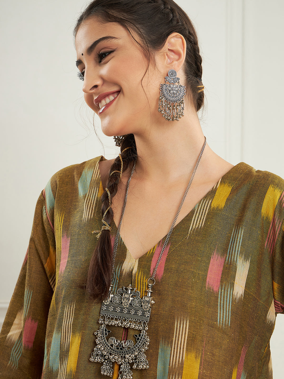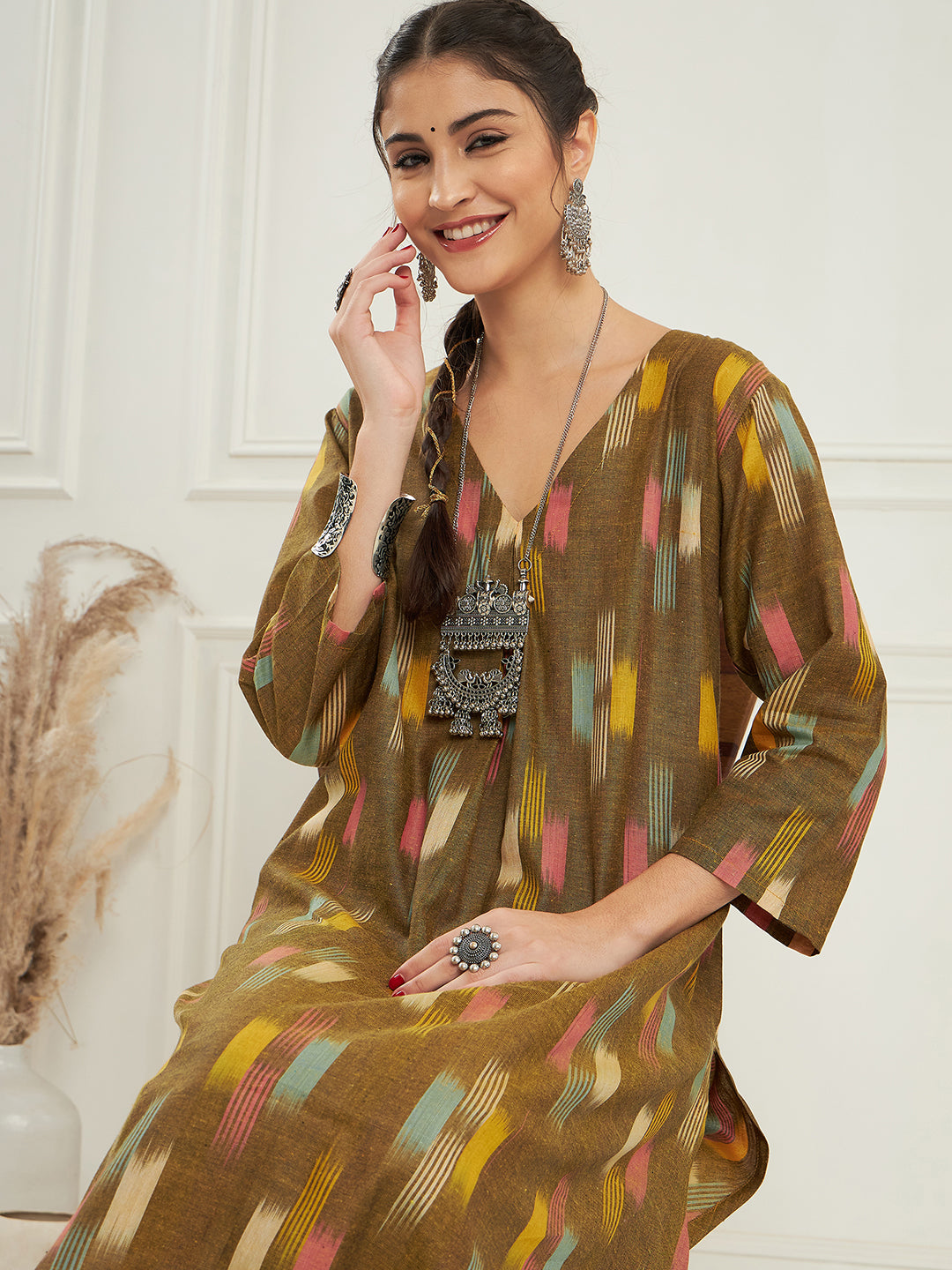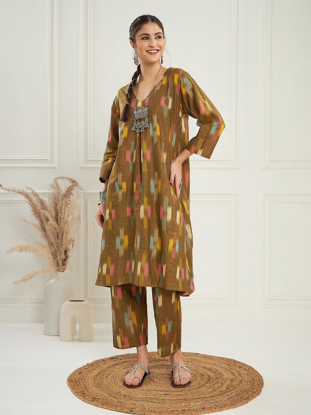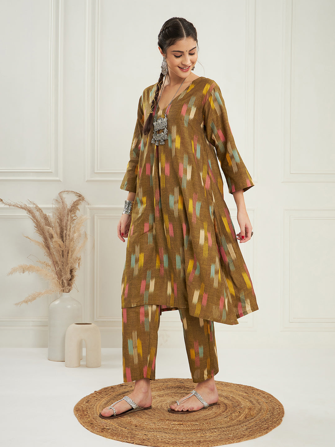 The Set is crafted from best of Indian fabrics. Style it with Oxidised jewelery and juttis and you are good to go for any outing Hand Wash Only Seperately.