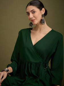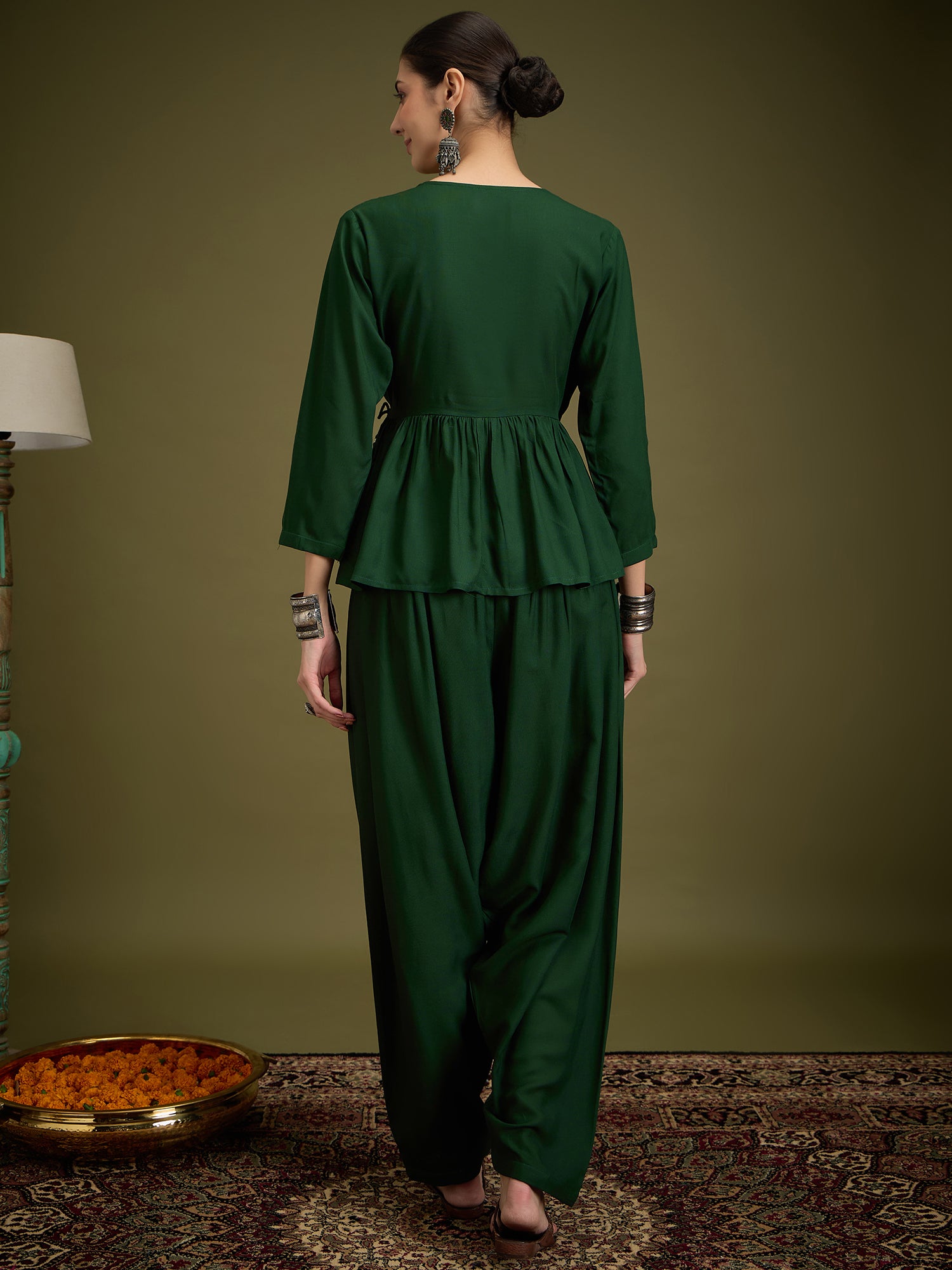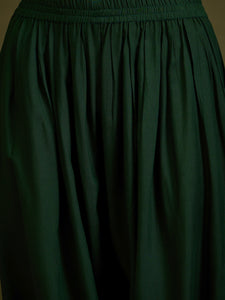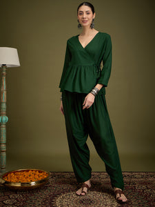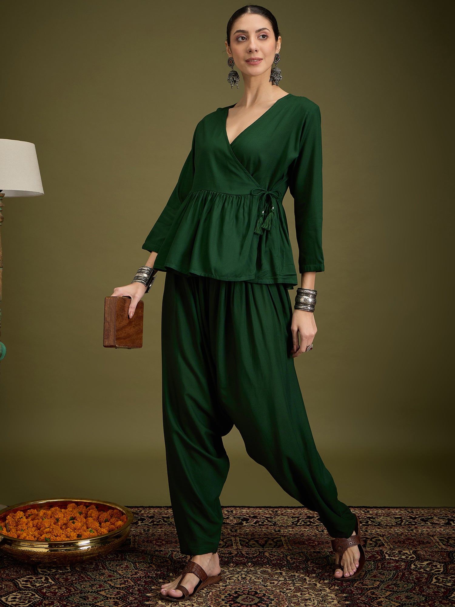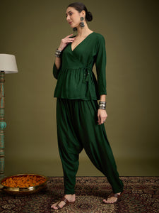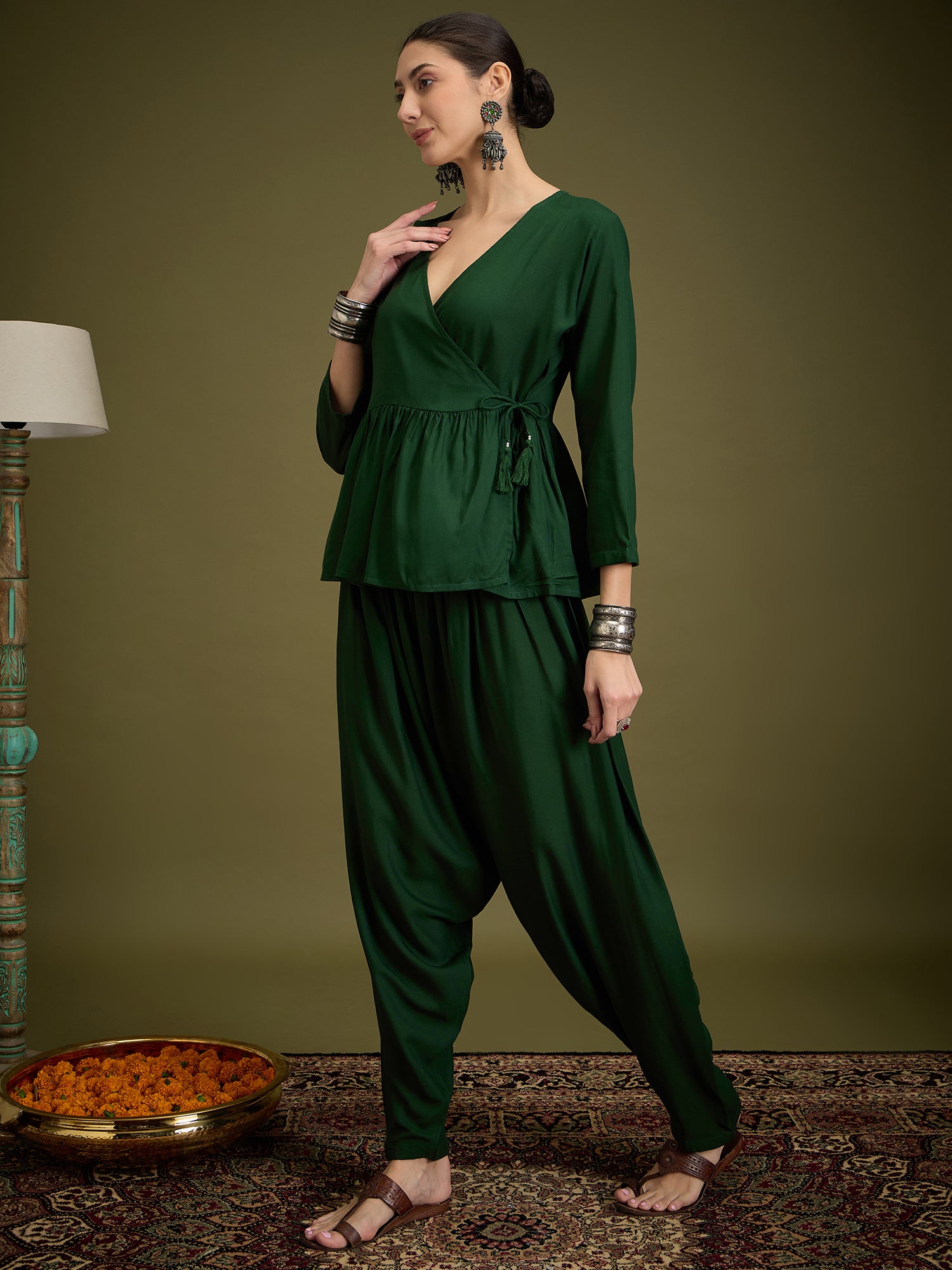 The Dark Green Angrakha Dhoti Coord Set is a sophisticated ensemble that combines traditional Indian elements with modern style. The rich dark green color adds a sense of elegance and depth, making this set a versatile choice for a variety of occasions