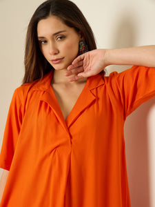 This orange kurta set features a structured collar neckline for a contemporary ethnic look. Made from comfortable fabric, it offers a polished silhouette suitable for casual functions, office-friendly ethnic wear, or daytime events.