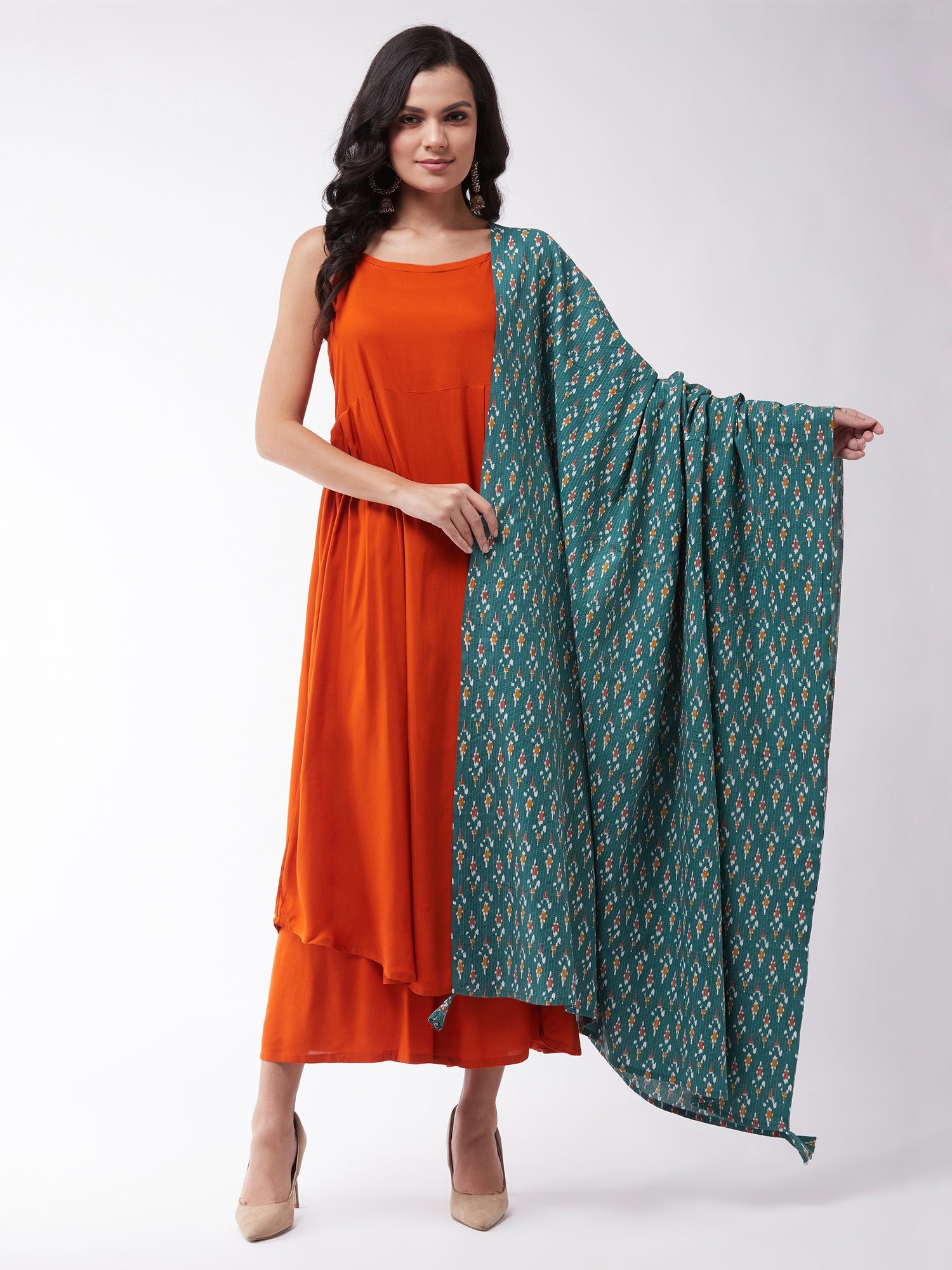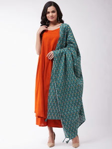 Orange solid Kurta with Trousers with Green Kantha ikkat dupatta with dupatta, Anarkali shape, Empire style, Round neck, short shoulder straps, Calf length with flared hem, Viscose rayon machine weave fabric.