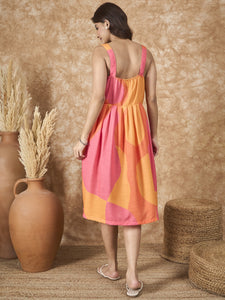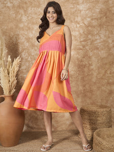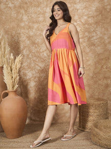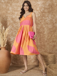 A beautiful peach-orange dress with a sweetheart neckline and bold print. It’s perfect for summer events, offering a blend of elegance and fun.