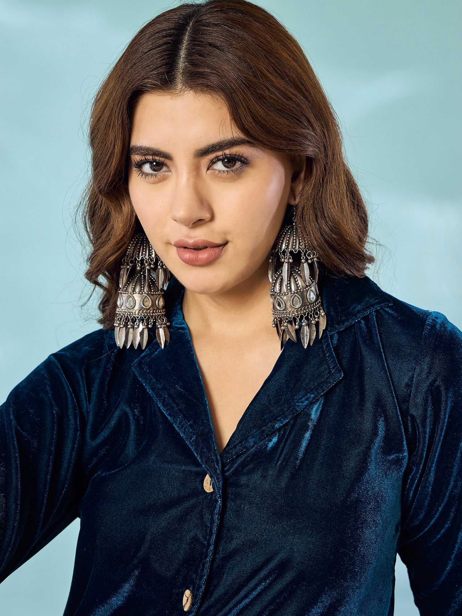 This peacock teal velvet blazer Co-Ord set pairs a tailored blazer with matching trousers, offering a coordinated and polished look. The luxurious fabric comfort and style for various occasions.