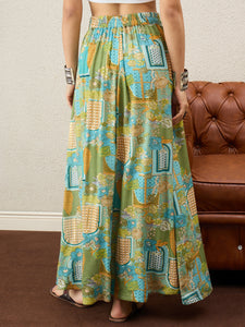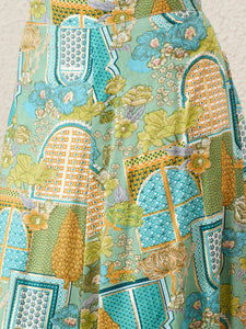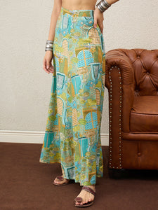 Brighten up your wardrobe with this pear-green A-line skirt featuring a charming window print. The soft fabric drapes beautifully, offering a breezy and flattering silhouette perfect for casual outings or festive gatherings.