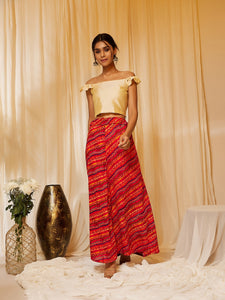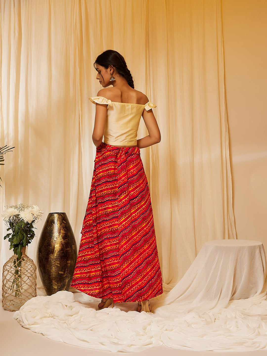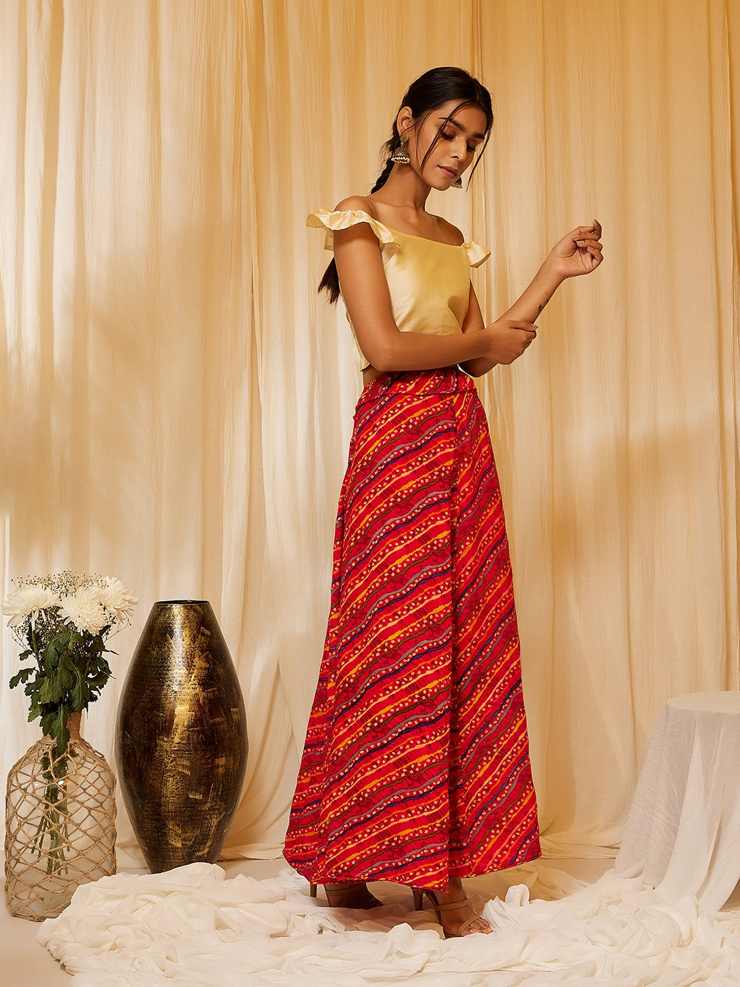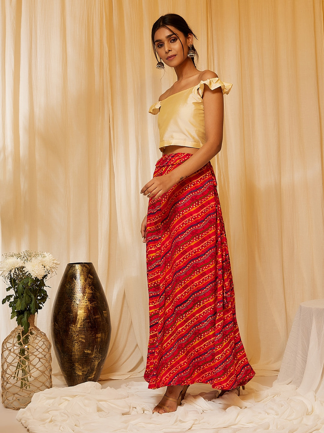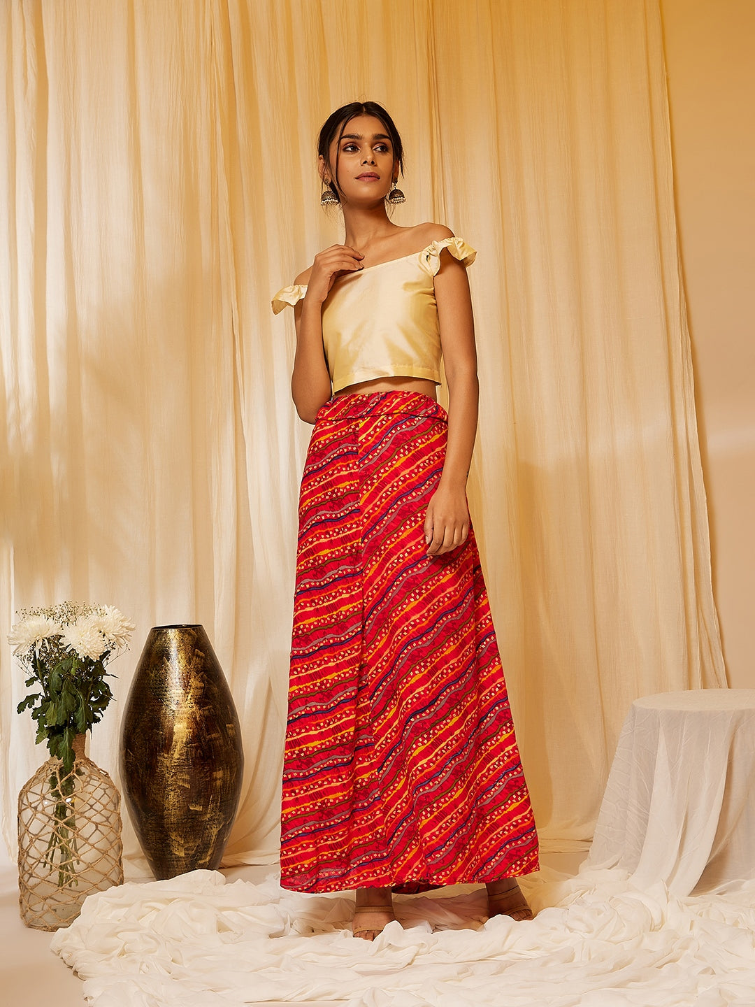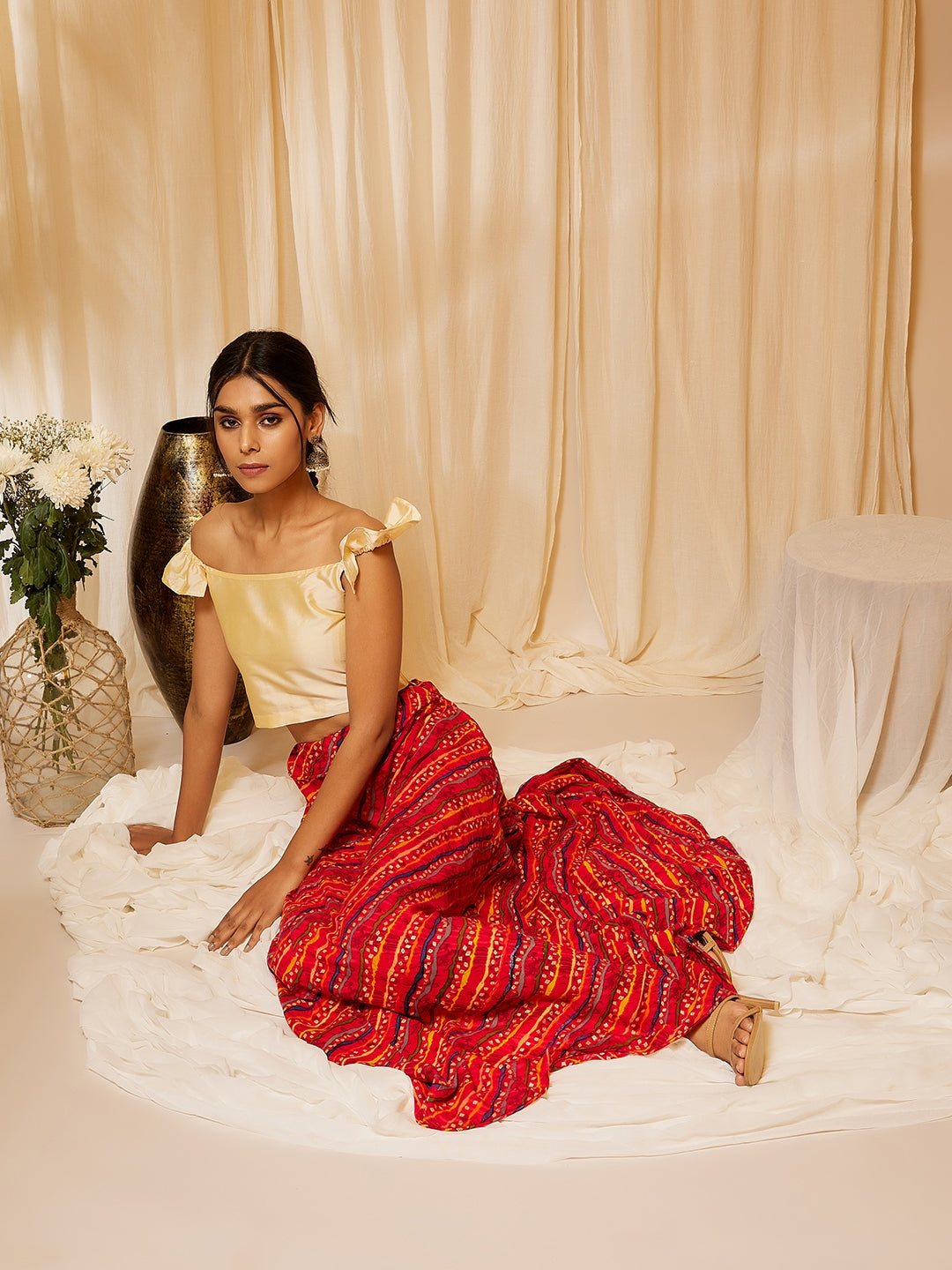 Layer on your beauty by grabbing this catchy skirt set . The beautiful top adds to the elegant skirt making this an ideal garment for every formal or semi-formal occasion. Fabric Used : Cotton Silk for the Top and Rayon for the Skirt Dry Clean Recommended