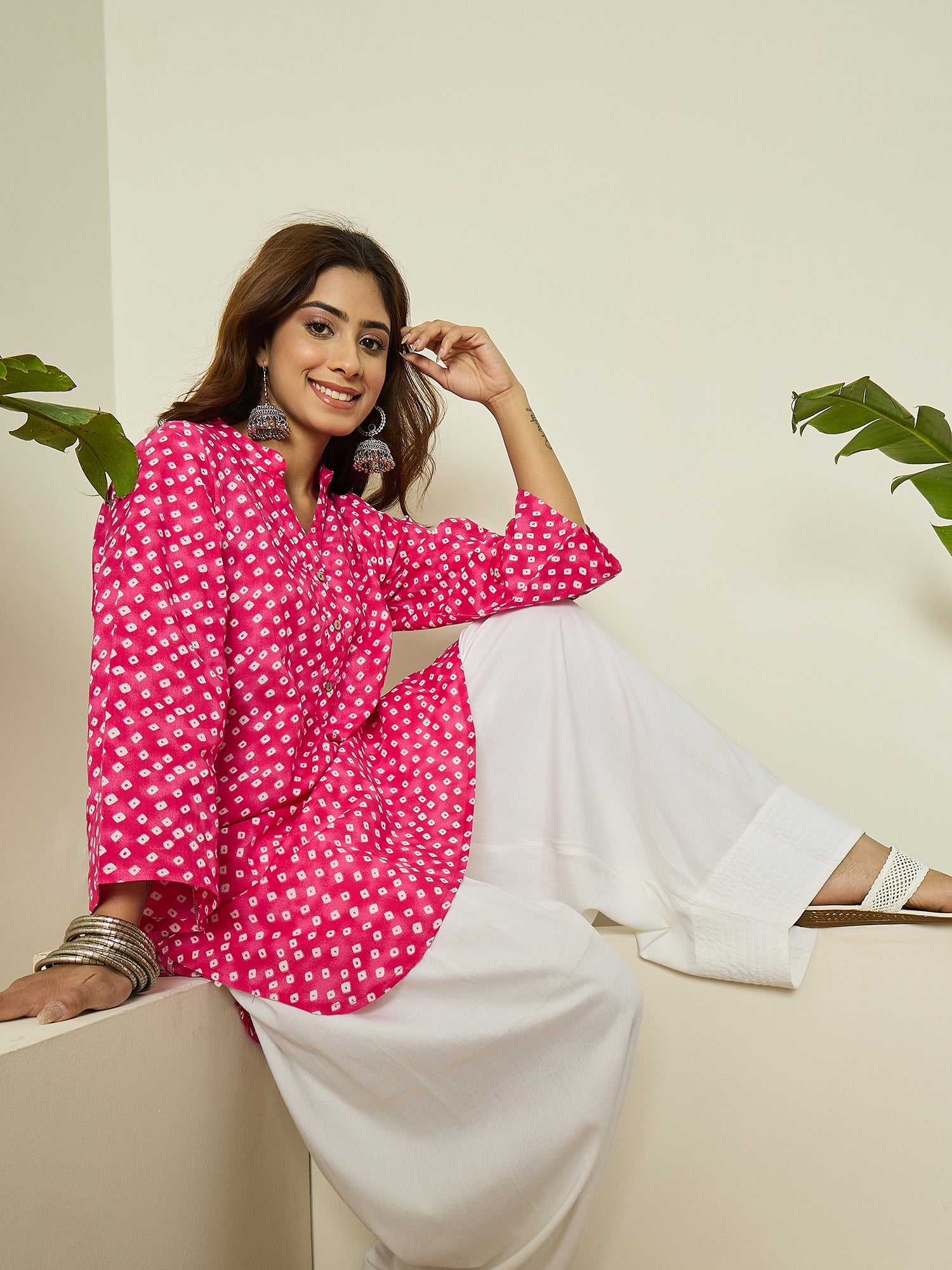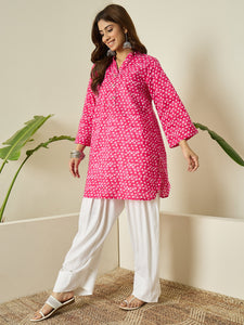 Pink kurta with subtle white dot print matched with white salwar. Lightweight fabric and easy silhouette provide comfort, making it perfect for casual wear and daytime outings.