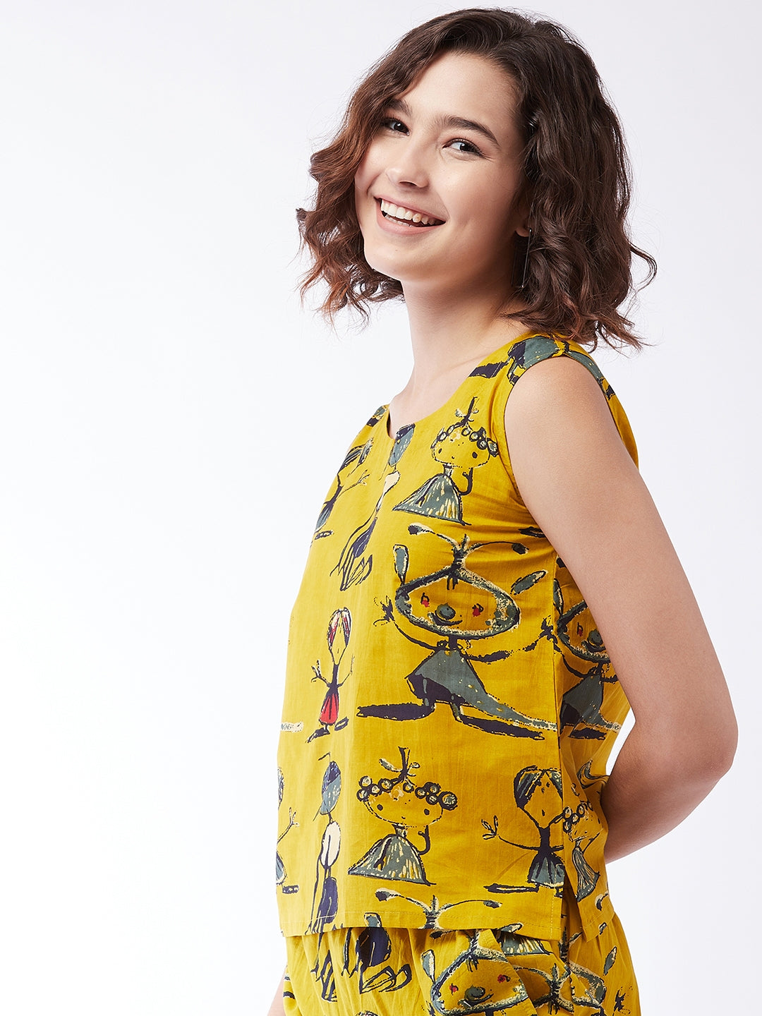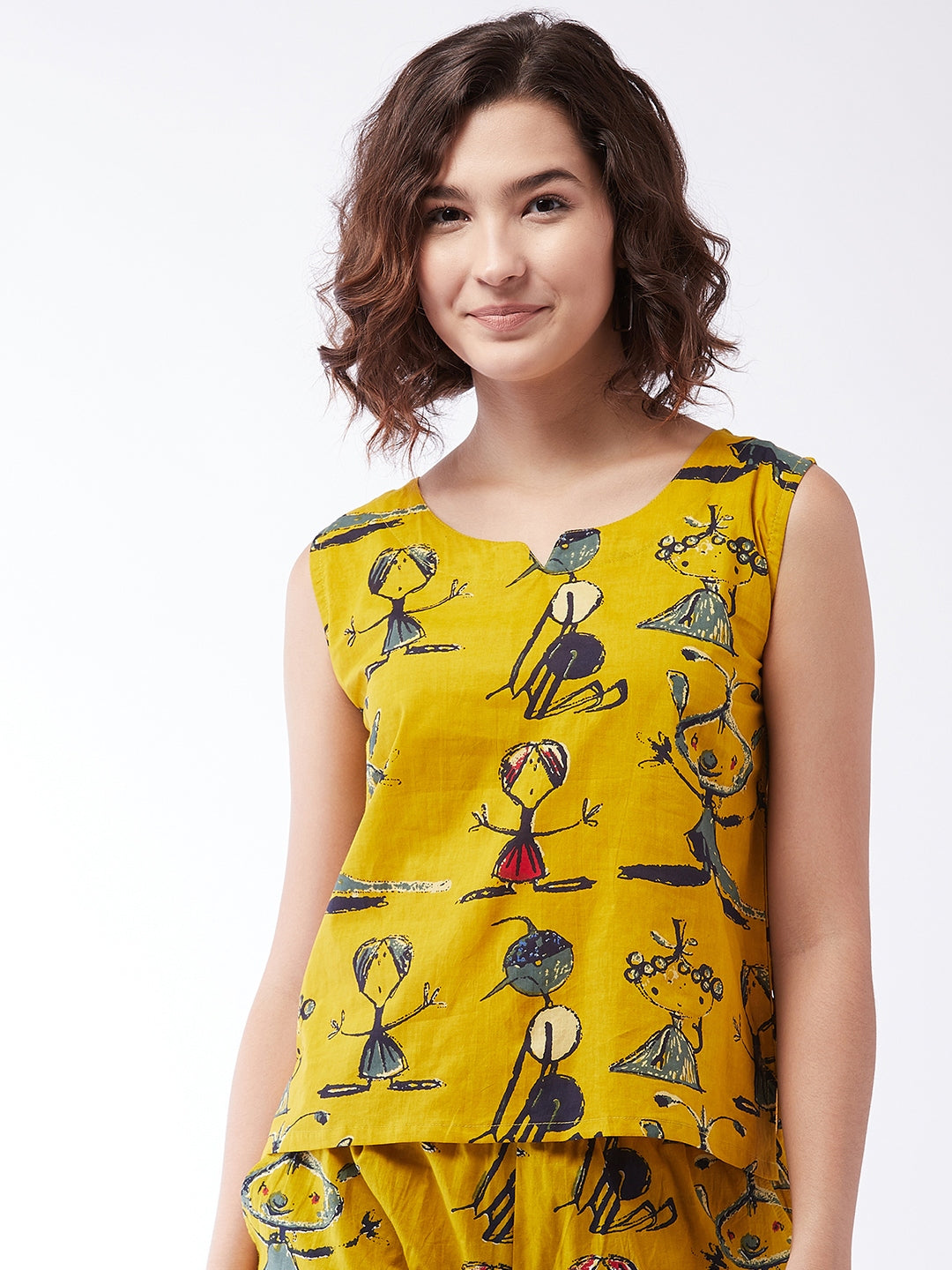 Time to revive the innocent beauty of your girl with this pretty mustard-coloured quirky printed top. This comfortable cotton top features a stylish V-neck and sleeveless adhere.