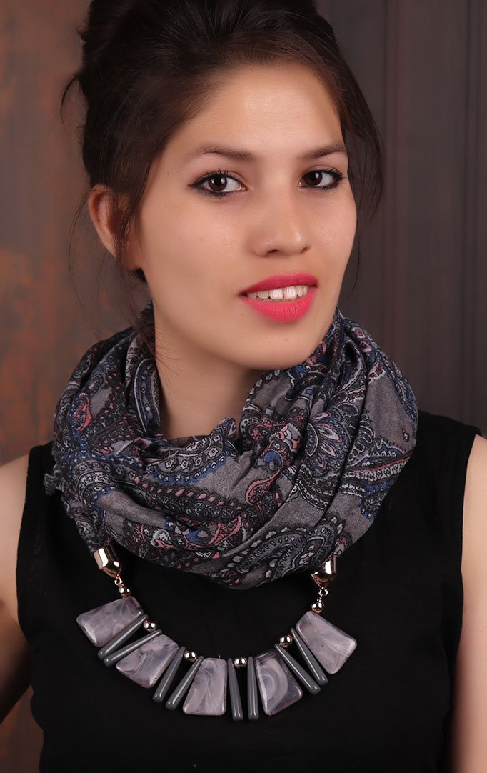 Exuding an undeniable charm is this scarf necklace with an interplay of prints. The scarf has beautiful paisley print all over in black and lilac, which is attached to translucent rectangular statement beaded necklace. It is attractive, stylish and looks perfect with any outfit in black.