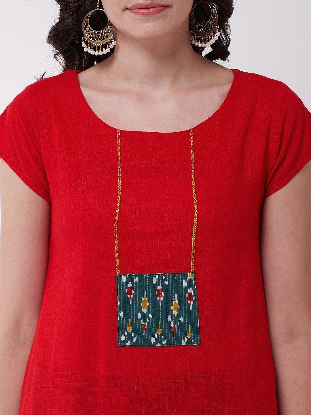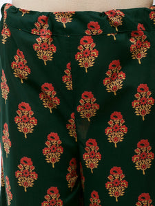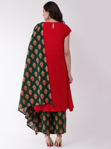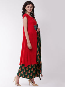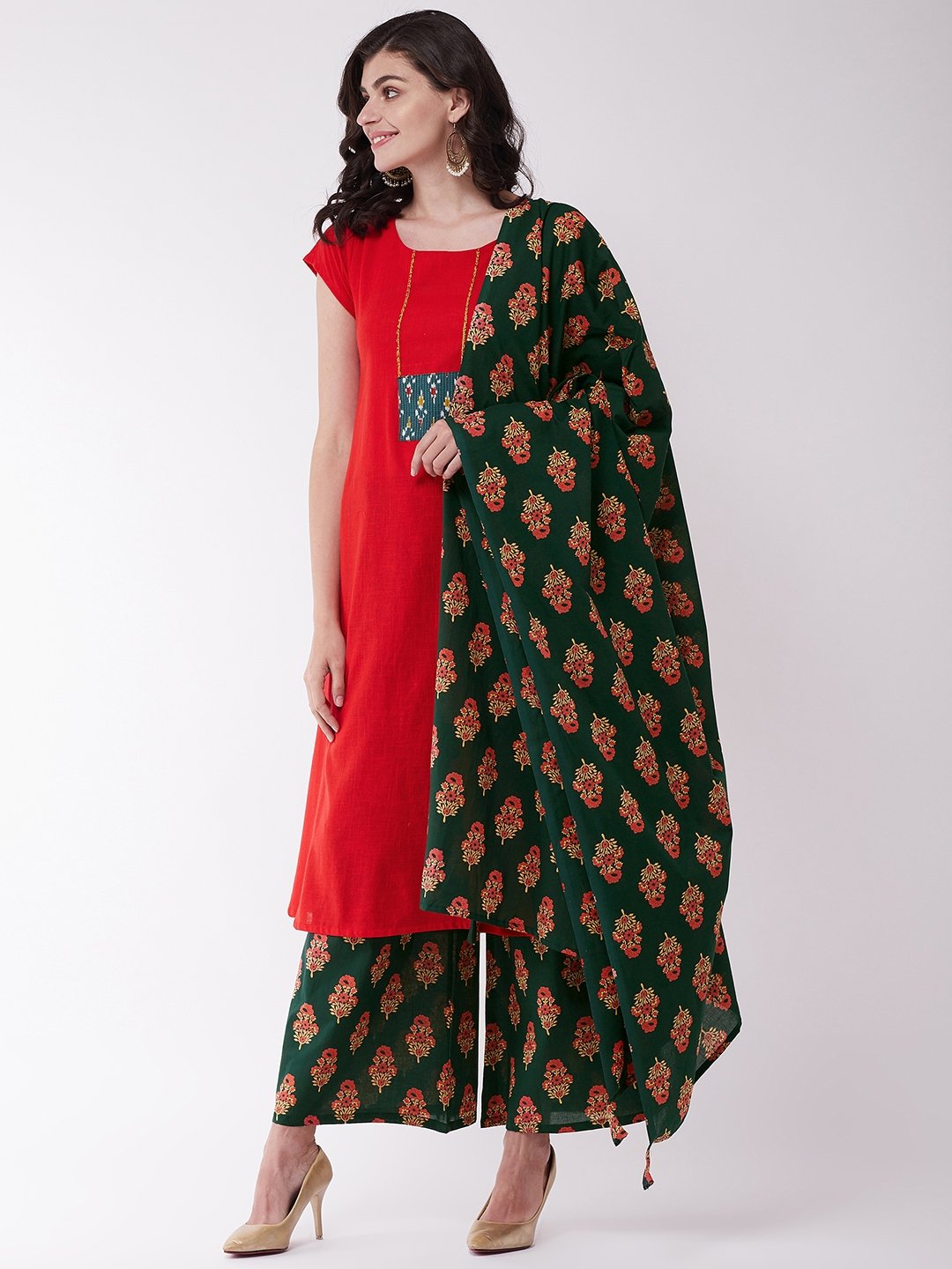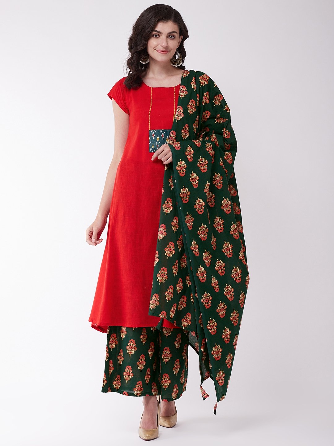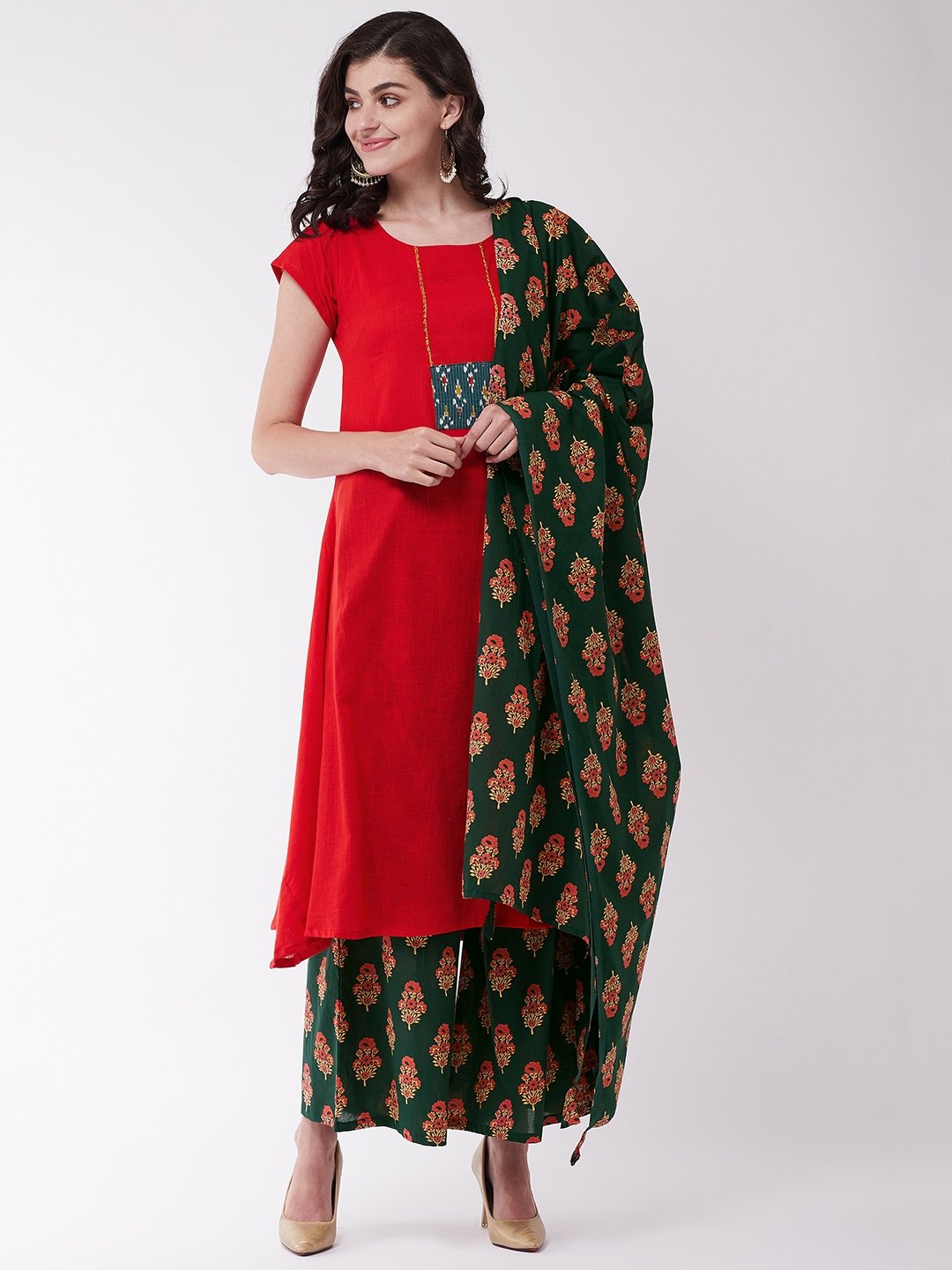 Inspire your inner fashionista by adding this red and green coloured Patola kurta palazzo set to your collection. Antique jewellery and juttis will enhance the overall look.