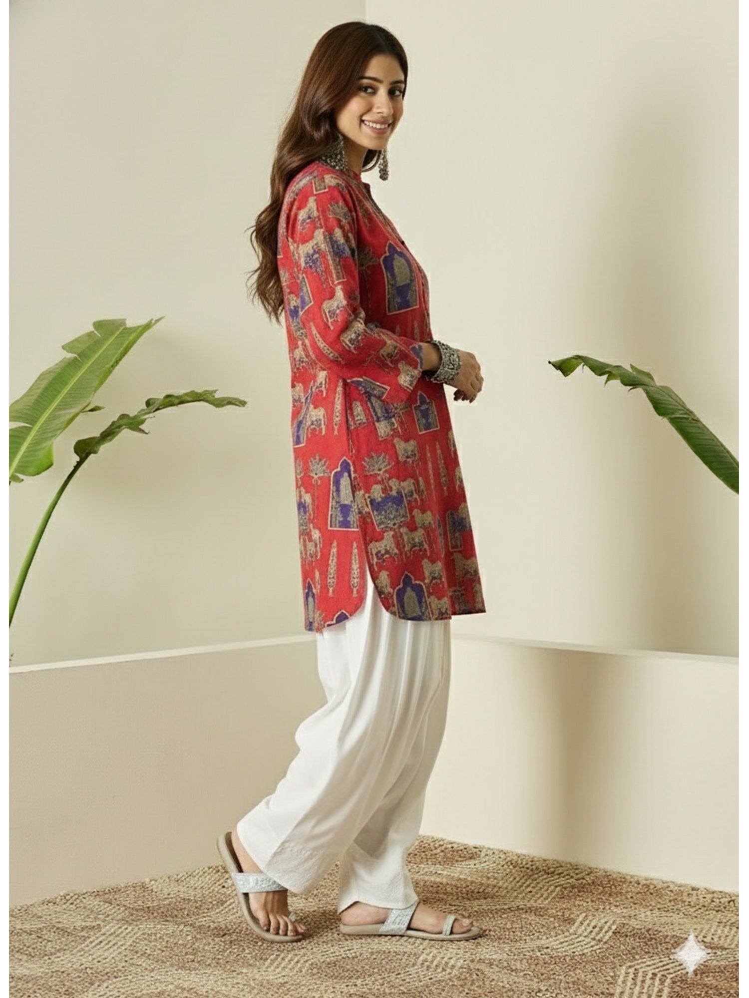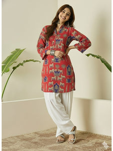 Red and Blue animal print kurta paired with white salwar, featuring a bold ethnic design, comfortable fabric, and stylish silhouette, ideal for festive wear and everyday traditional occasions.