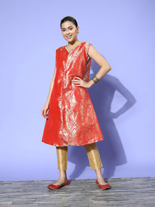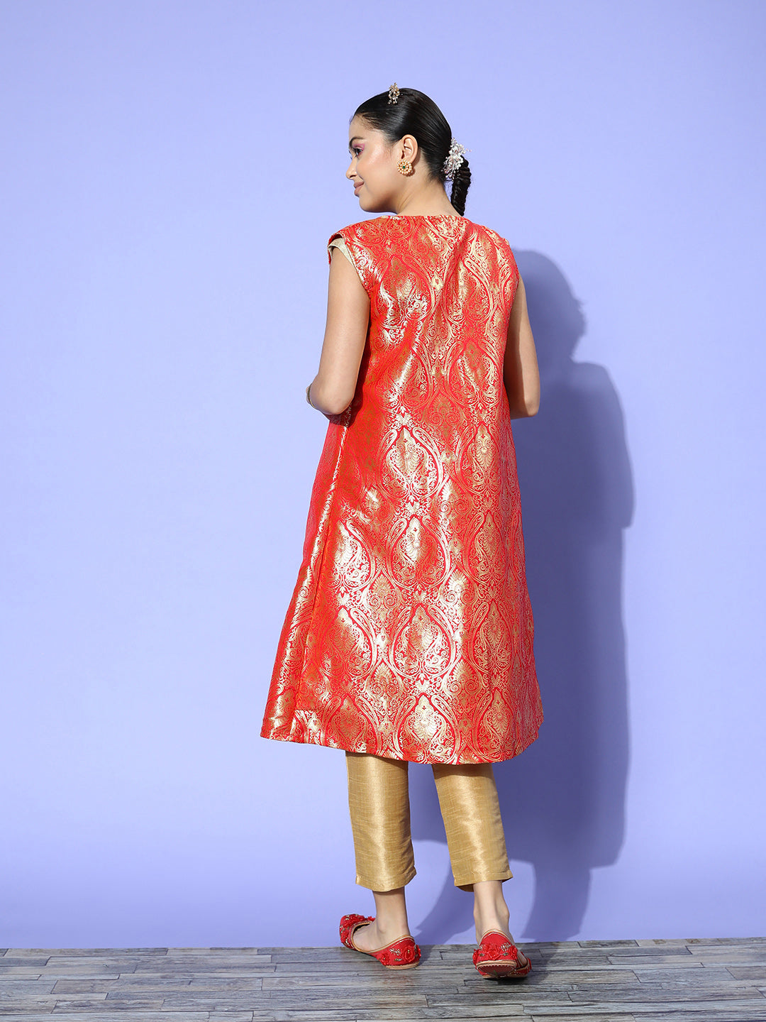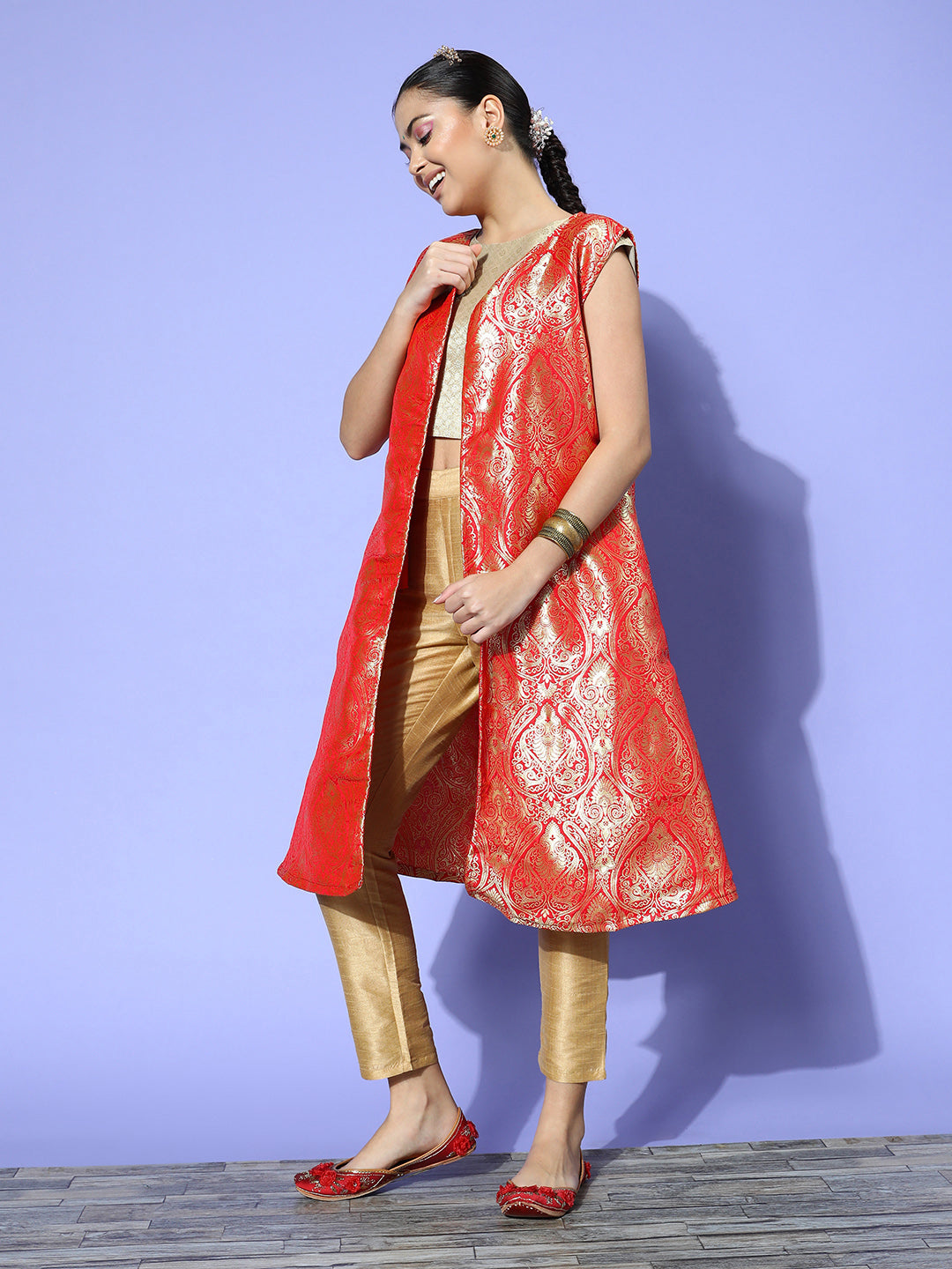 Slay your winter style by donning this chic jacket. It is exquisitely designed with a self-design print and sleeveless design for the perfect fit.