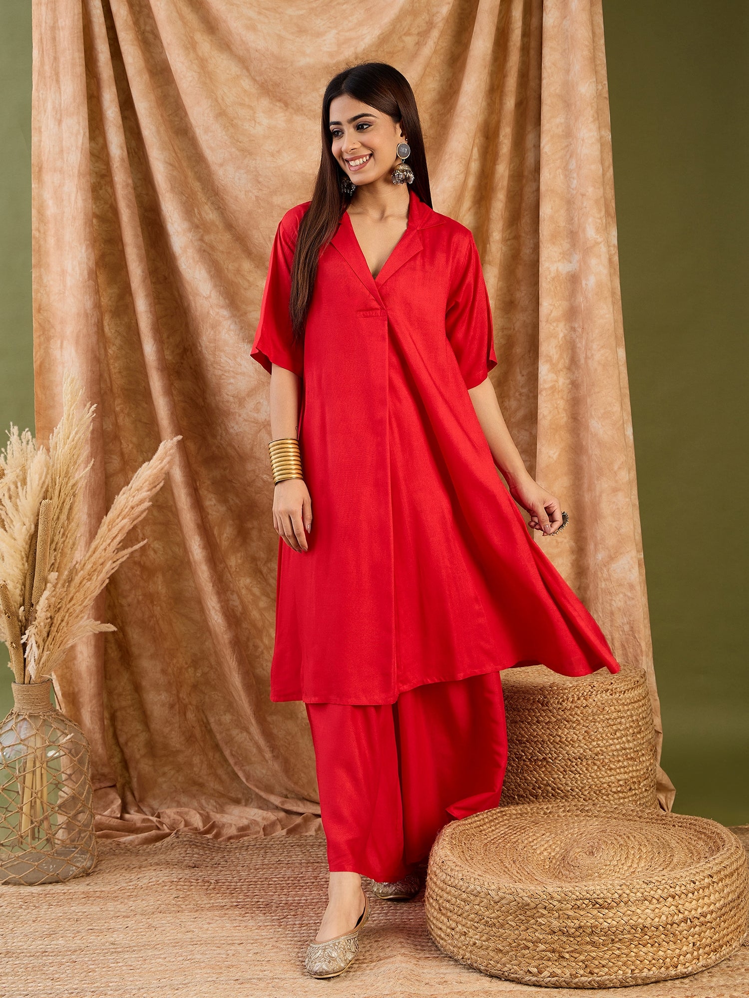 Make a graceful style statement with this Red Collar Neck Kurta Set. Made from comfortable, breathable fabric, the kurta showcases a stylish collar neckline that blends traditional charm with modern design.