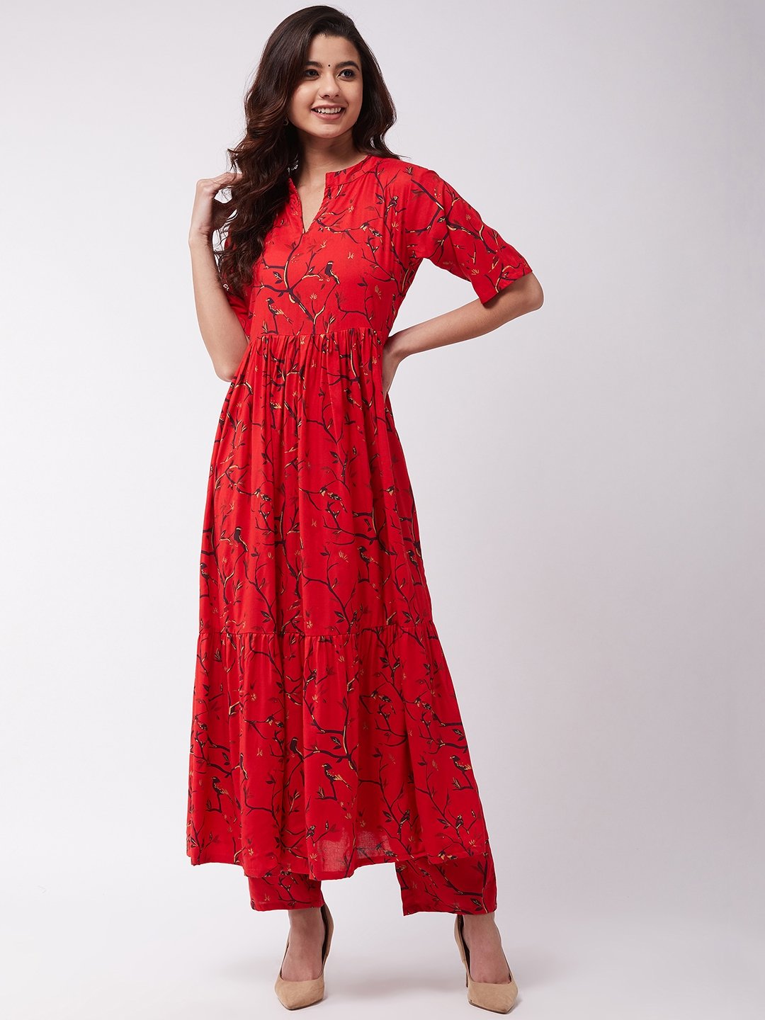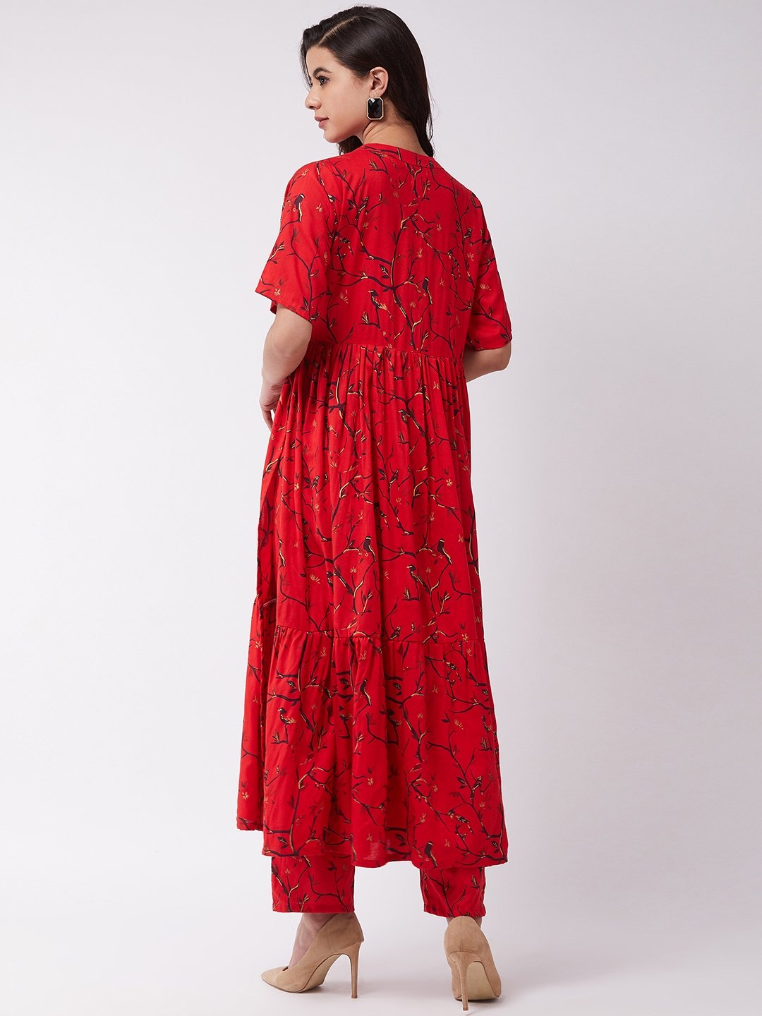A stunning pick to flaunt for traditional events, this red and gold long kurta and pants set is a must have for you. Catch it with extra huge earrings and sandals.