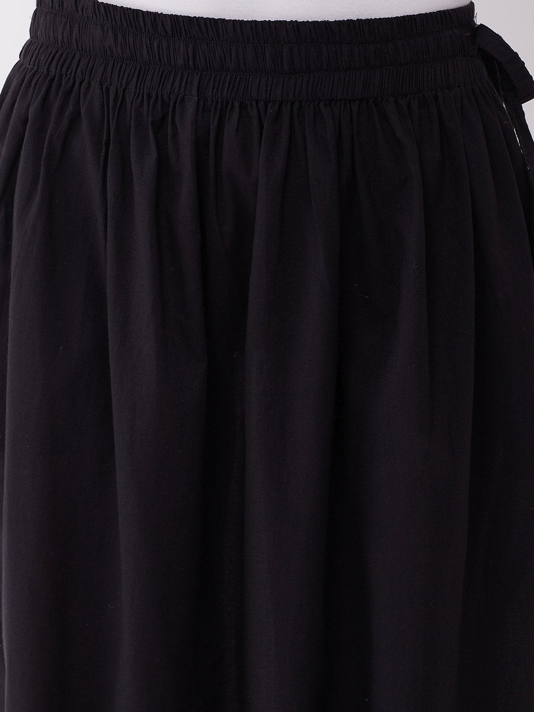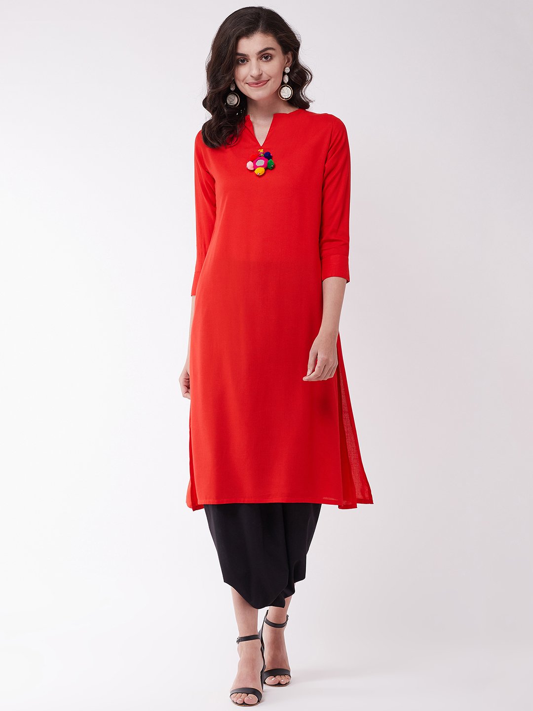 Set your chin high with confidence by wearing this red coloured kurta and black cowl dhoti set. The solid colours of this set will surely steal many compliments.