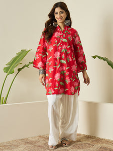 Red lotus print kurta teamed with white salwar creates a graceful ethnic look. Soft fabric and relaxed fit make it ideal for everyday wear, festive mornings, and casual gatherings.