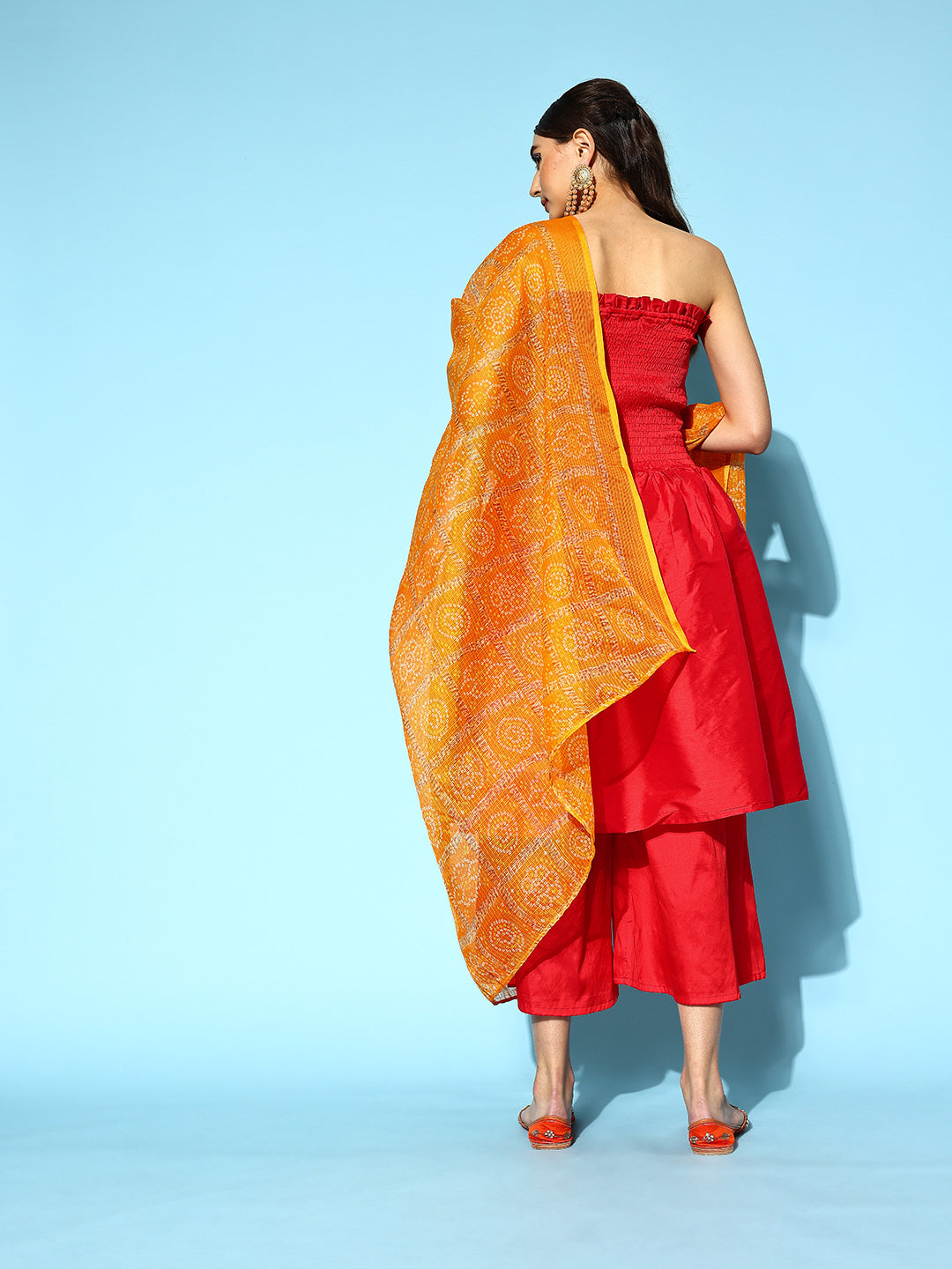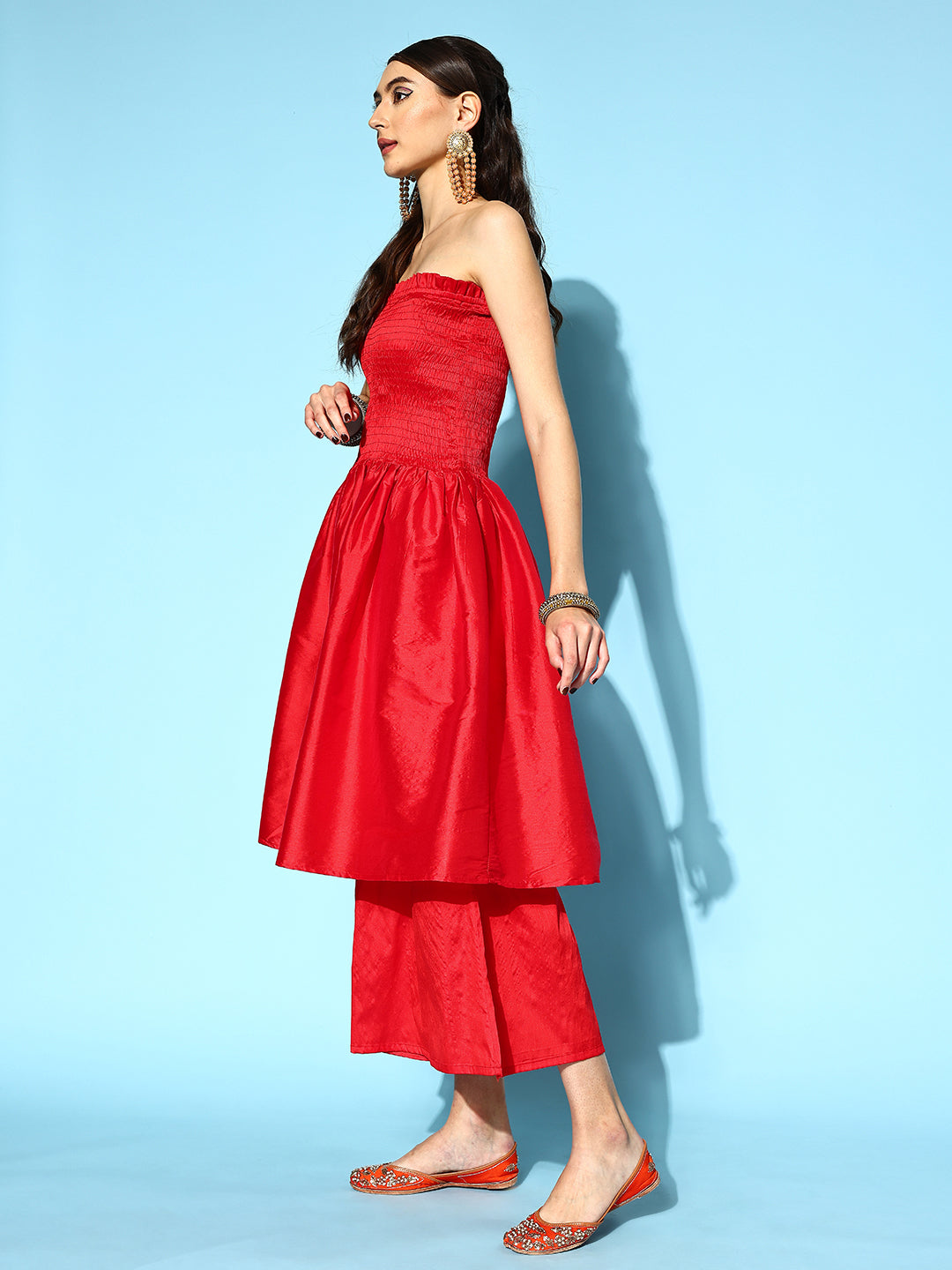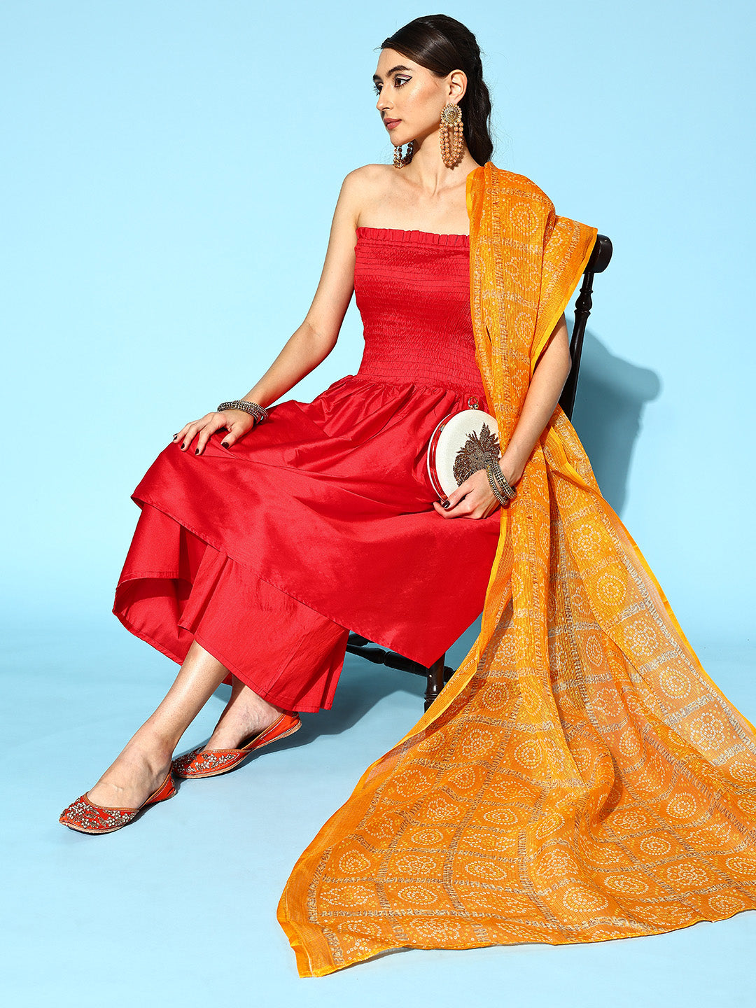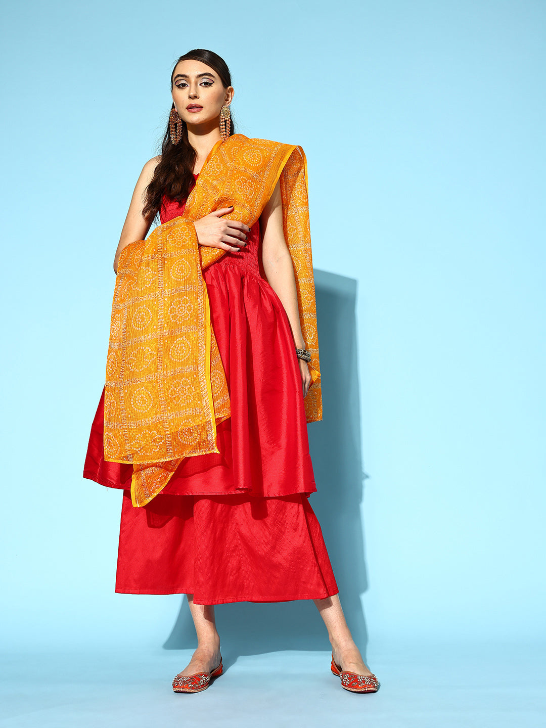 The Set is crafted from best of Indian fabrics. Style it with Oxidised jewelery and juttis and you are good to go for any outing Hand Wash Only Seperately.