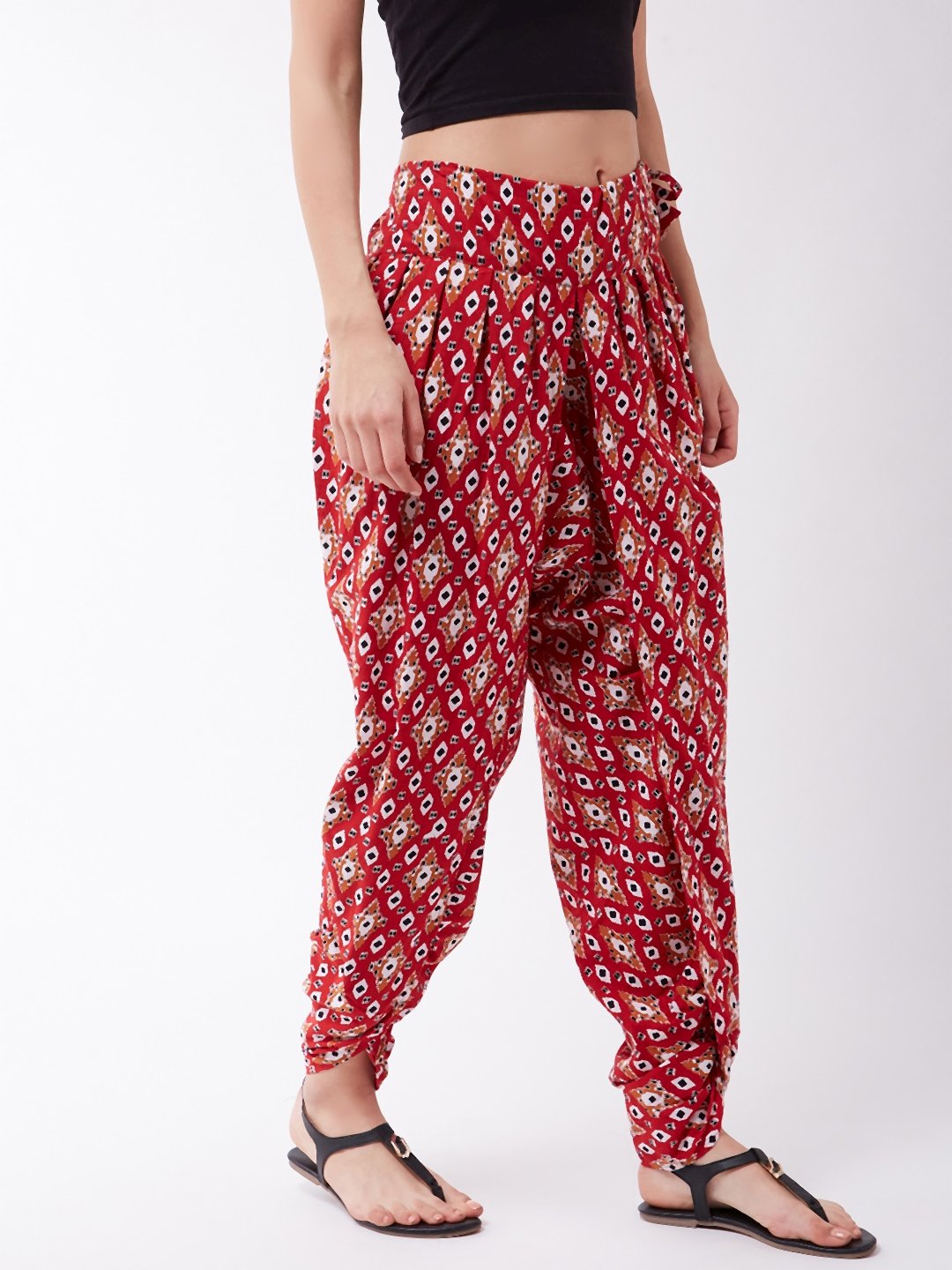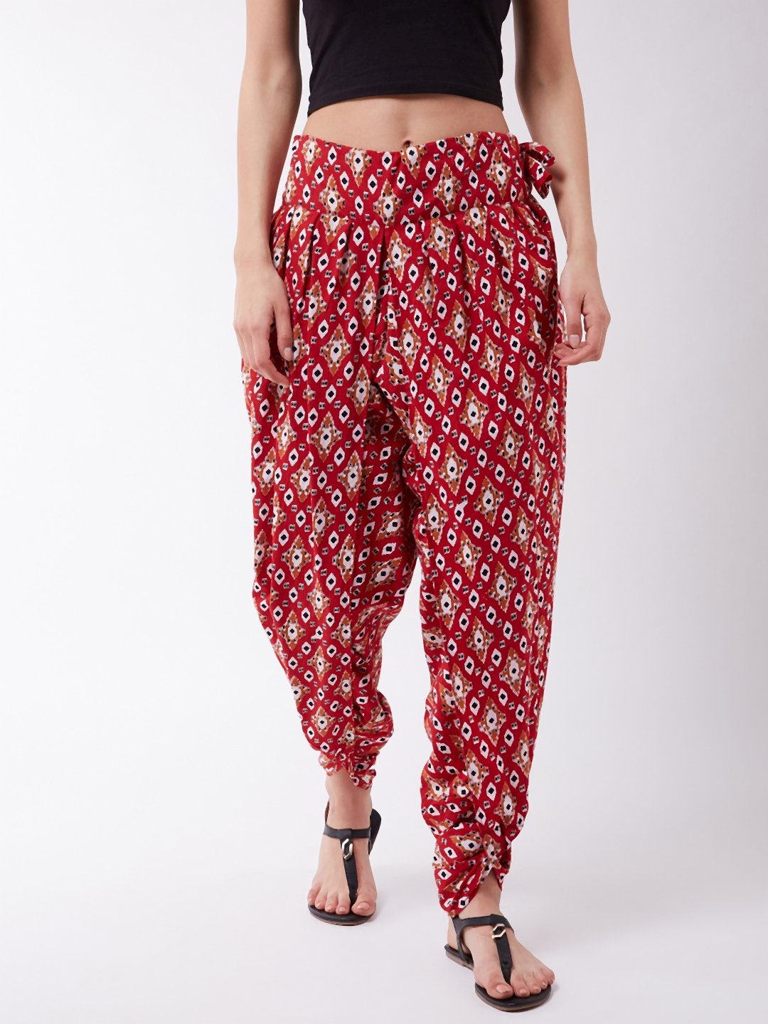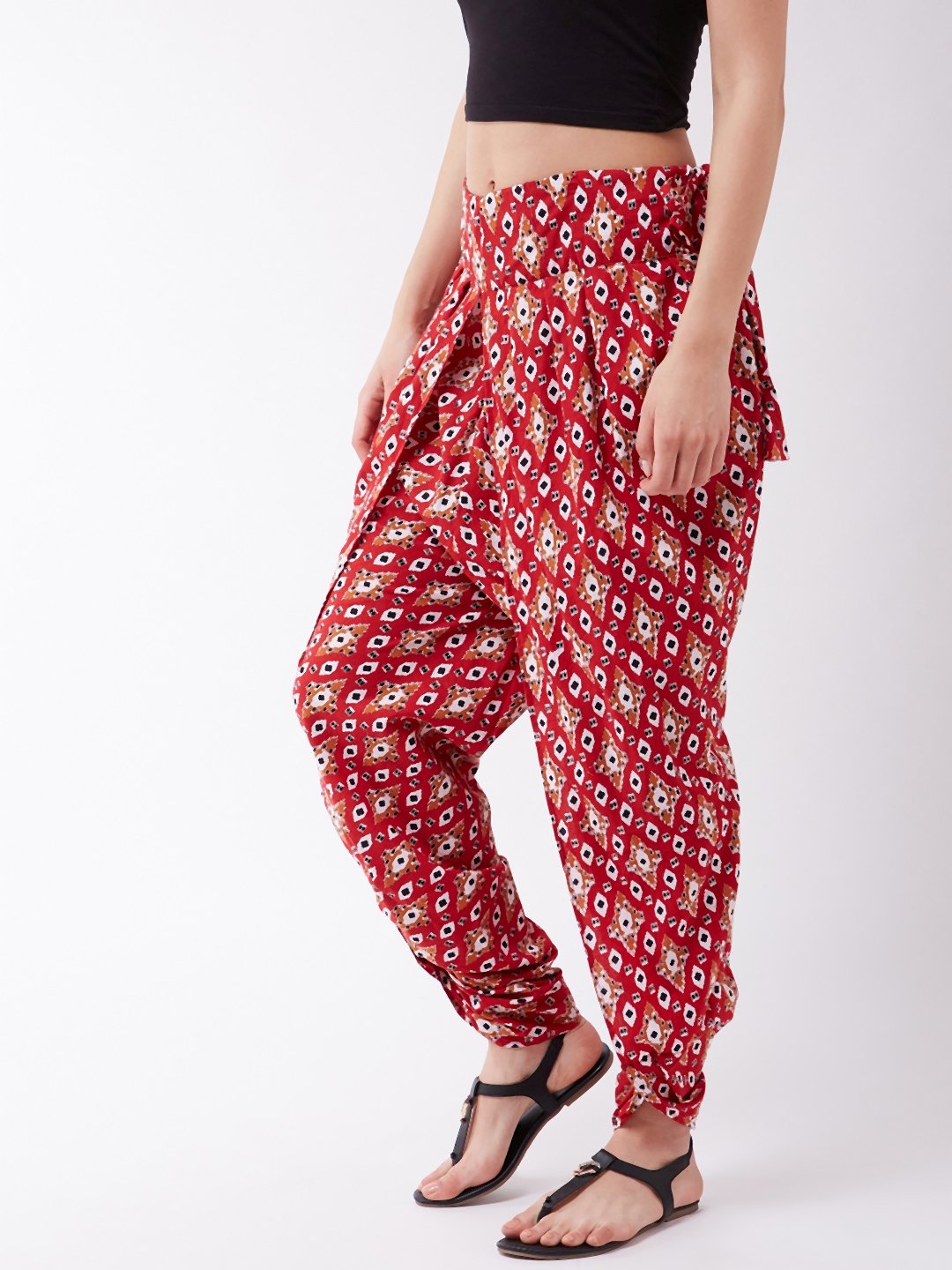 In case you want to flaunt a casual look, then team this red Patola dhoti up with your favourite long or short kurtis. Match the look with silver jewellery.