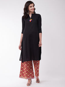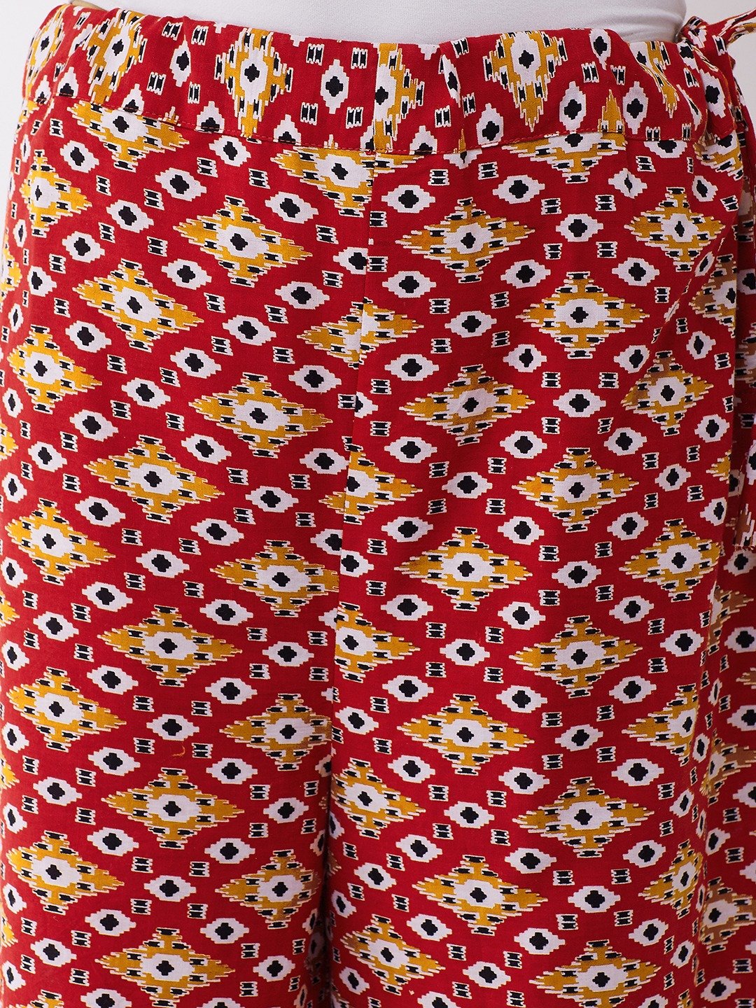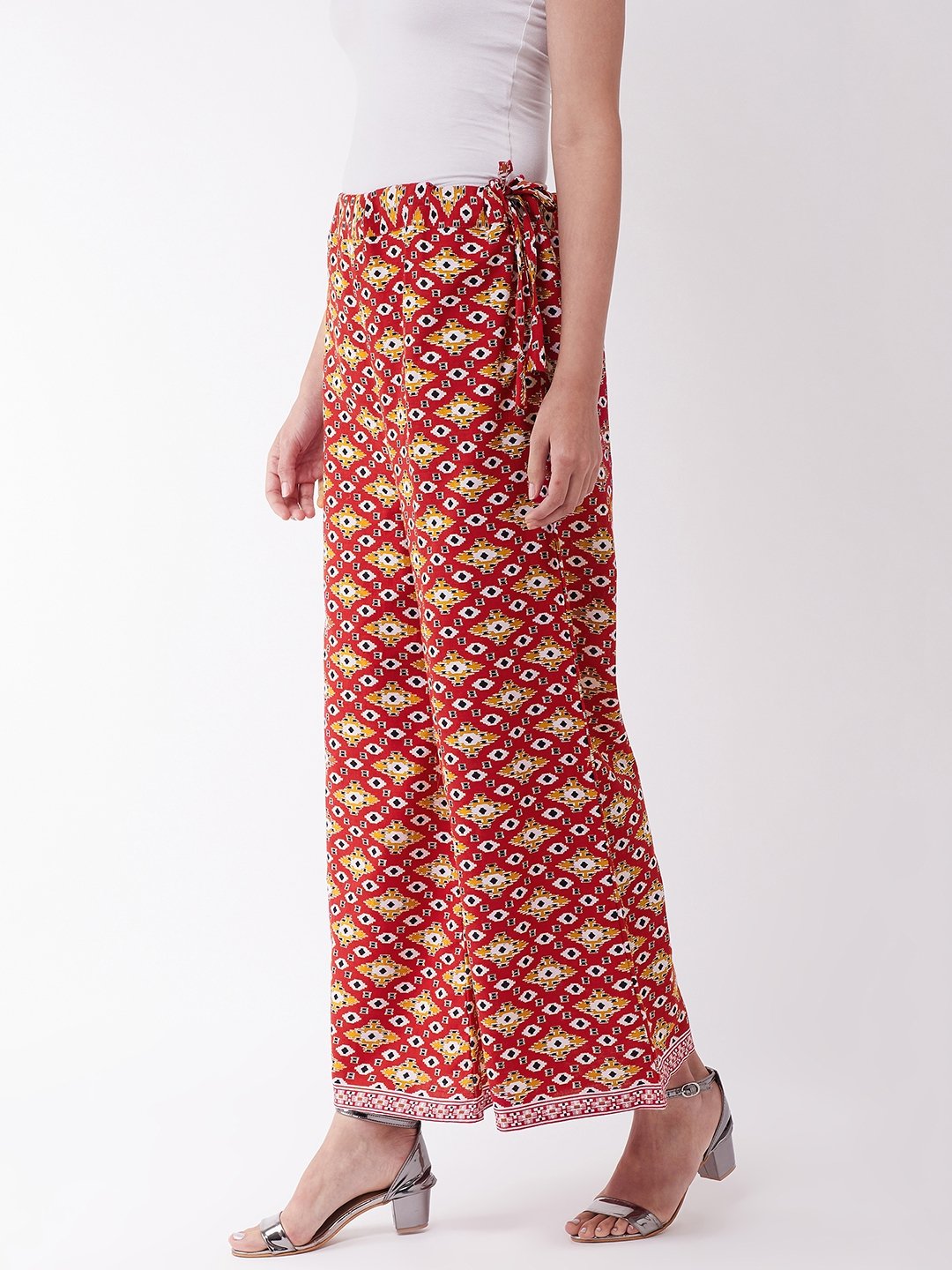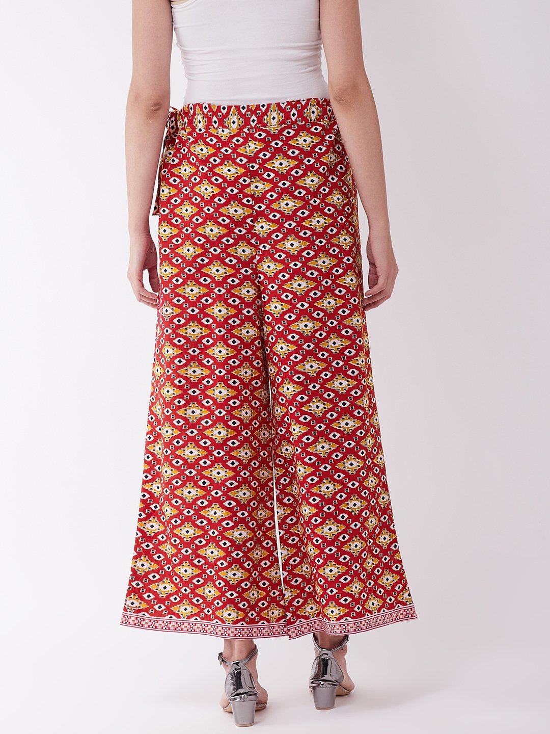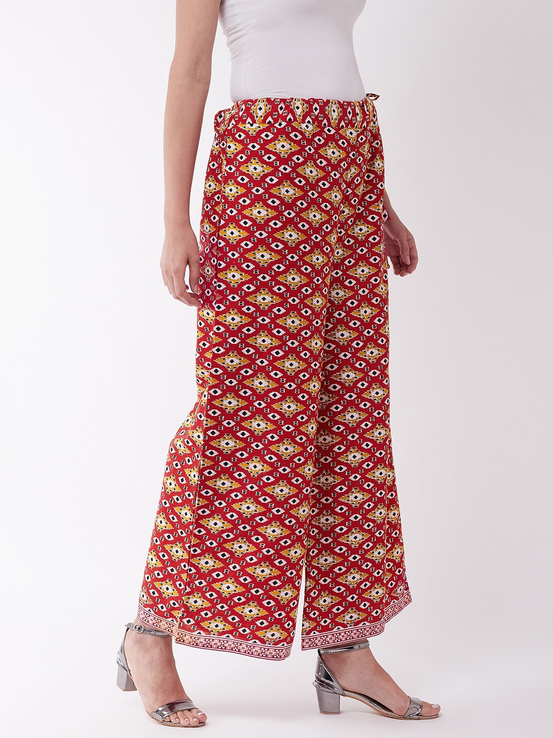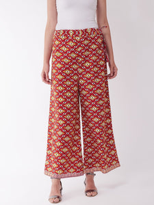Buy this pair of multipurpose red coloured Patola palazzos from InWeave to manage all your fashion emergencies. Perk it up with a black kurta and jhumkis.