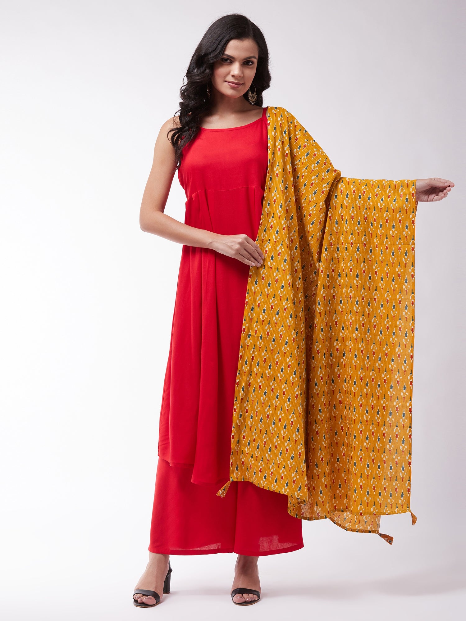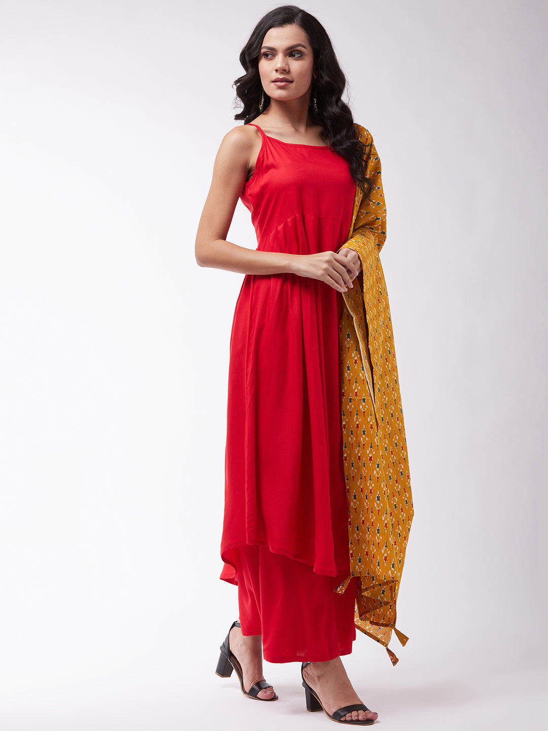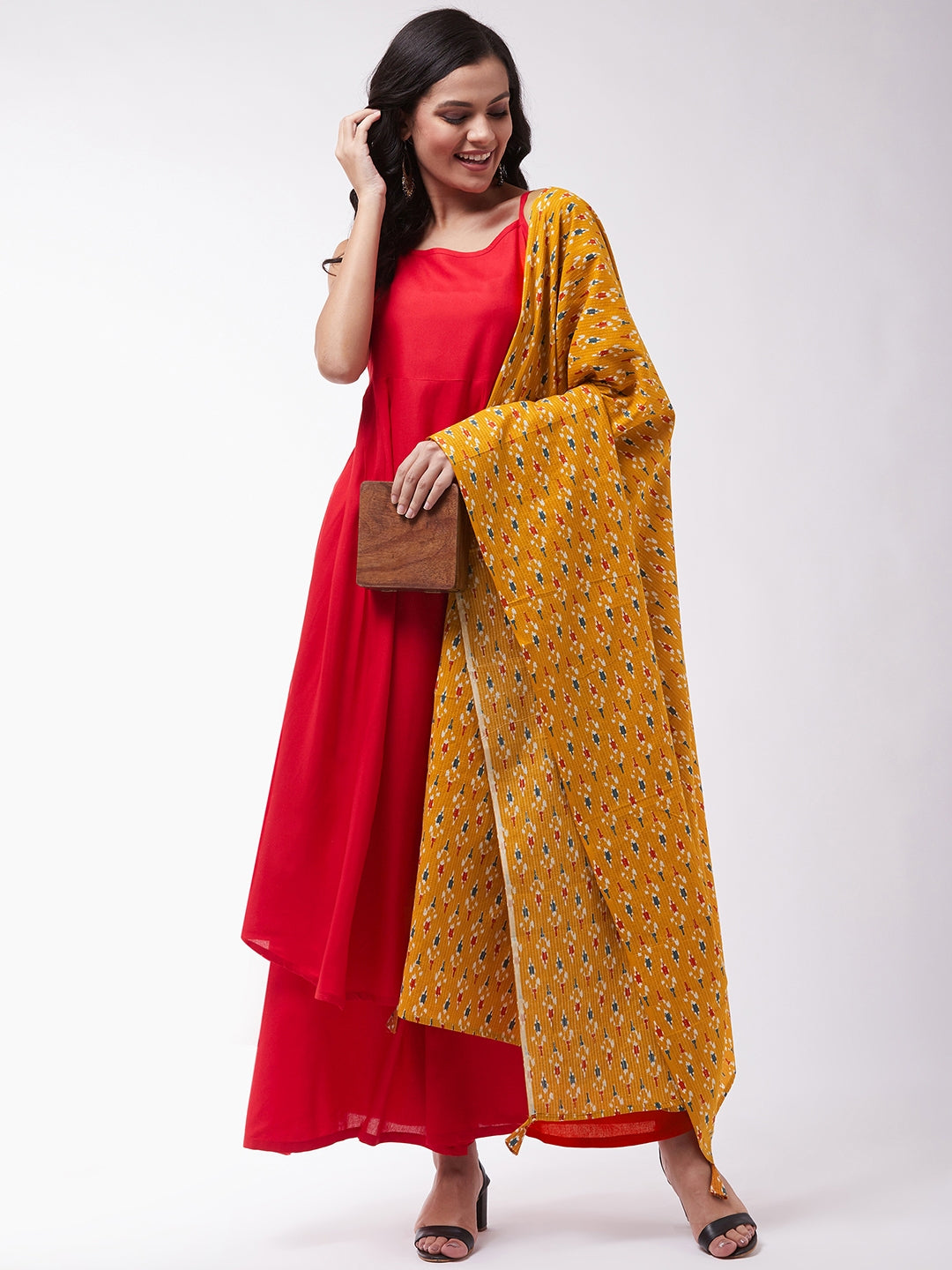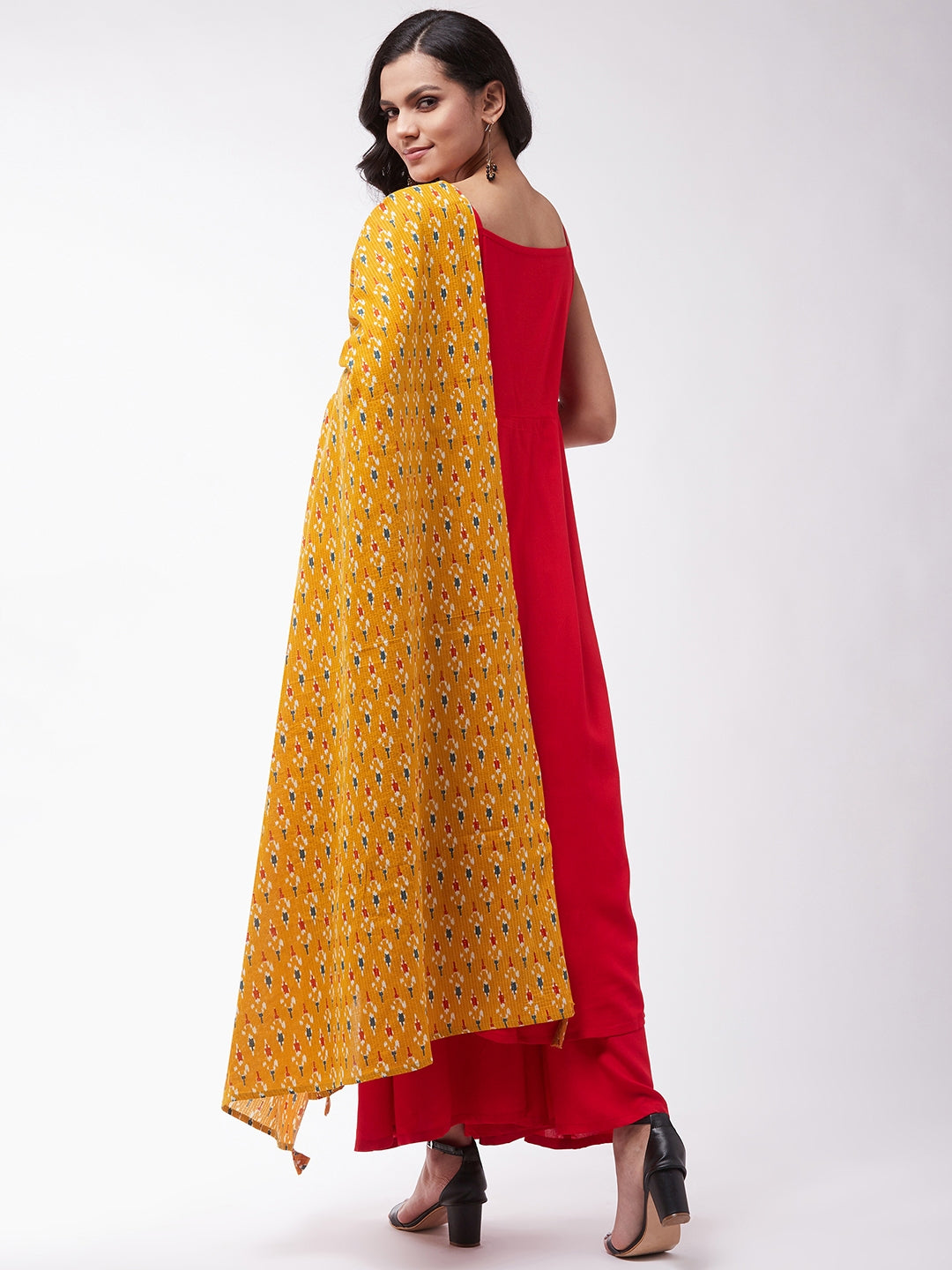 Red solid Kurta with Trousers with Mustard ikkat print dupatta with dupatta, Anarkali shape, Empire style, Round neck, short shoulder straps, Calf length with flared hem, Viscose rayon machine weave fabric.