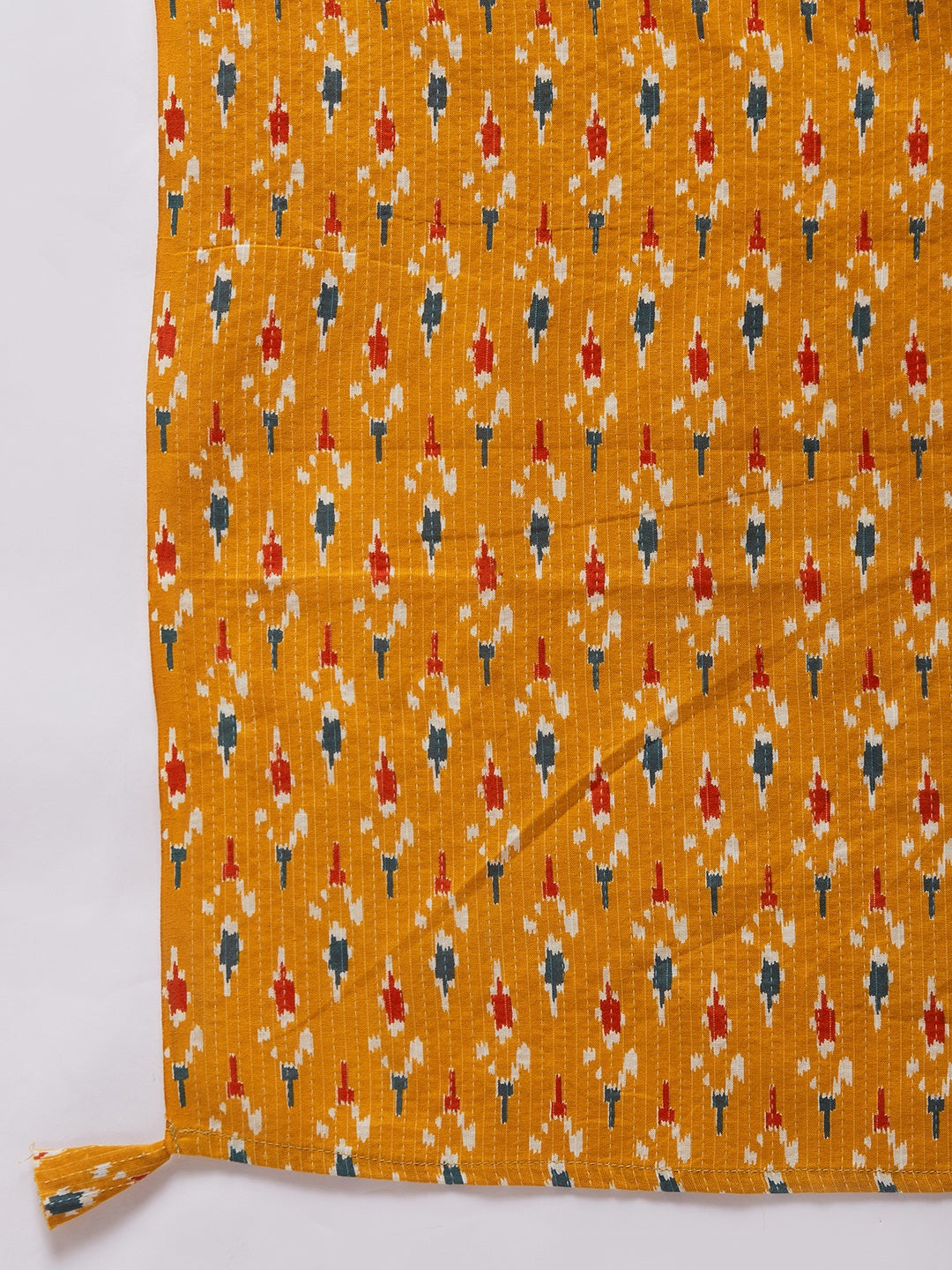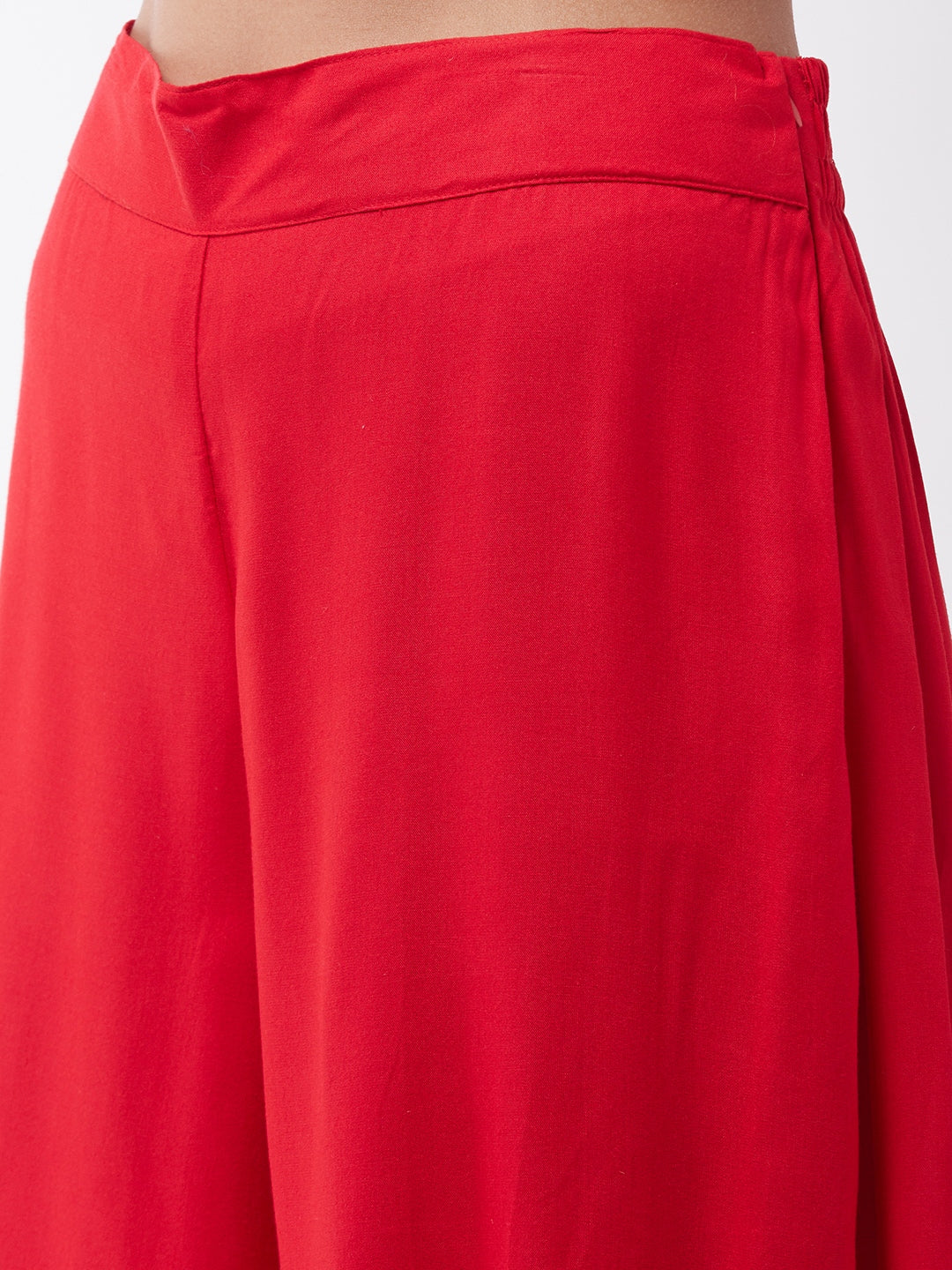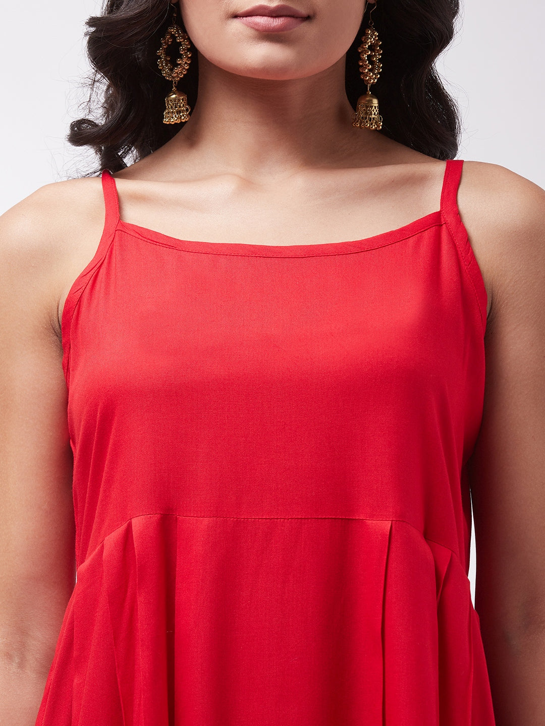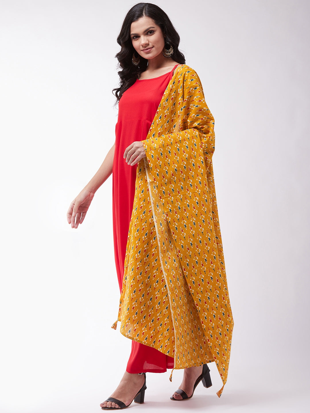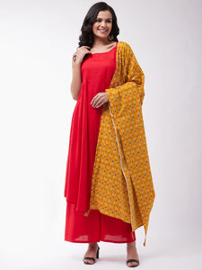 Red solid Kurta with Trousers with Mustard ikkat print dupatta with dupatta, Anarkali shape, Empire style, Round neck, short shoulder straps, Calf length with flared hem, Viscose rayon machine weave fabric.