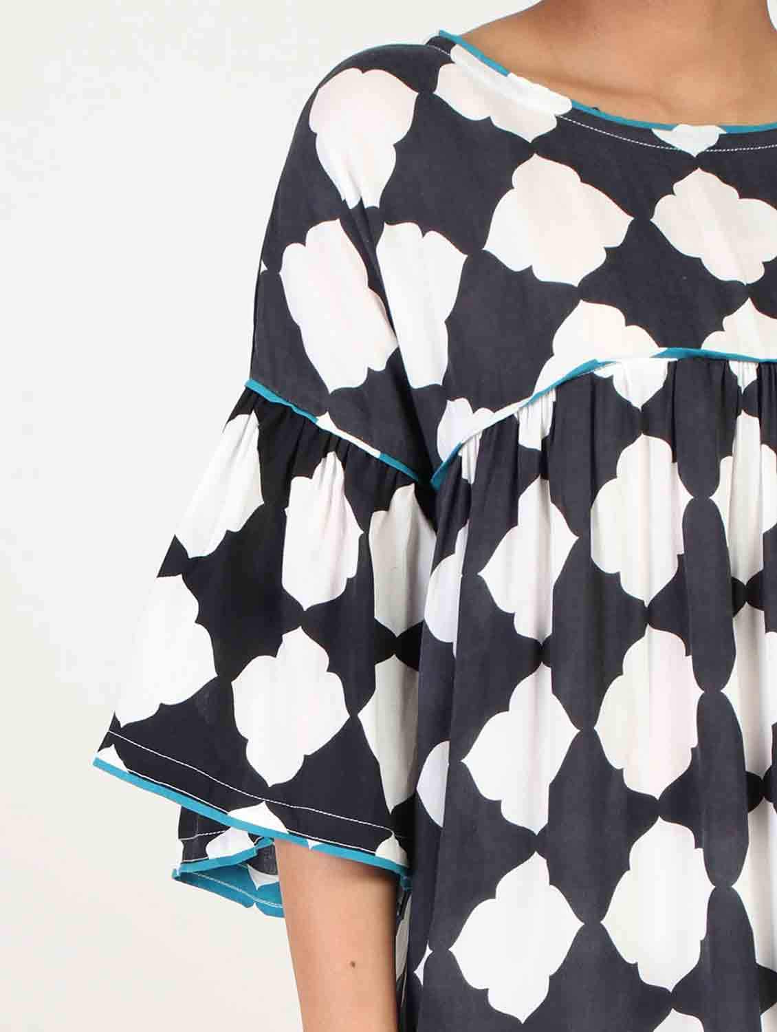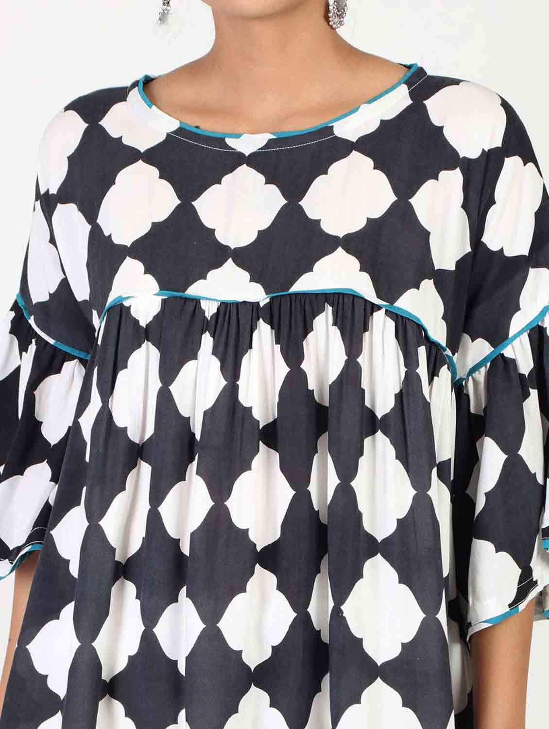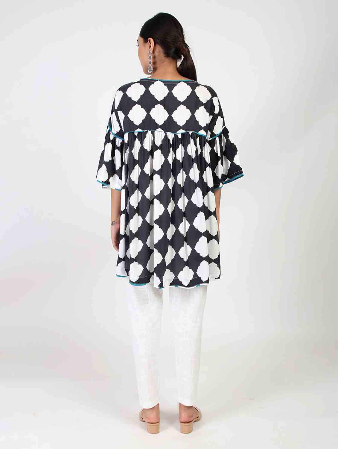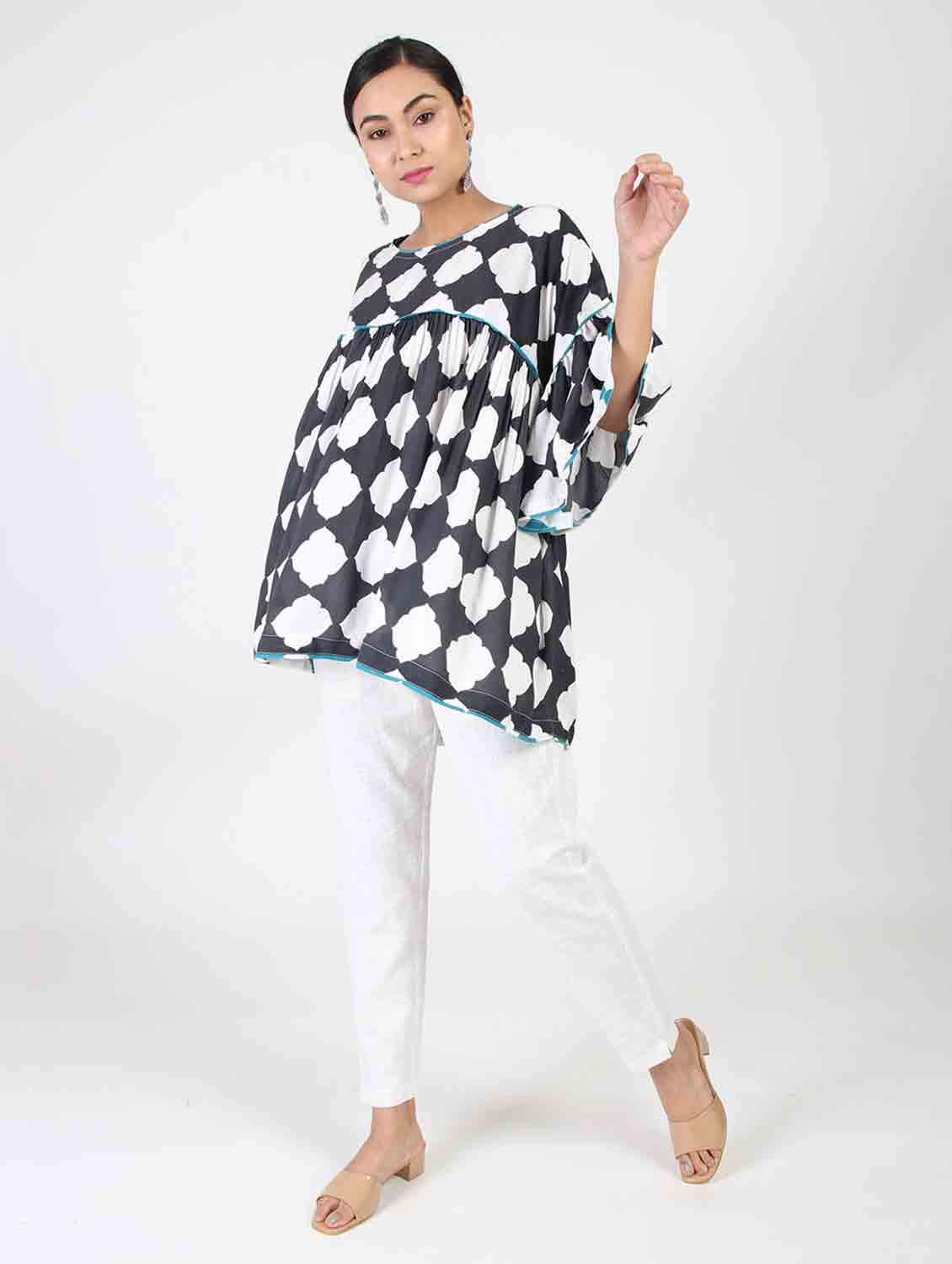 Summer means wearing something comfortable and loose , so this designer loose top will surely be useful keeping you comfortable as well as stylish. The piping at the borders gives it a neat finish.