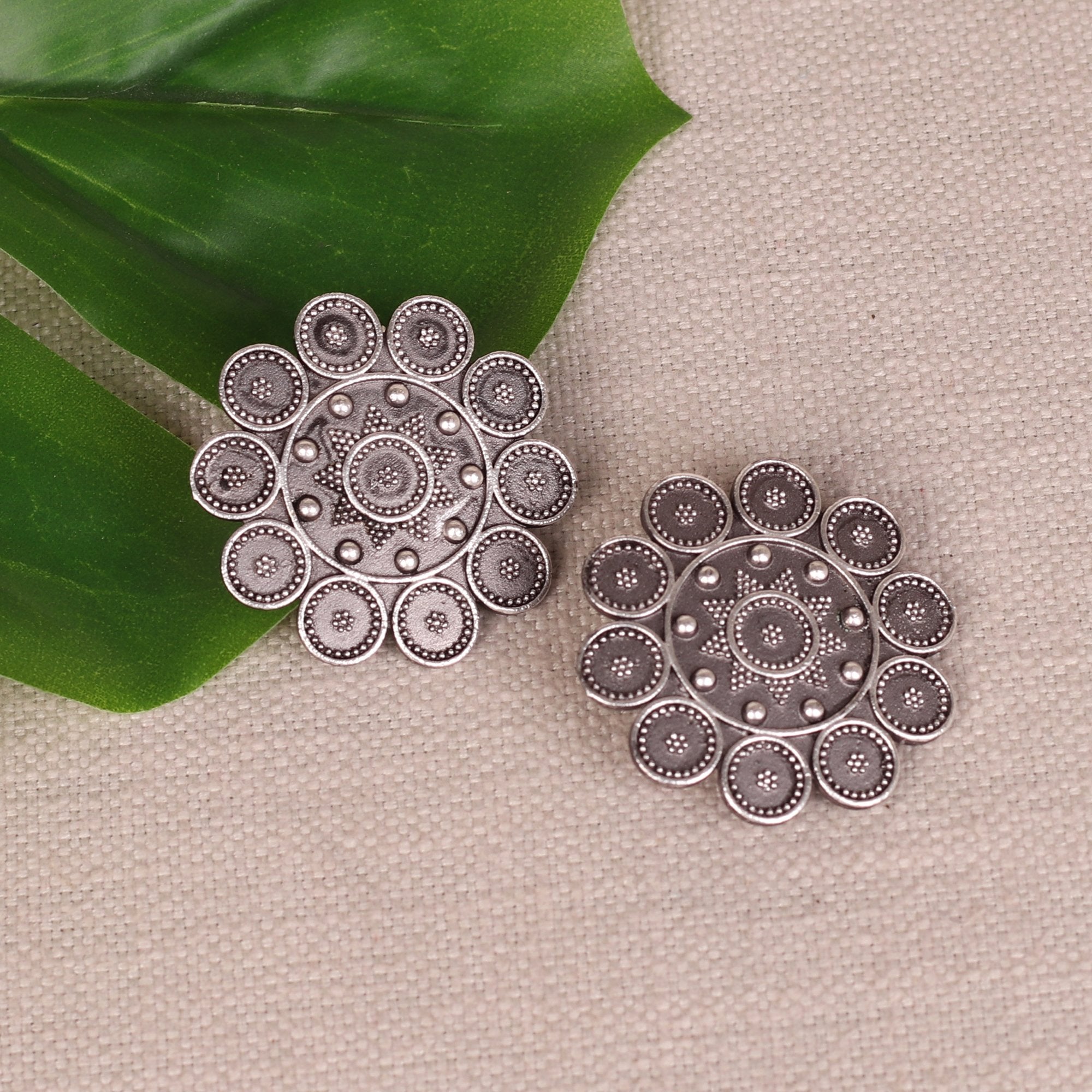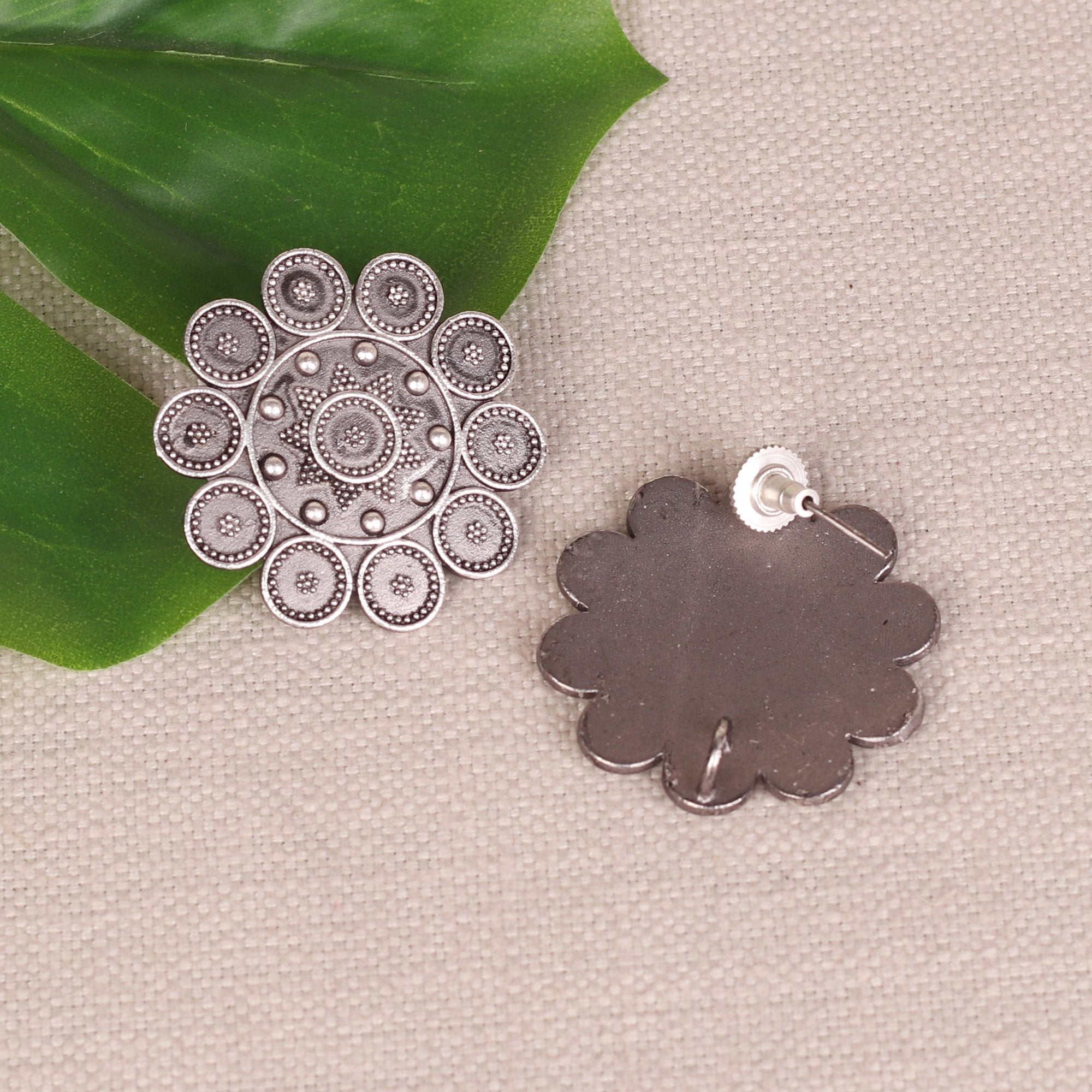 Add an elegant note to your occasion wear ensembles with these exquisite statement earrings. Handcrafted in german silver and with oxidized silver plating, these delicate and light weight stunners pair well with your Kurtas, Sarees or even add a pop of color to your white shirt & denim look