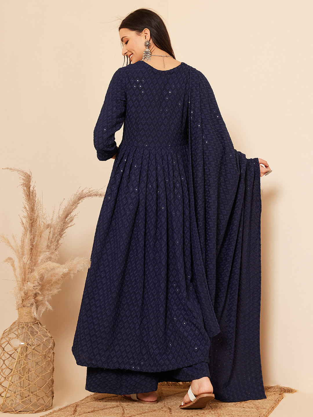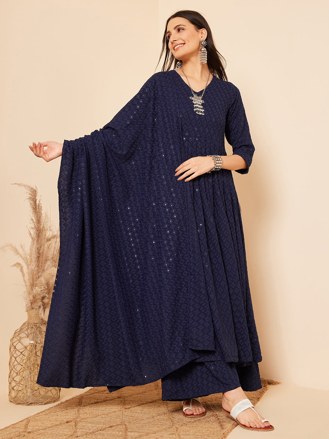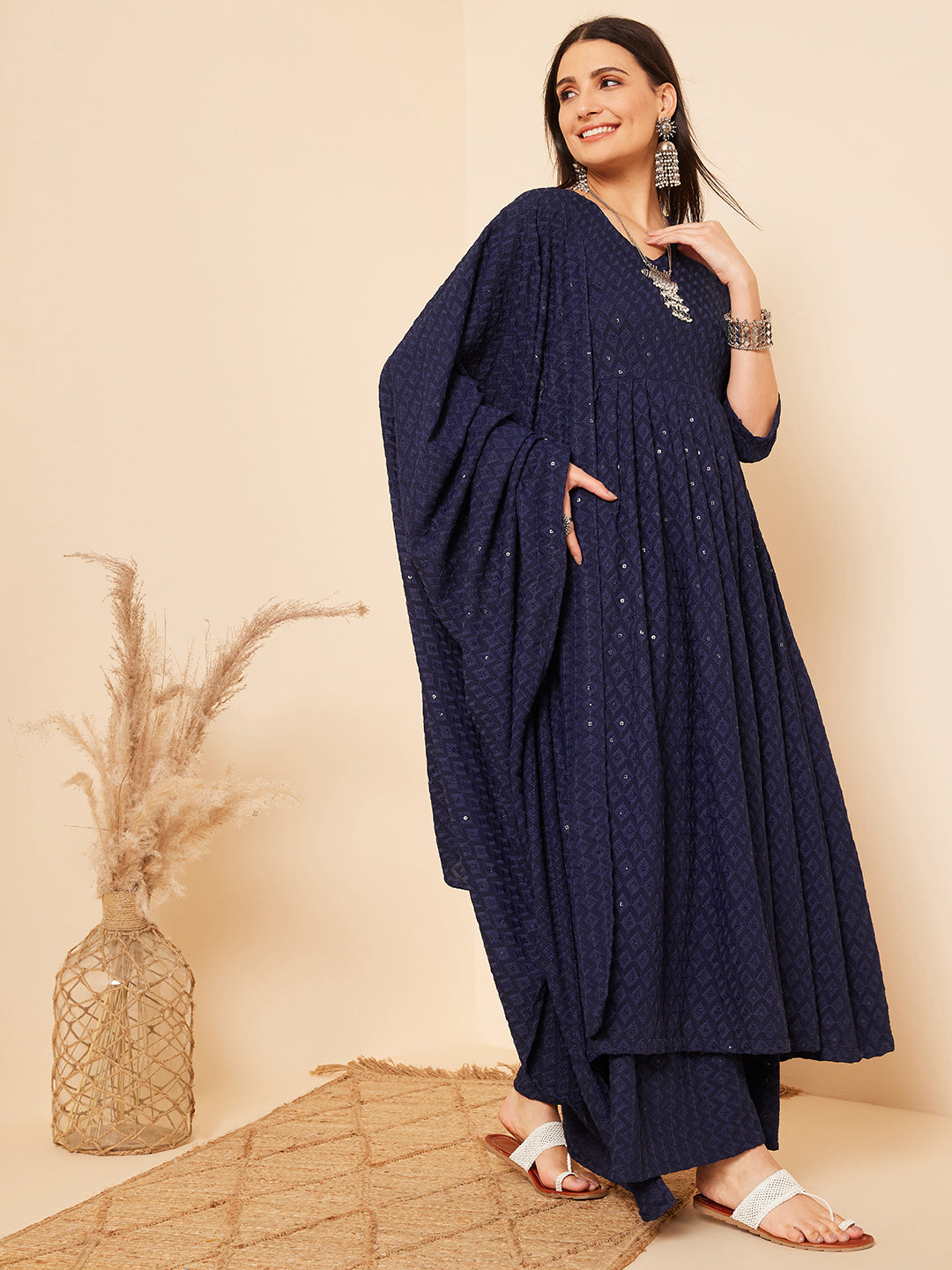 The Set is crafted from best of Indian fabrics. Style it with Oxidised jewelery and juttis and you are good to go for any outing Hand Wash Only Seperately.