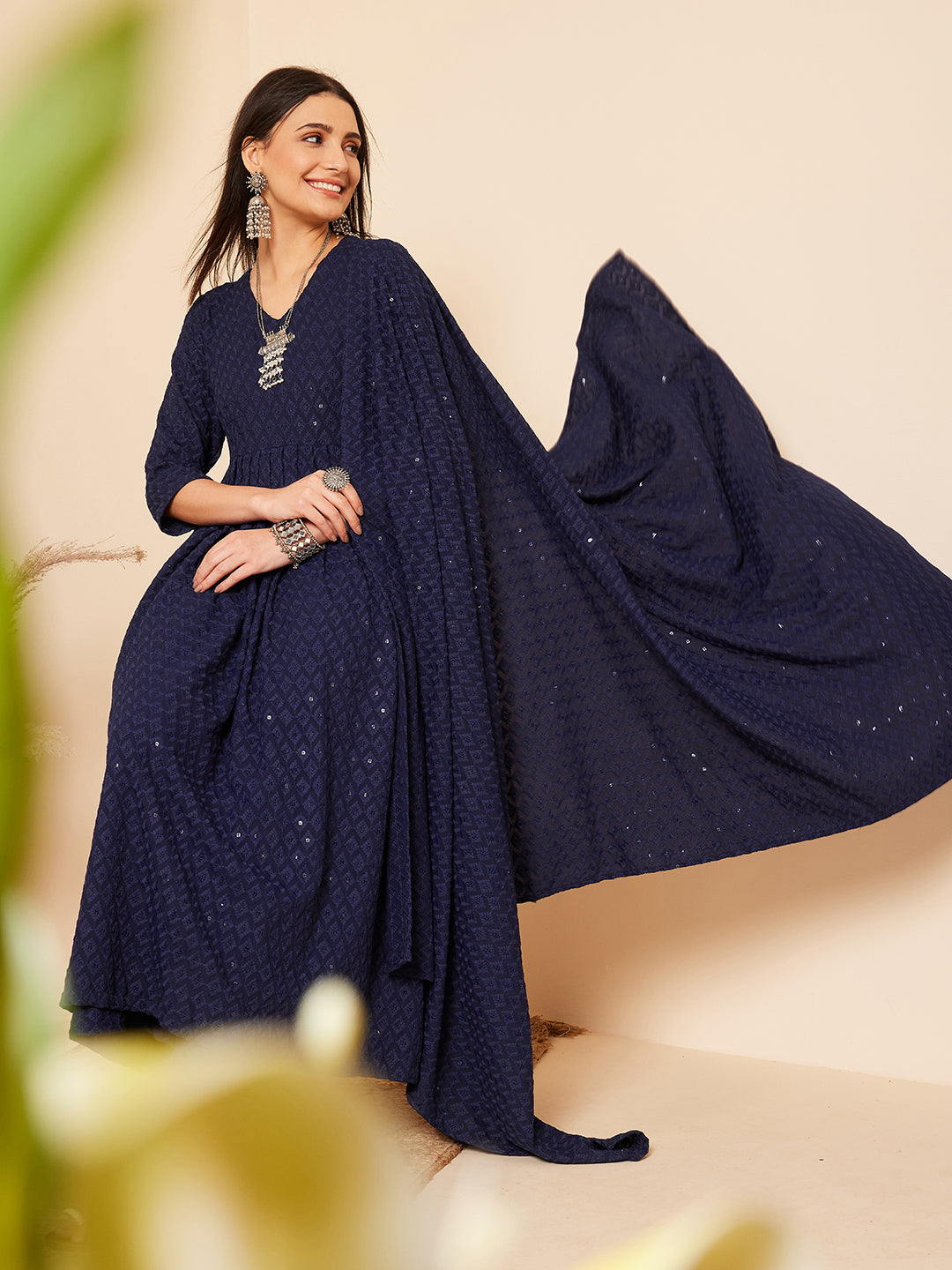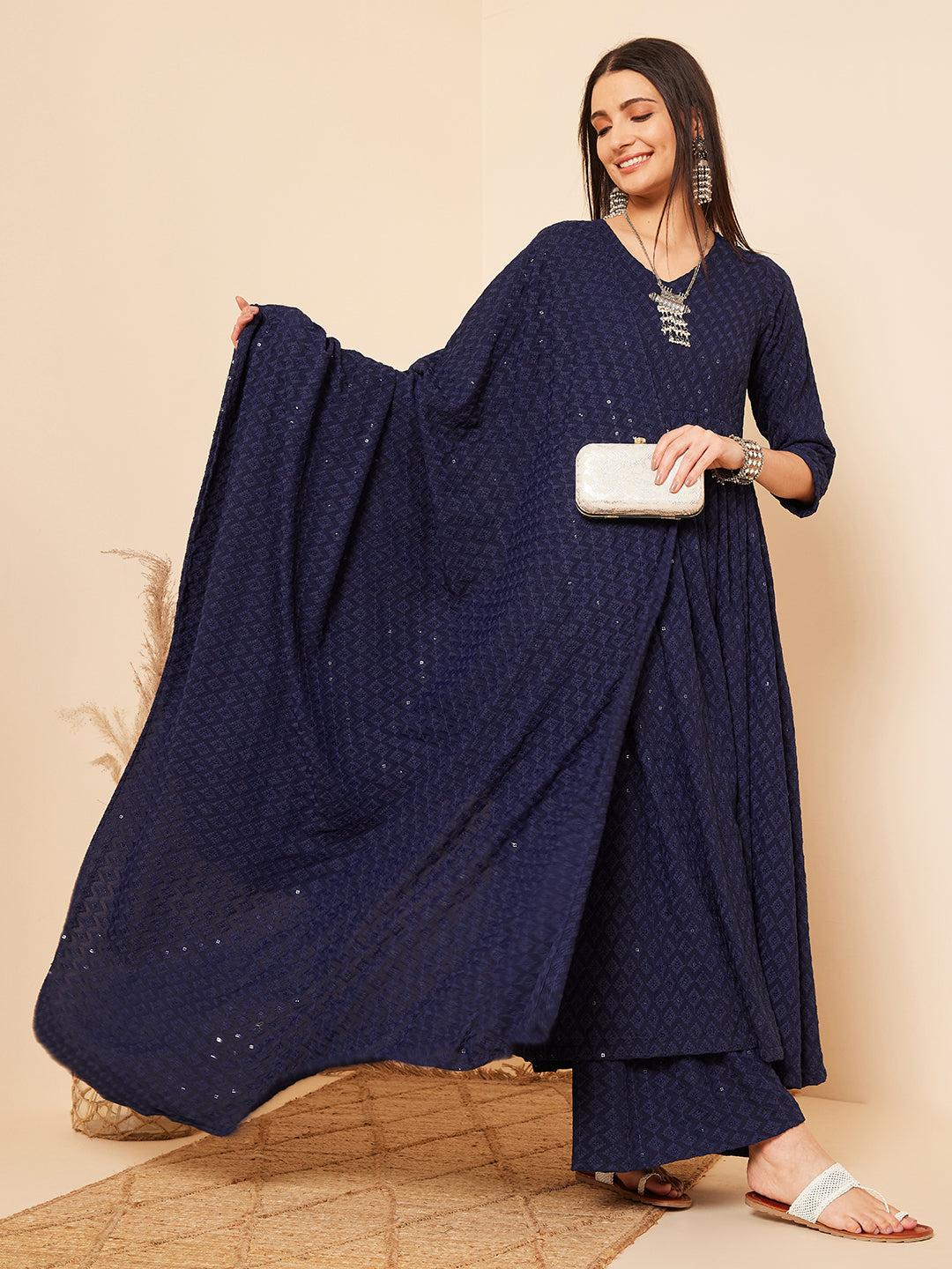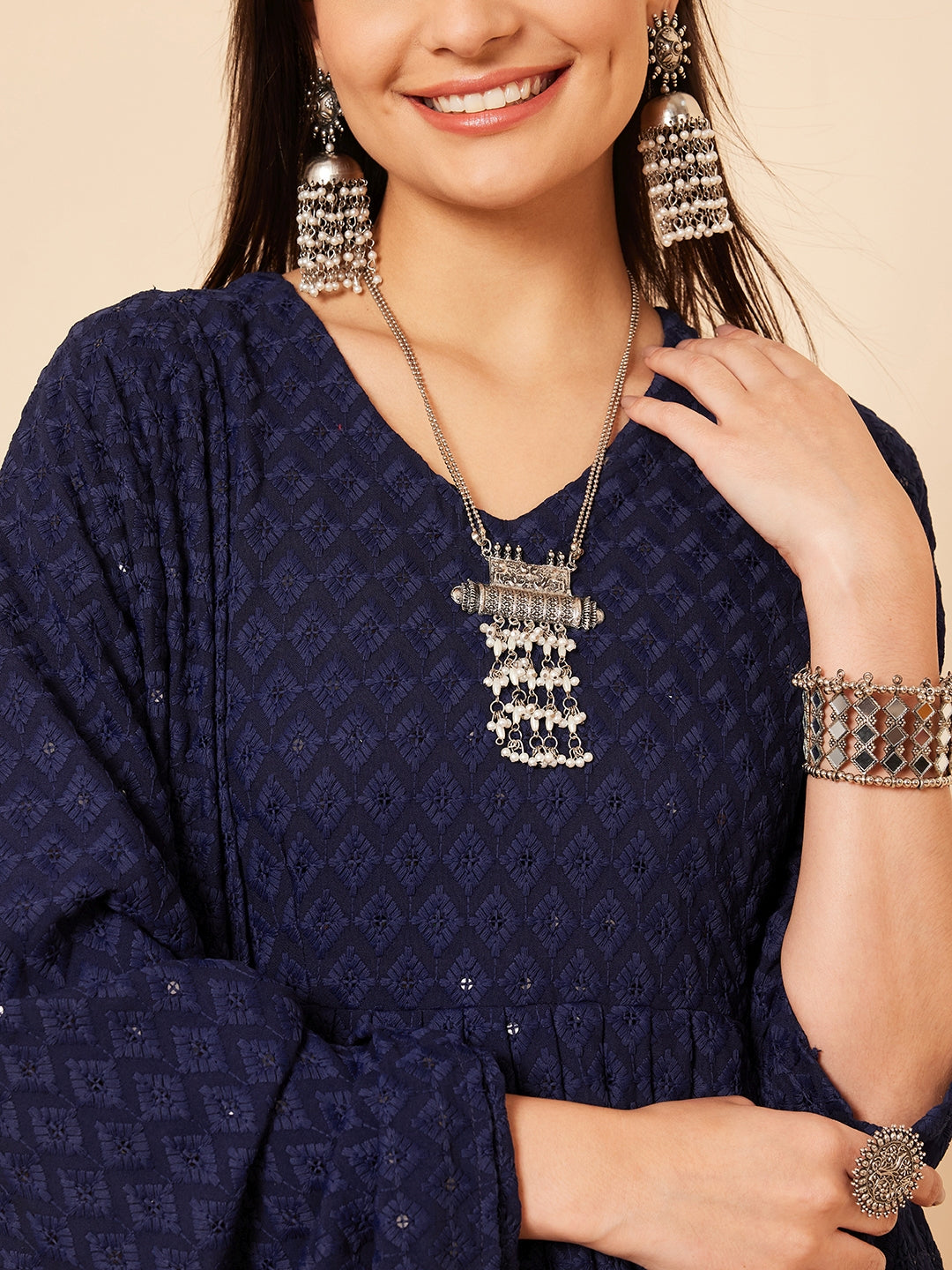 The Set is crafted from best of Indian fabrics. Style it with Oxidised jewelery and juttis and you are good to go for any outing Hand Wash Only Seperately.