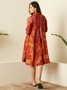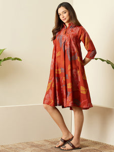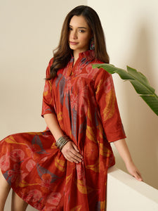 Bring earthy elegance to your wardrobe with this Rust Leaf Print Flared Dress. Designed with a graceful flare and nature-inspired prints, it offers effortless style and comfort.