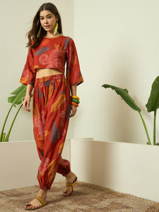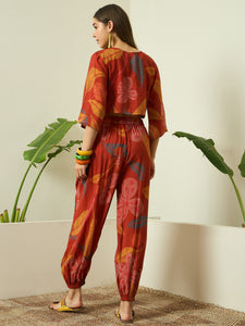 Rust leaf print top paired with comfortable balloon pants. Soft, breathable fabric and relaxed fit make this coordinated set perfect for casual outings, daywear, and effortless everyday styling.