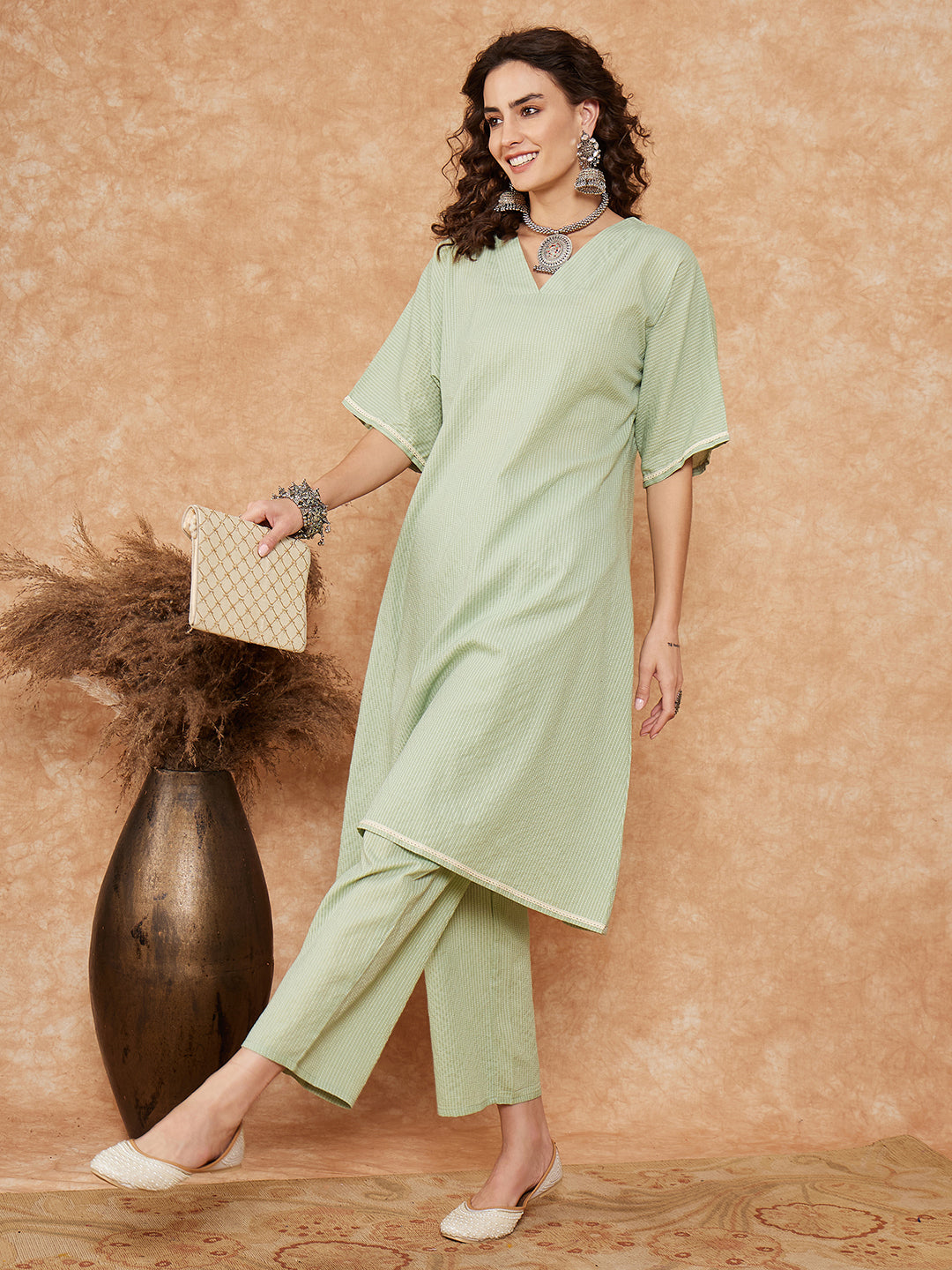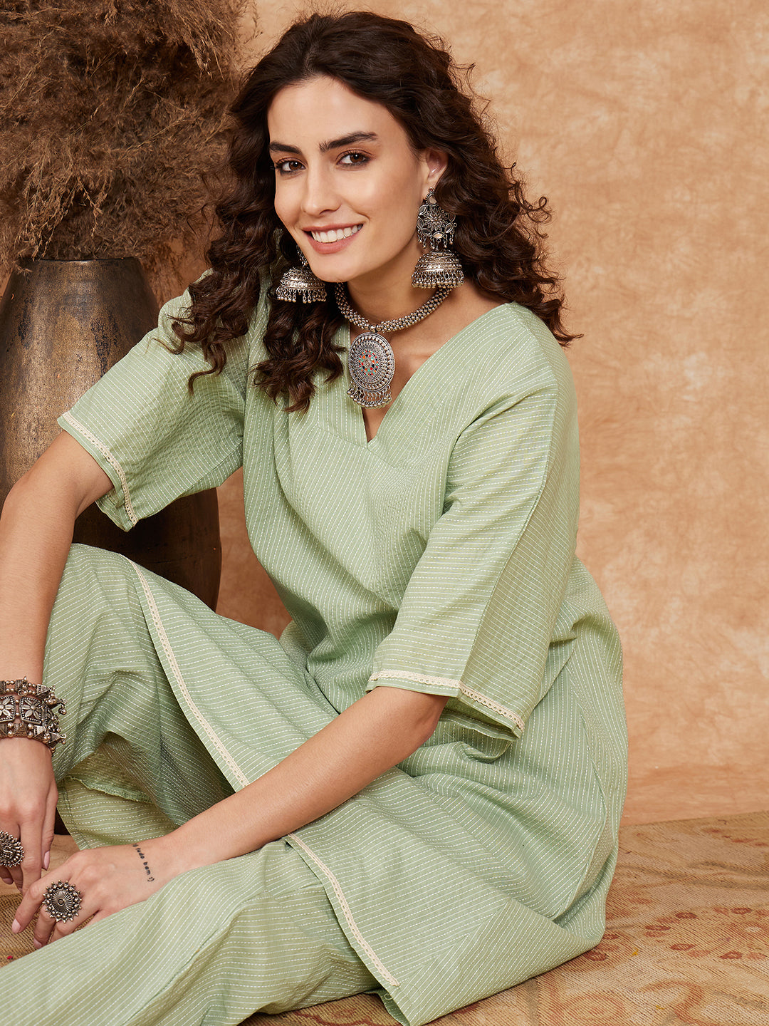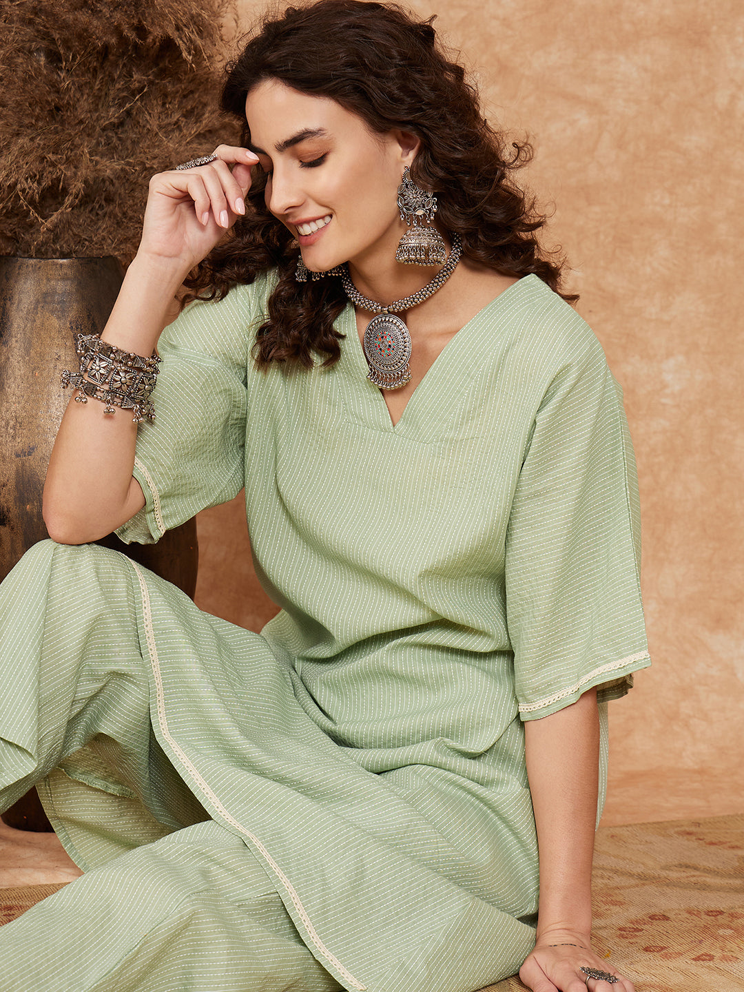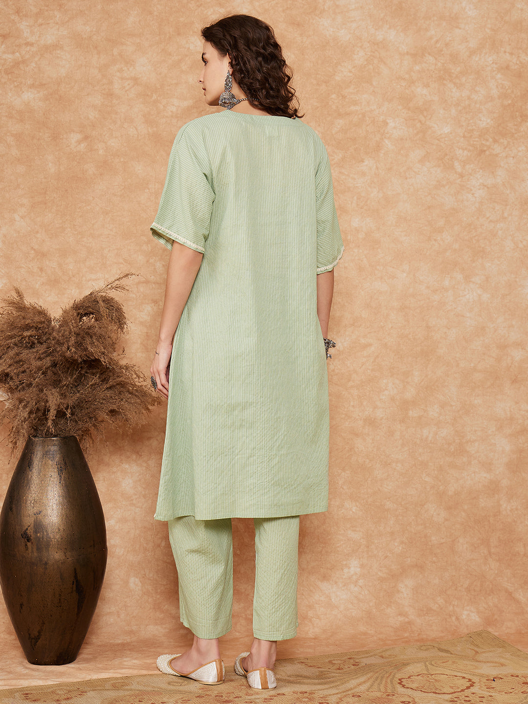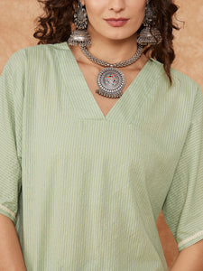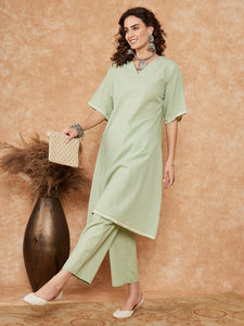 Sage Green Kantha Lace Wrok Kimono Sleeve Kurta Set