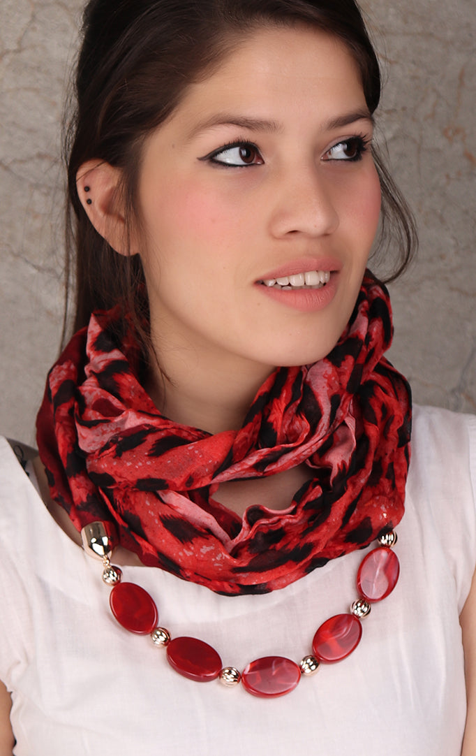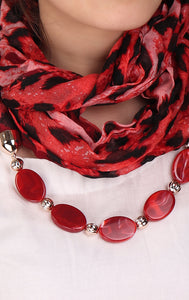 Make a statement my draping this necklace-stole around your neck. The stole has shaded red animal print with streaks of black, which is attached to oval blue oval necklace. This unique accessory is what you need to create stylish looks.