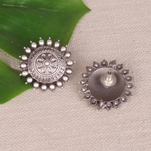 A pair of exquisitely oxidised silver earrings, handcrafted and exclusive for the woman of today. These muted design makes for the perfect everyday kind of piece. Perfect with Ethnic and Indo-western attires alike.
