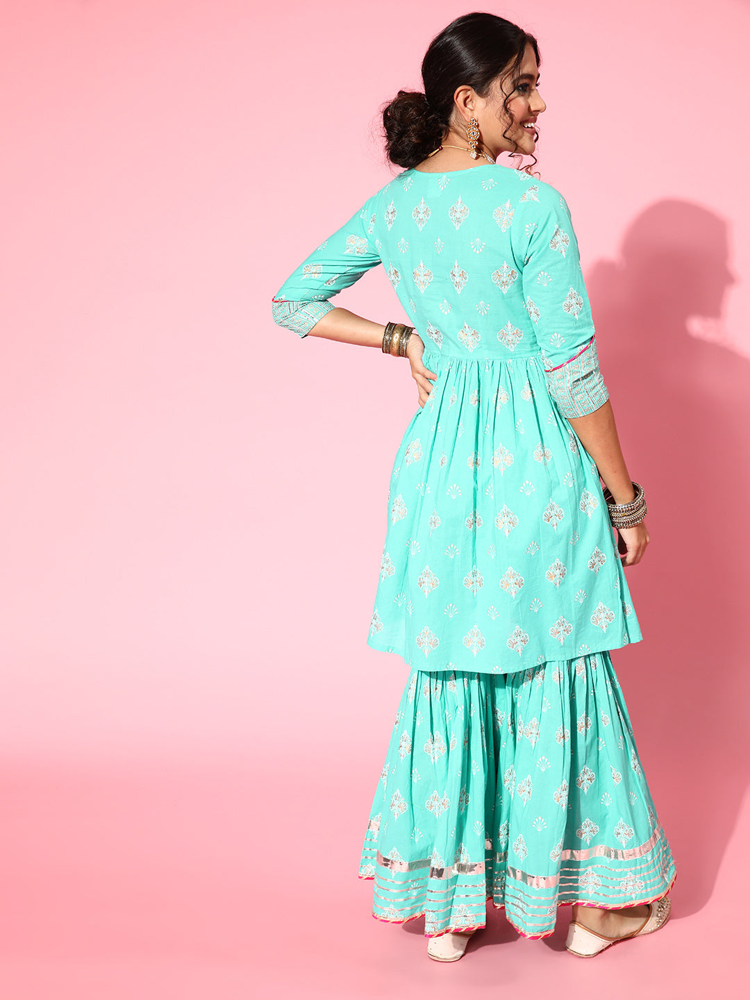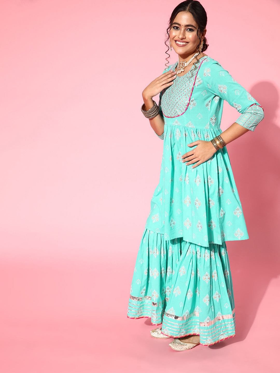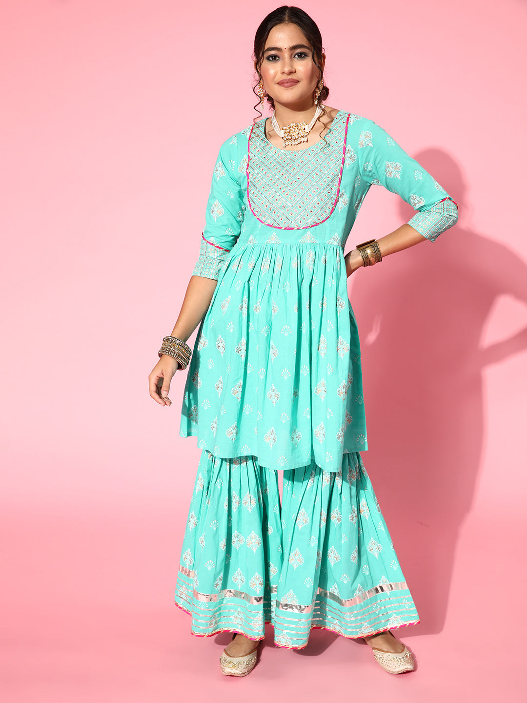 The Set is crafted from best of Indian fabrics. Style it with Oxidised jewelery and juttis and you are good to go for any outing Hand Wash Only Seperately.