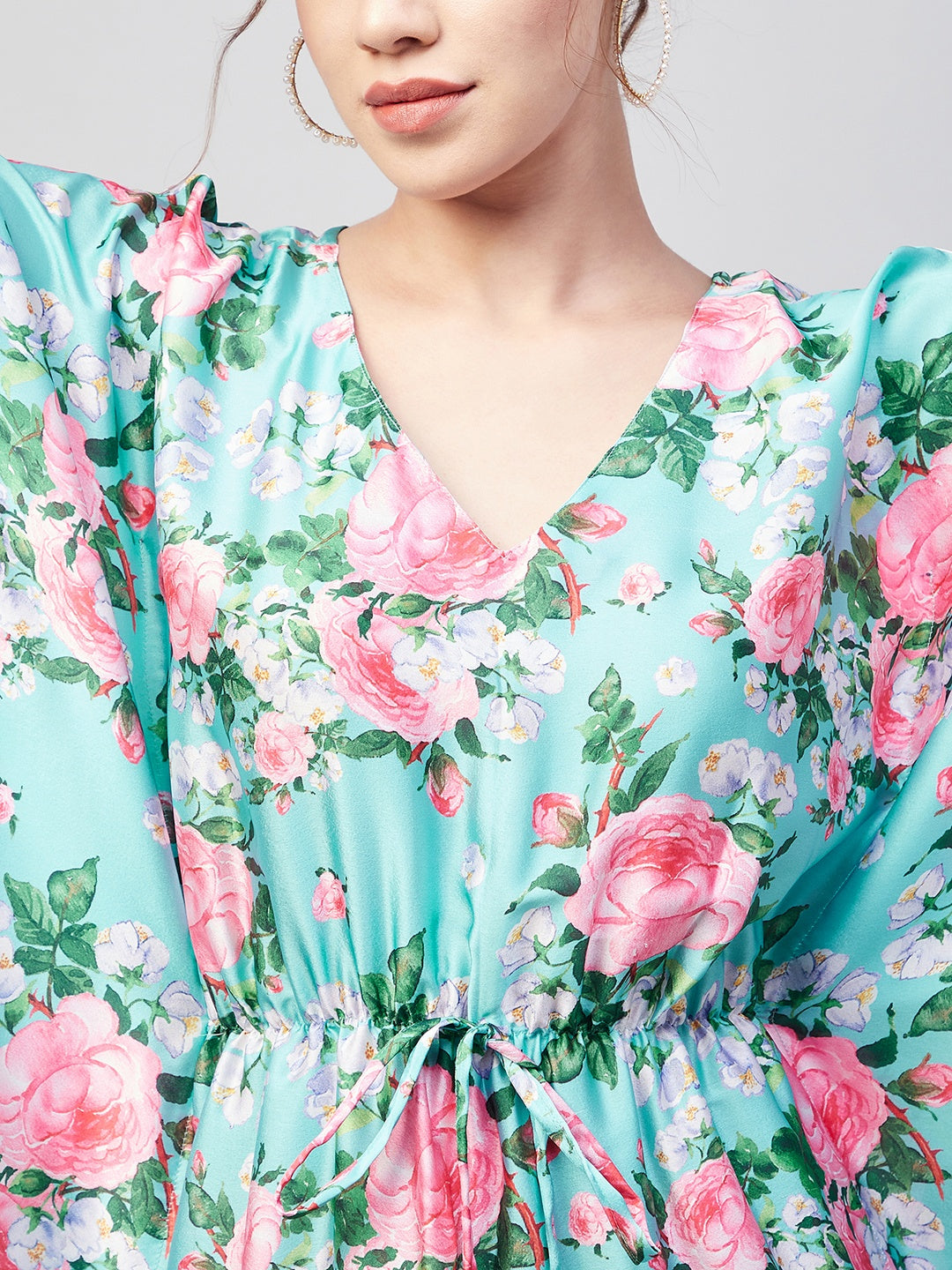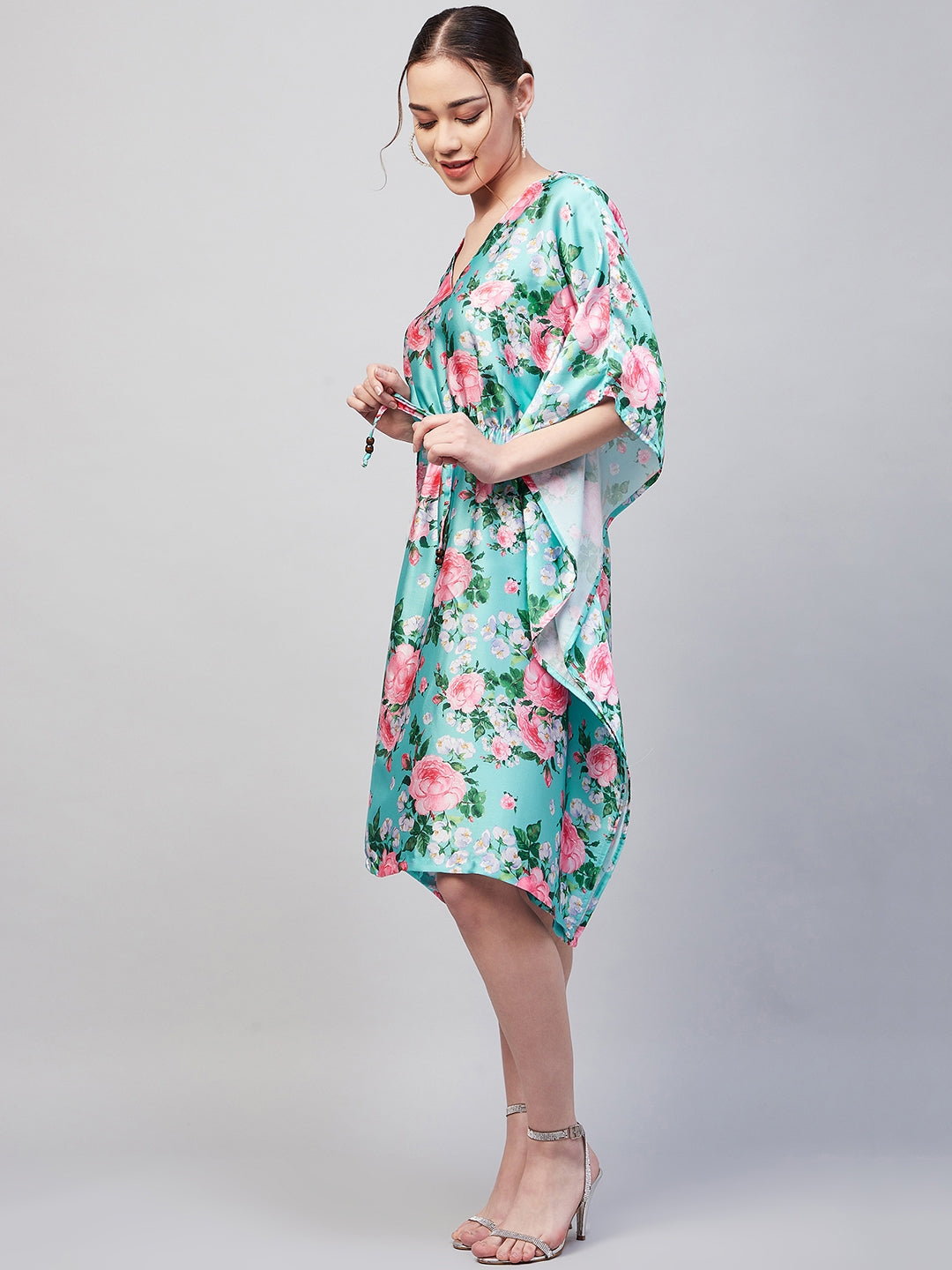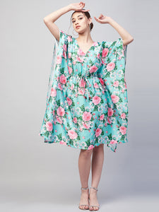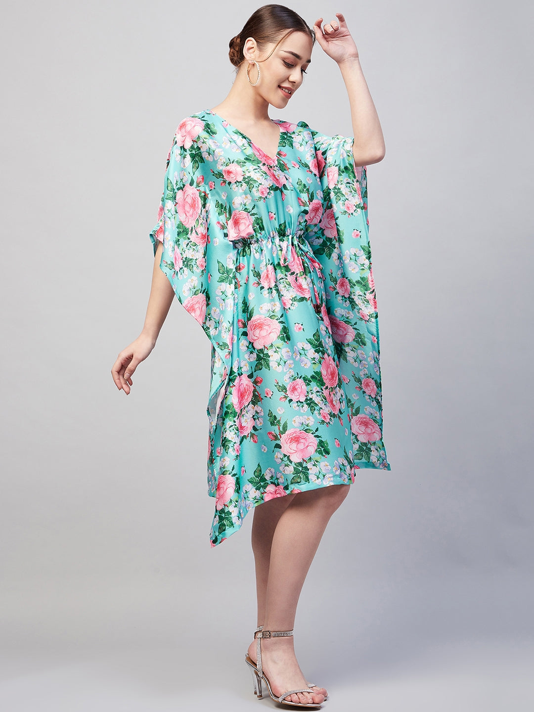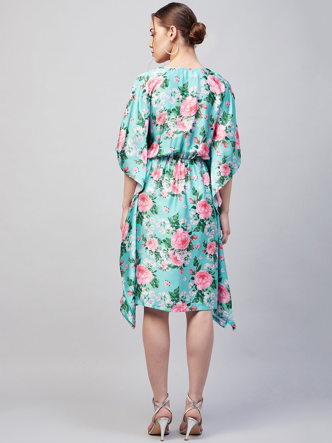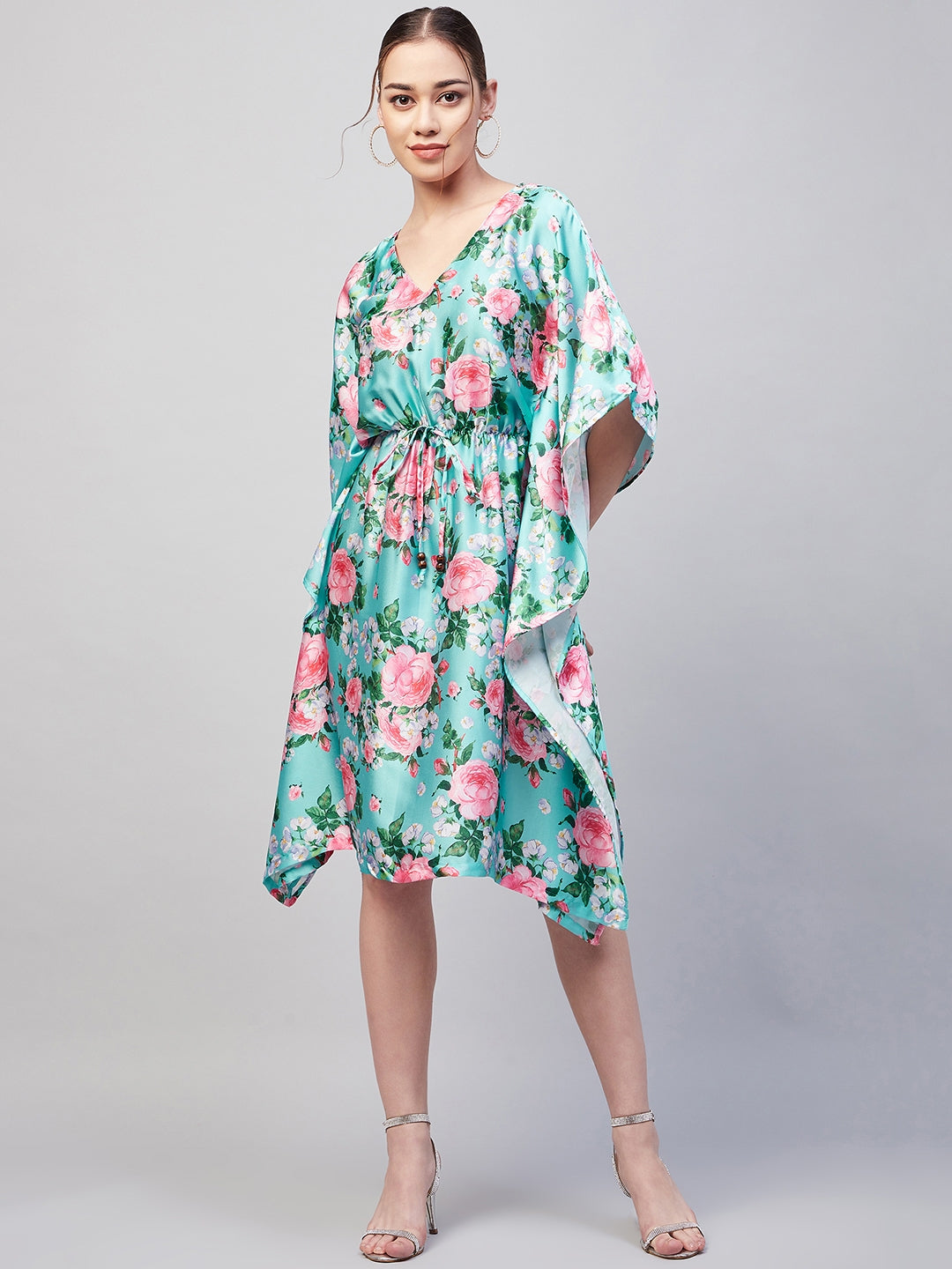 Sky Blue kaftan dress, Round neck, Three-quarter, batwing sleeve, Midi length in flared hem, Cotton fabric. Set the tone for this season with this one-of-a-kind InWeave dress. Match this printed Black piece with an incredible statement bag and high heels to maximize your next lunch look. Used Fabric -Rayon