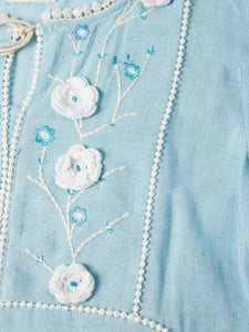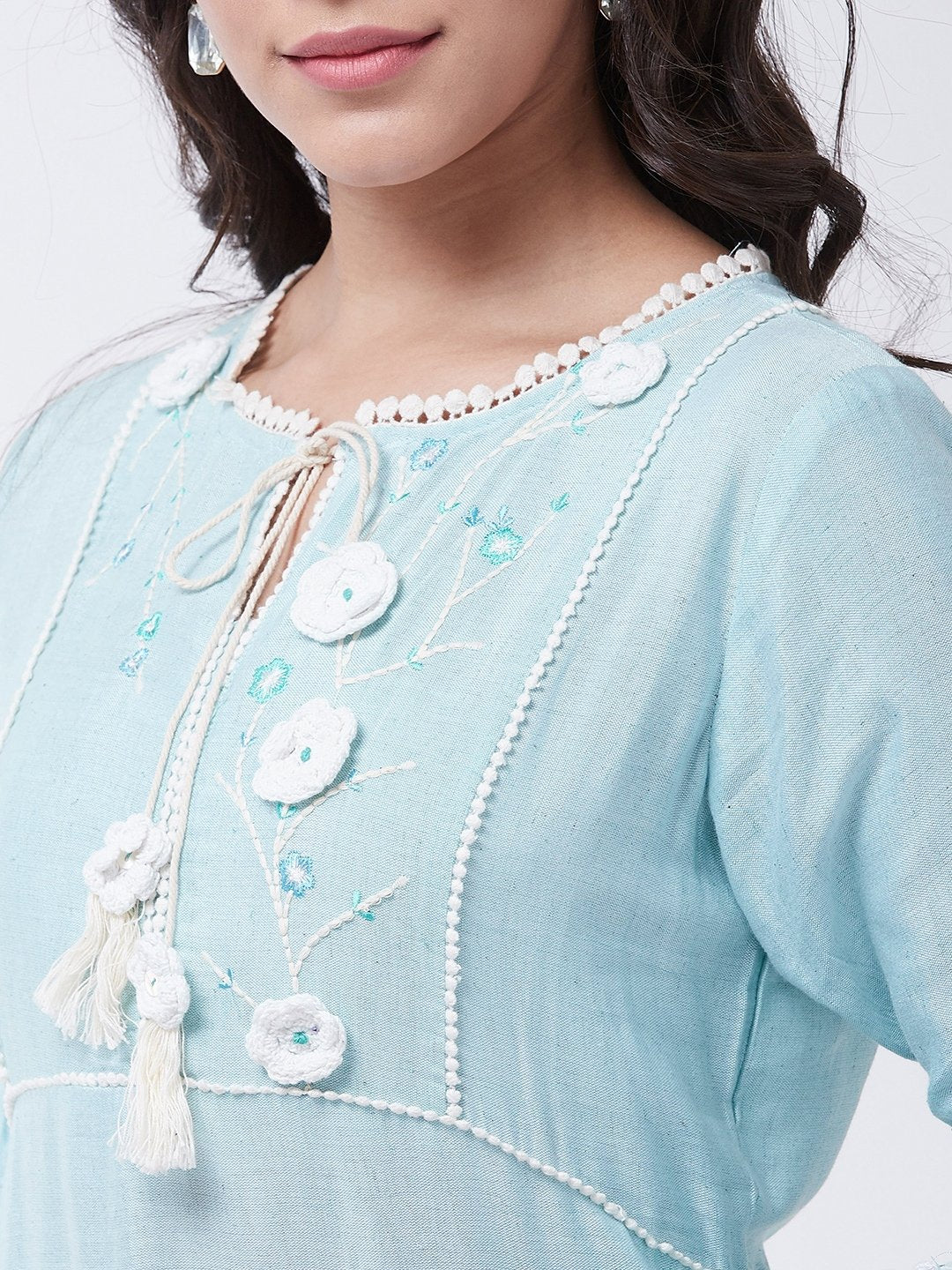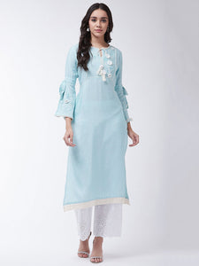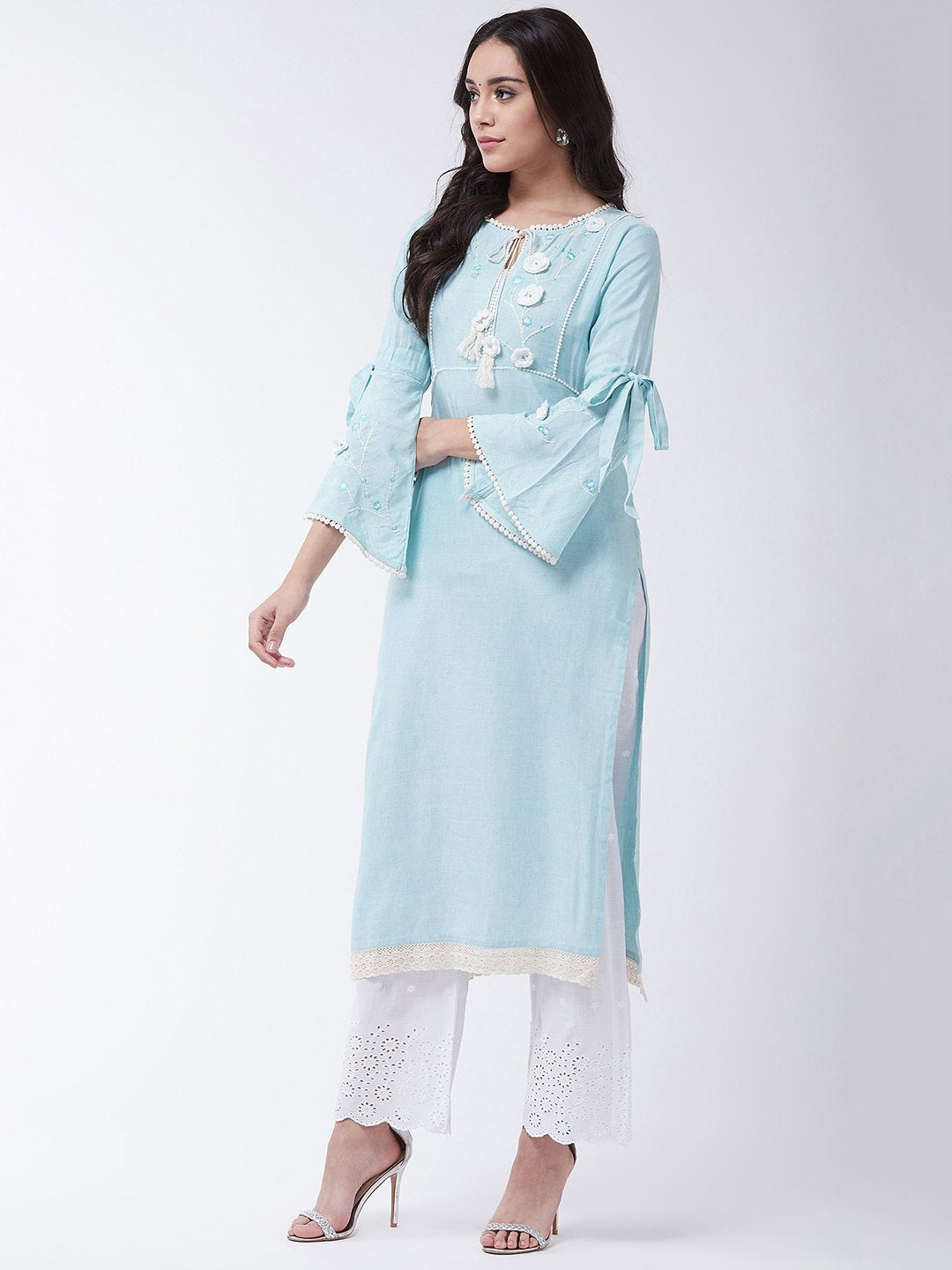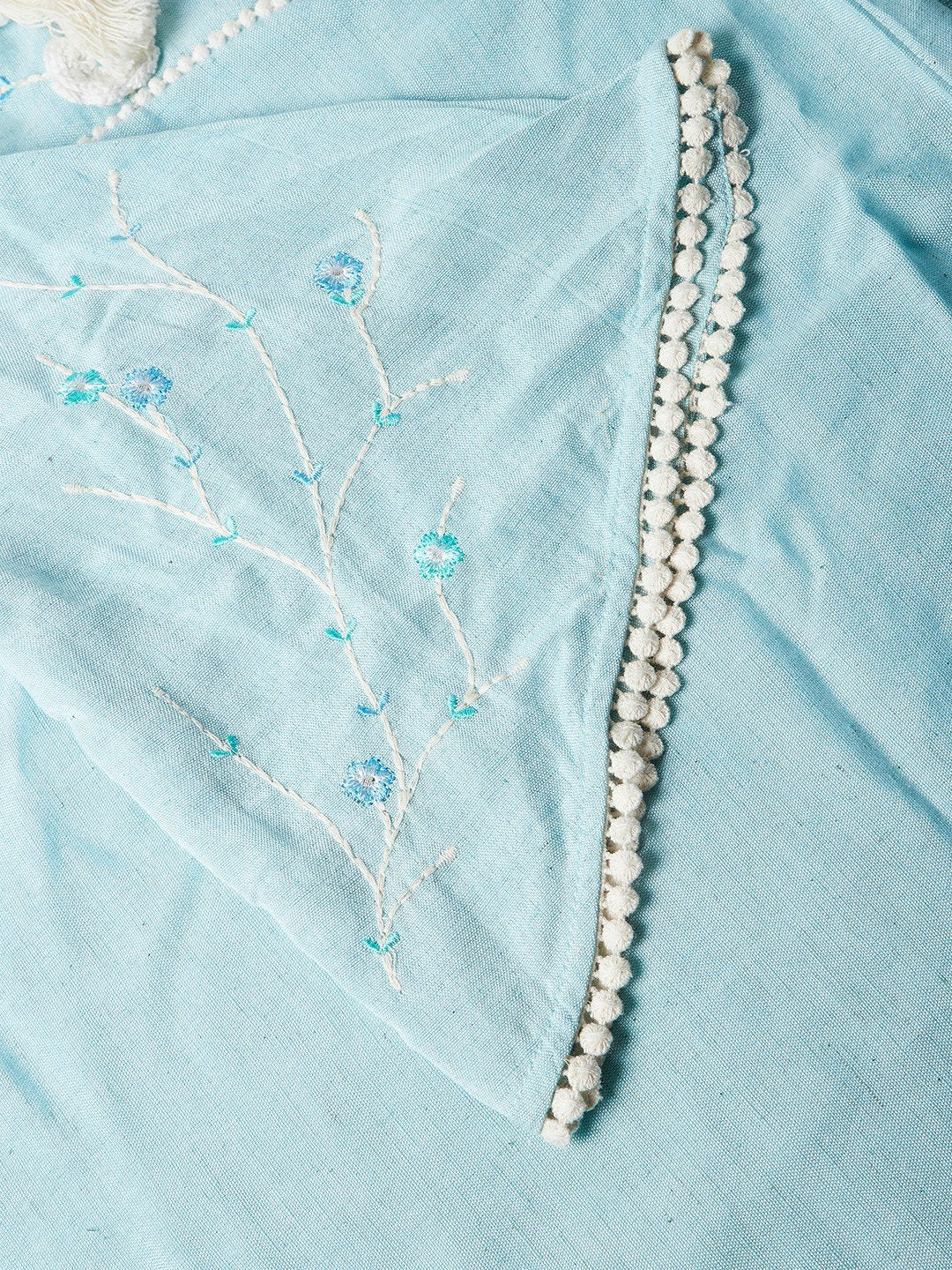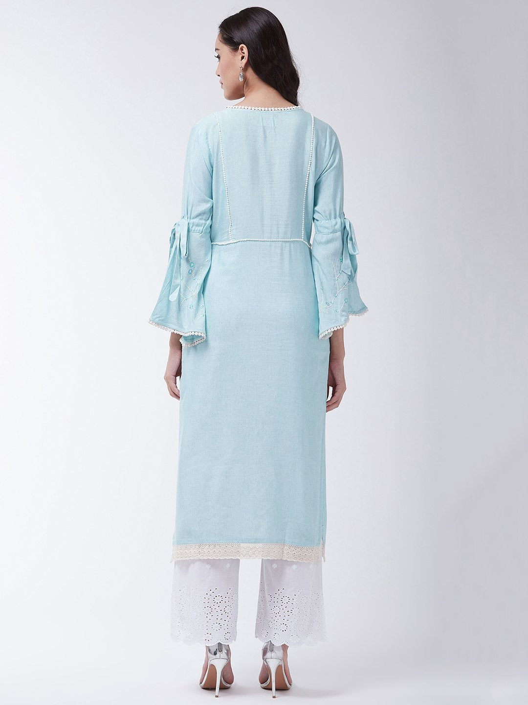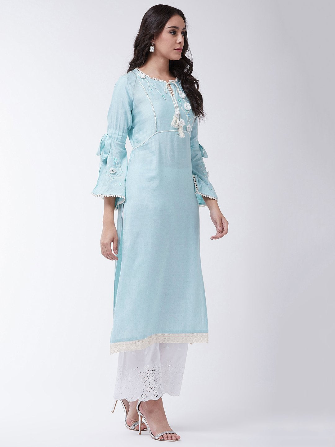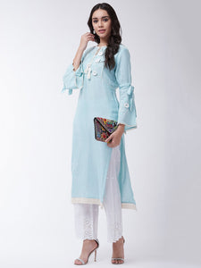 This chic sky blue Chikan work kurta and salwar set is the perfect blend of elegance and comfort. Accessorize this set with bronze bangles and heels for a pretty look.