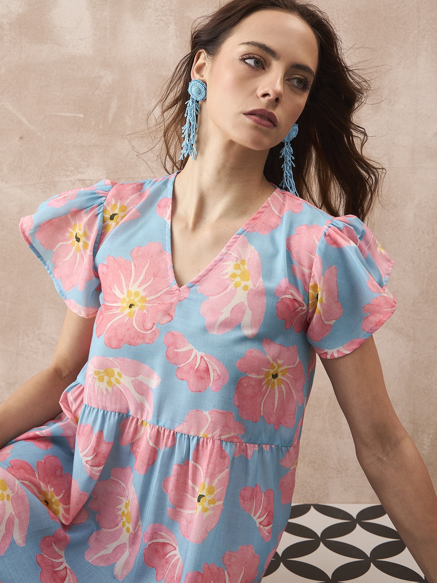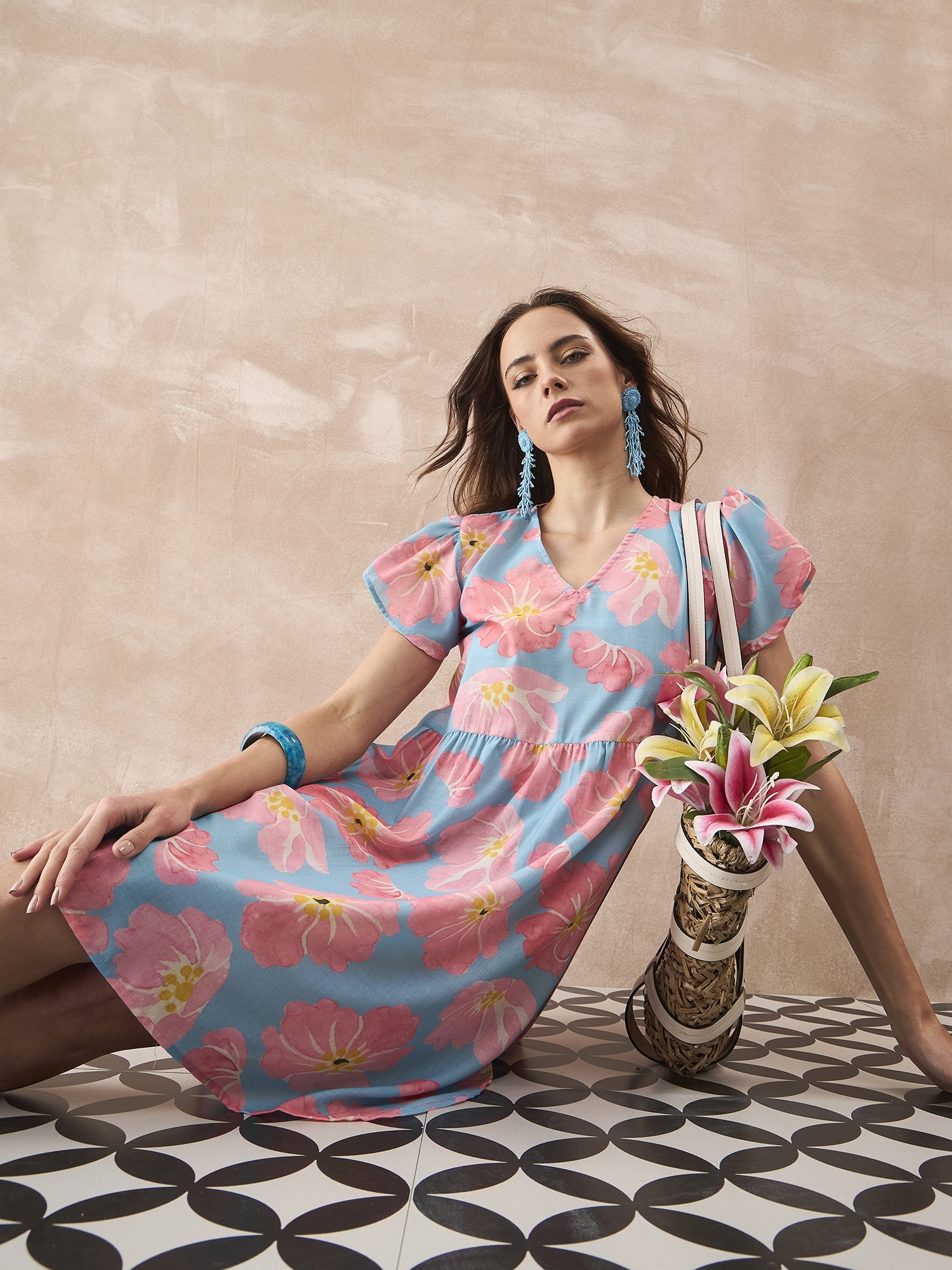 A soft, pastel-toned dress combining the calmness of sky blue and the warmth of peach. The V-neckline gives it a flattering fit, making it a perfect choice for a summer day or an outdoor event. Its light and airy feel adds to the overall feminine appeal.