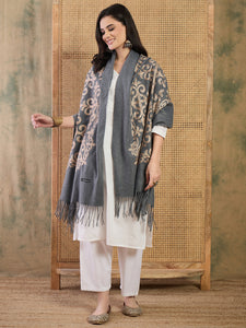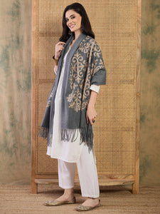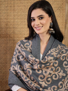 Intricate hand-done Aari embroidery flows across a calming stone-blue base, offering a refined accessory perfect for both festive occasions and everyday elegance.