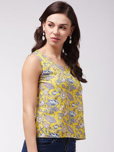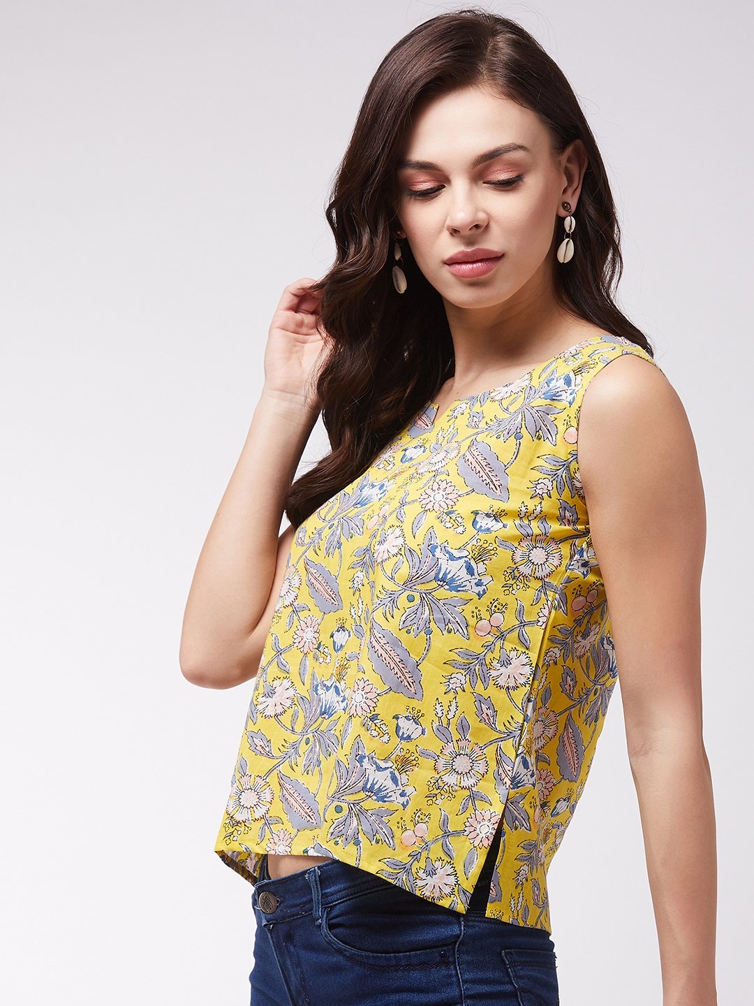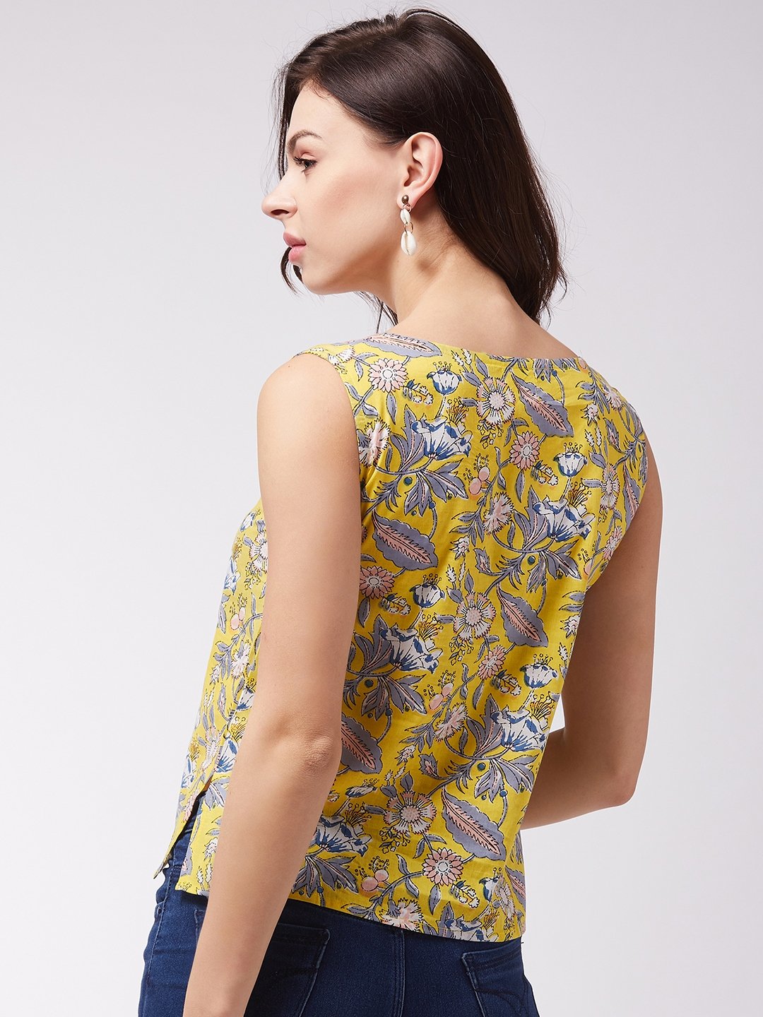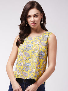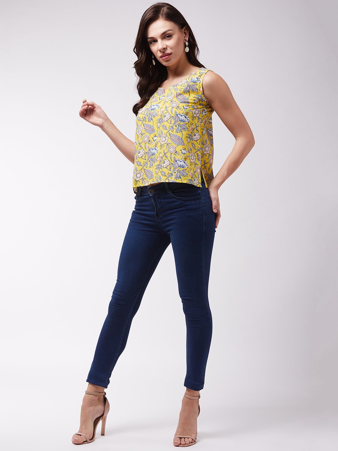 Relish every season with the season’s best sartorial pleasures like this summer yellow top. This sleeveless blouse showcases a sweetheart neckline.