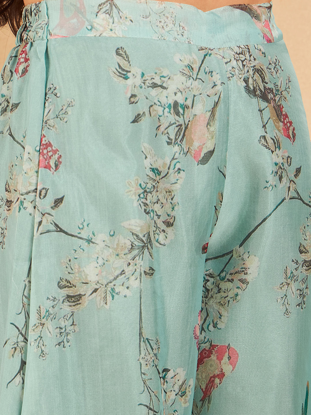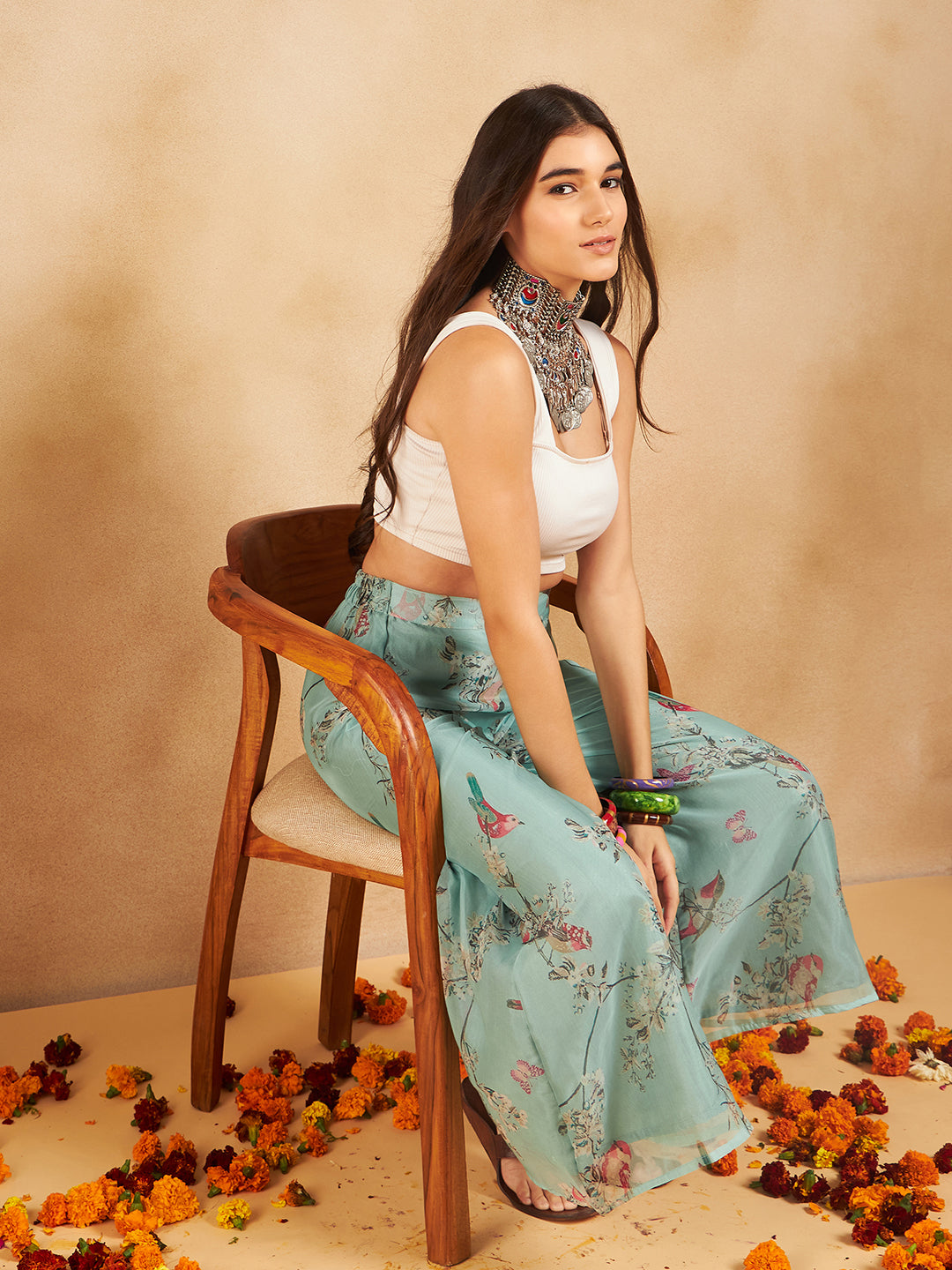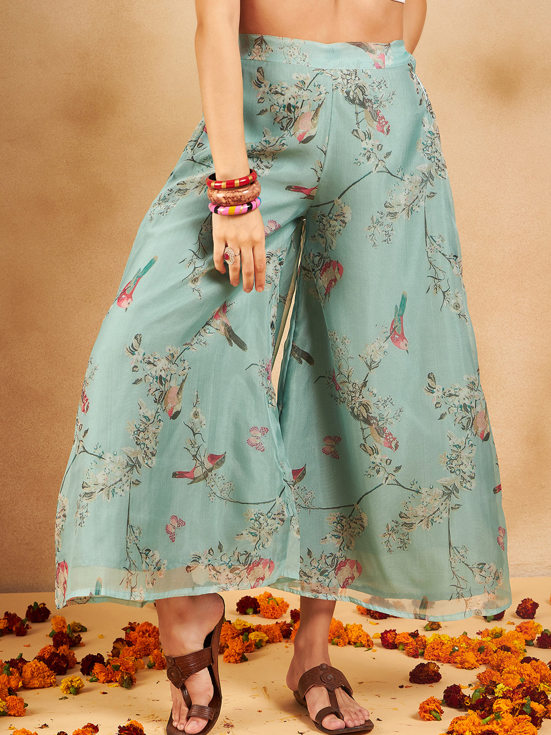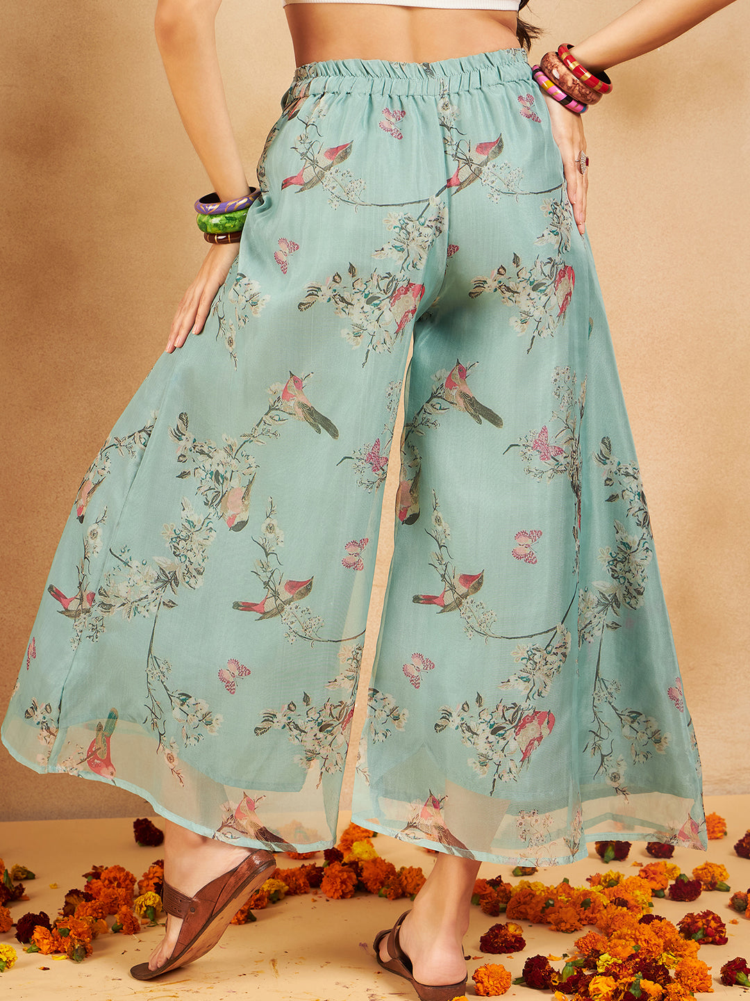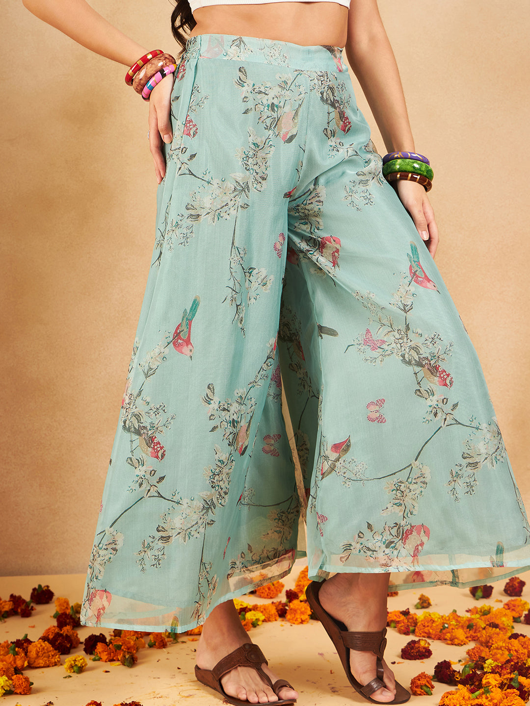 Thanks to the premium fabric and intricate designing, this pair Teal Printed Organza palazzos is high bet to stay in vogue. Complement these women palazzos with cap sleeves tops.