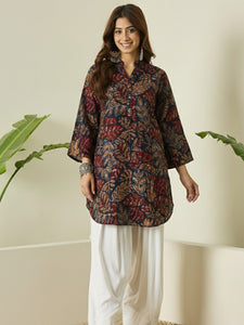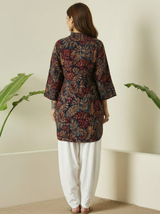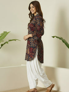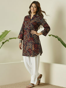 Teal and maroon leaf printed kurta styled with white salwar, offering a graceful silhouette, breathable fabric, and timeless ethnic appeal for festive and casual occasions.