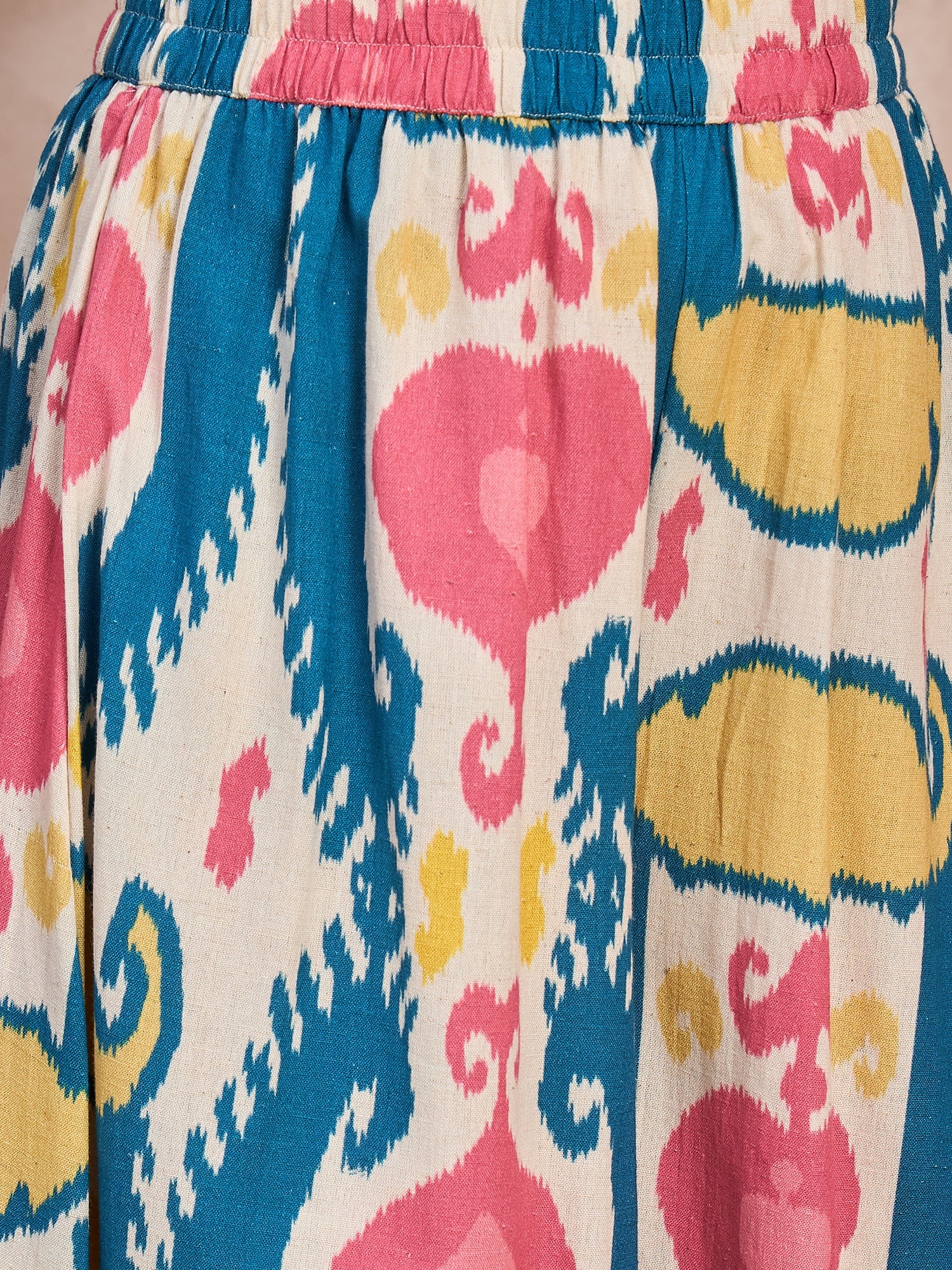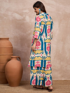 Teal Red Ikkat Print Mandarin Neck Kurta Set