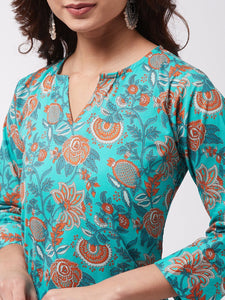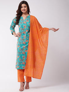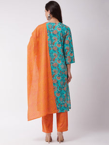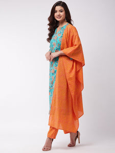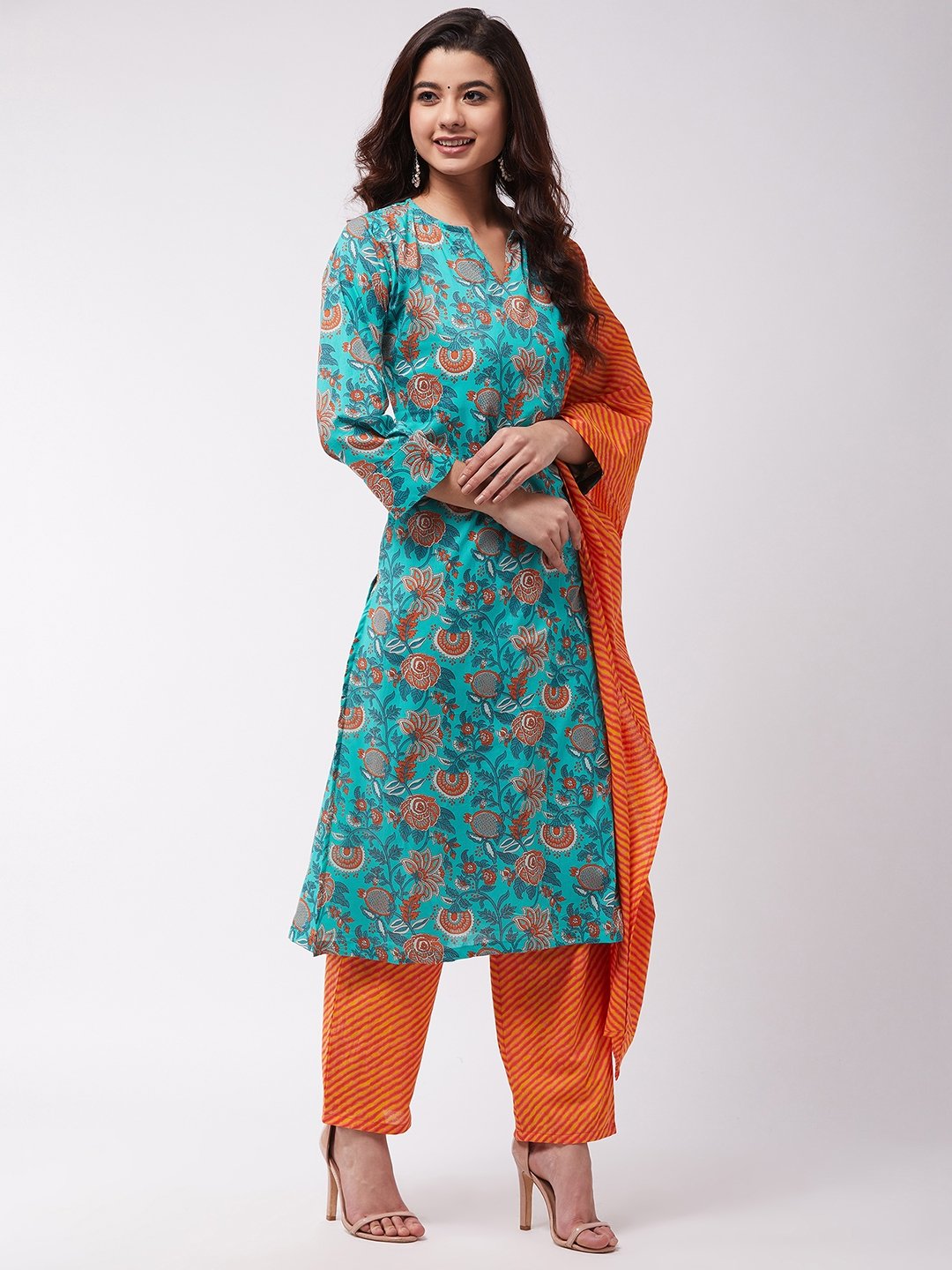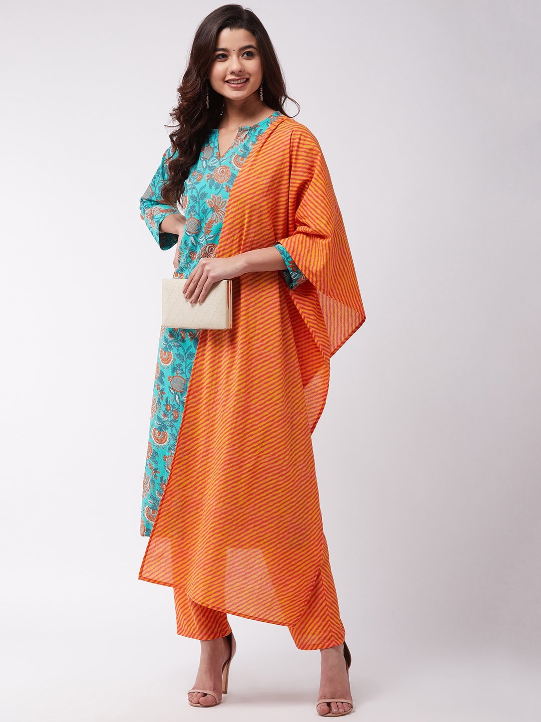 The time has come spruce up your class ethnic look. Check out this turquoise orange kurta and pants set and complete your look with pearl jewellery set.