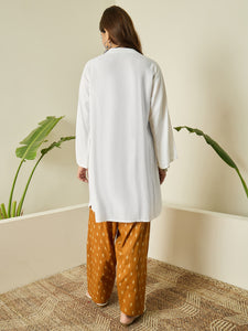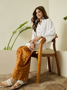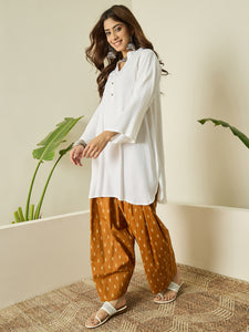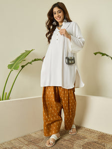 The lightweight fabric ensures comfort, while the earthy tone salwar complements the kurta beautifully. Ideal for office wear and casual outings.