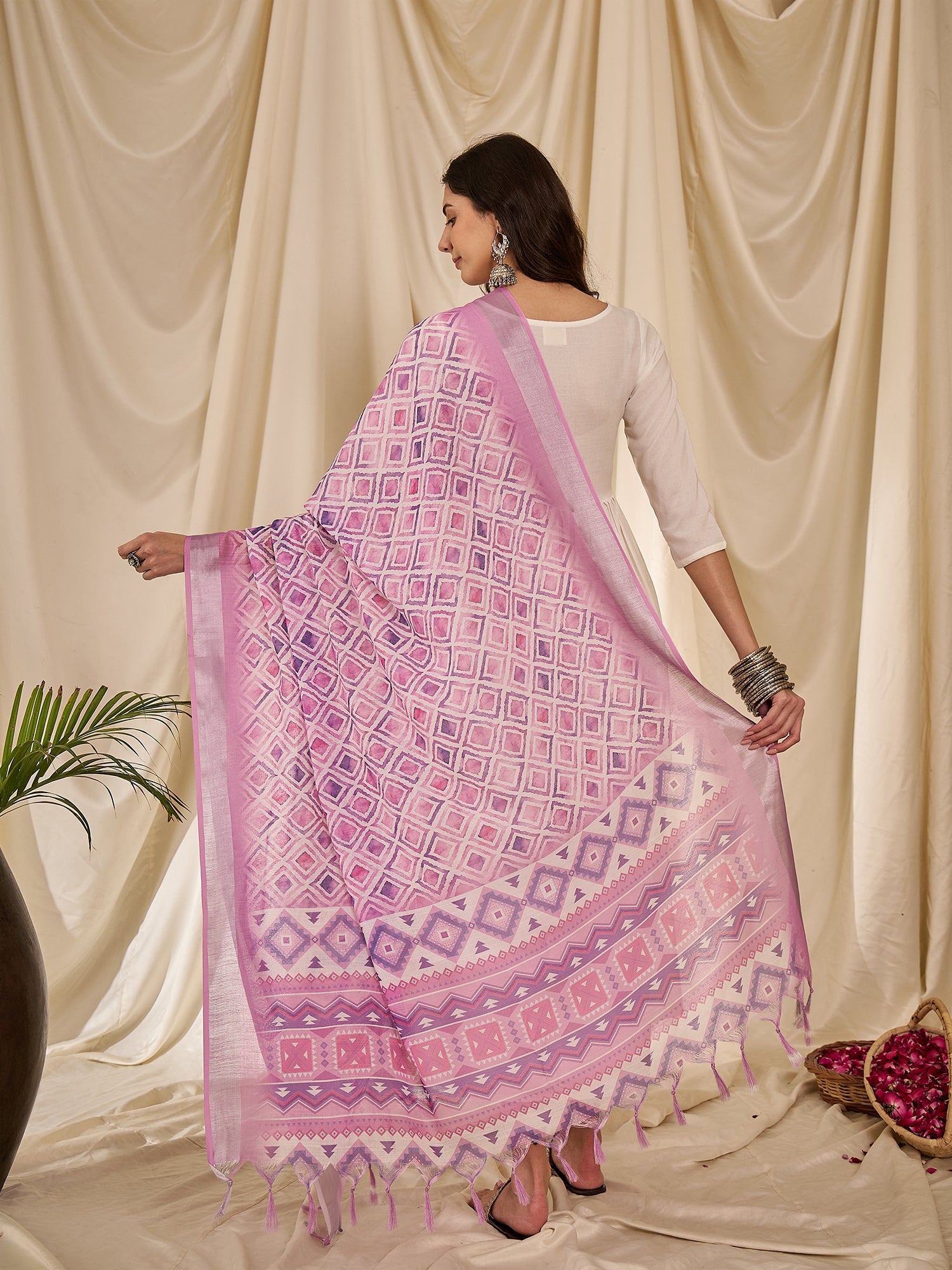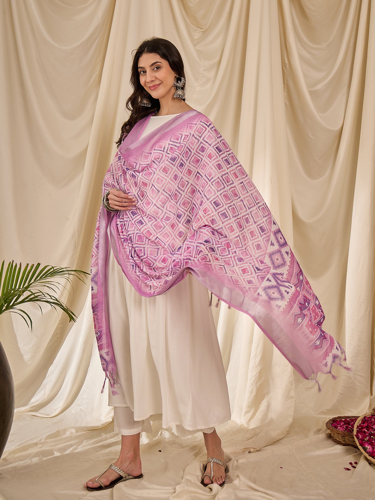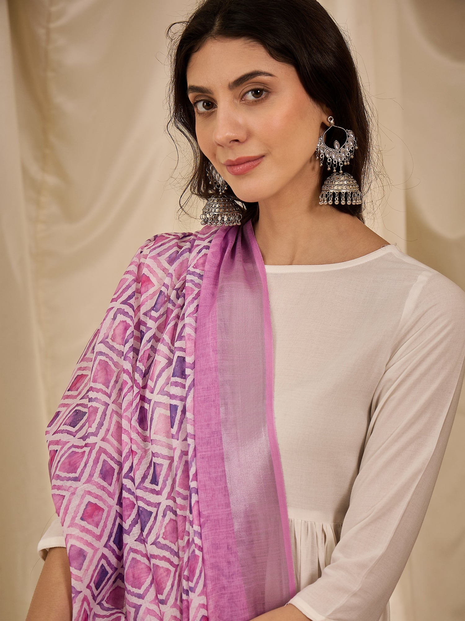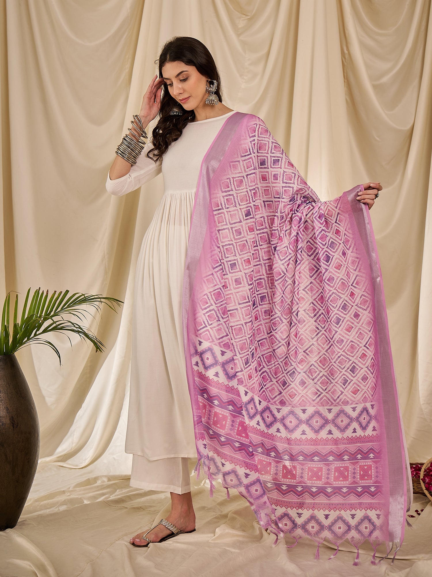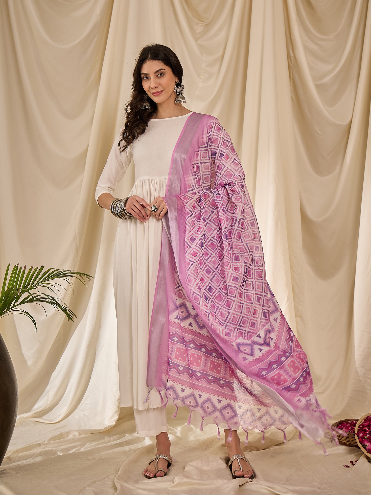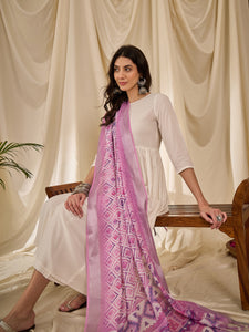 White Long Anarkali Lavender Ogee Dupatta Set
