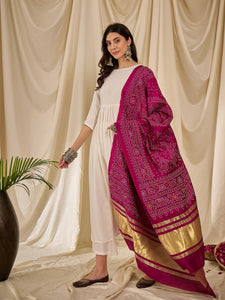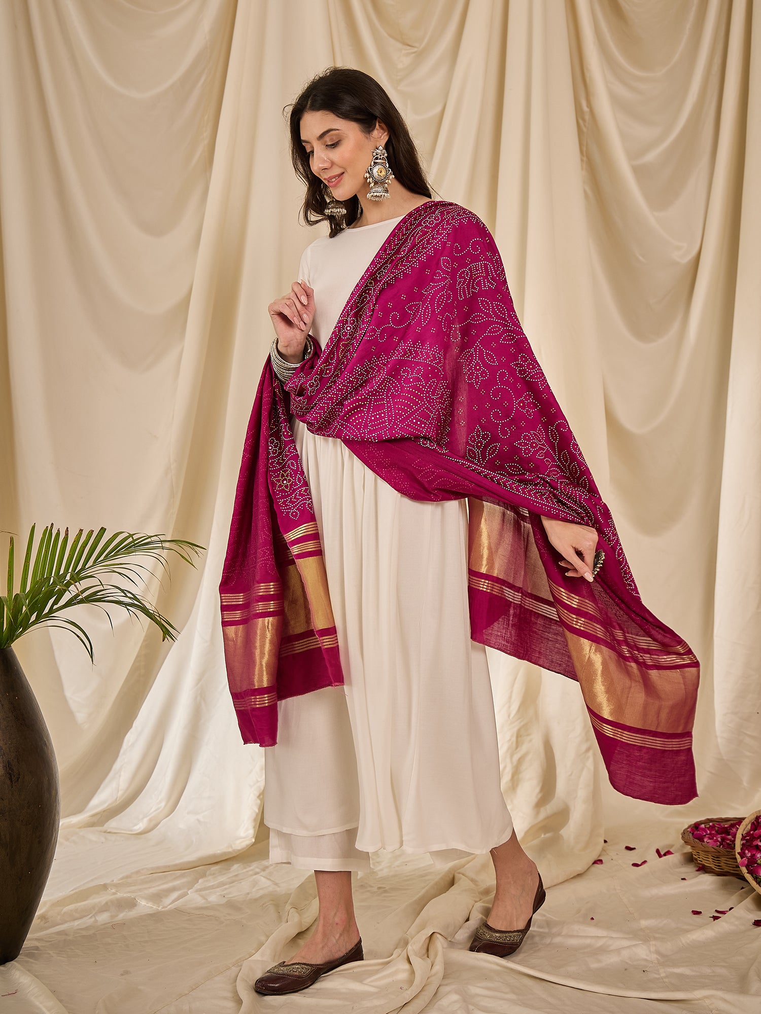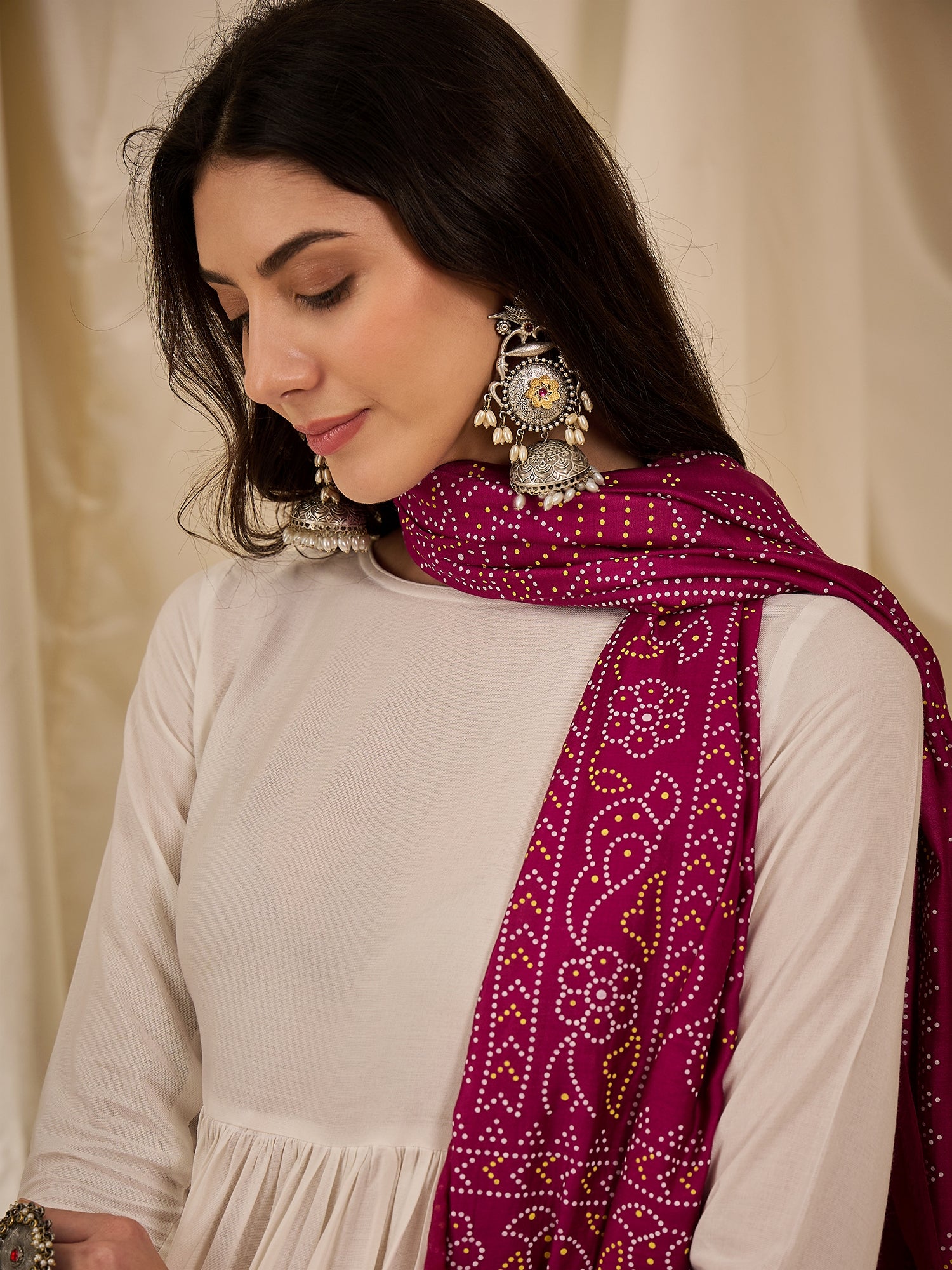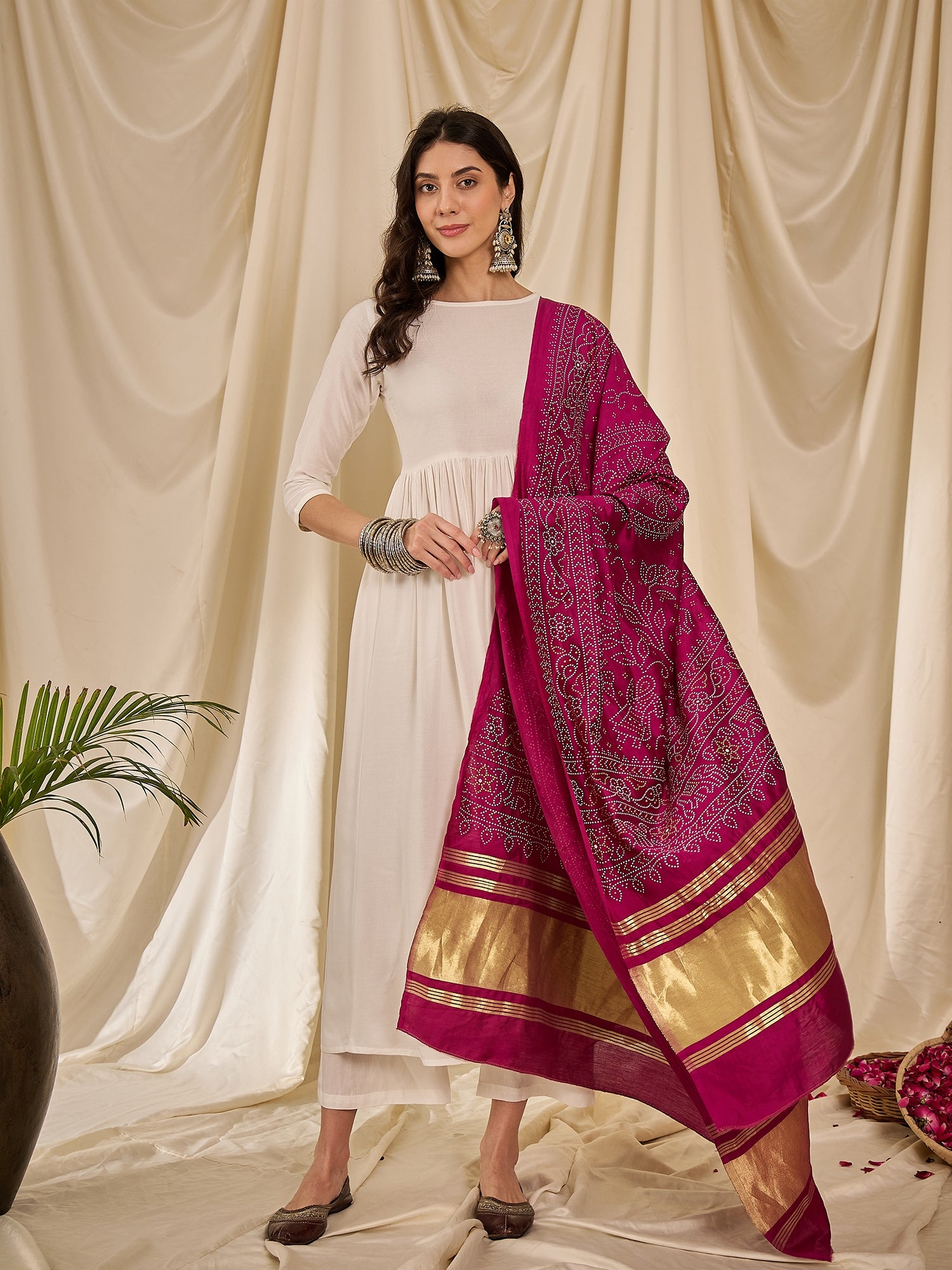 This elegant white Anarkali kurta set features intricate detailing and a flowing silhouette that exudes grace. Paired with a vibrant dupatta, this ensemble adds a pop of color, making it perfect for festive occasions or special gatherings.