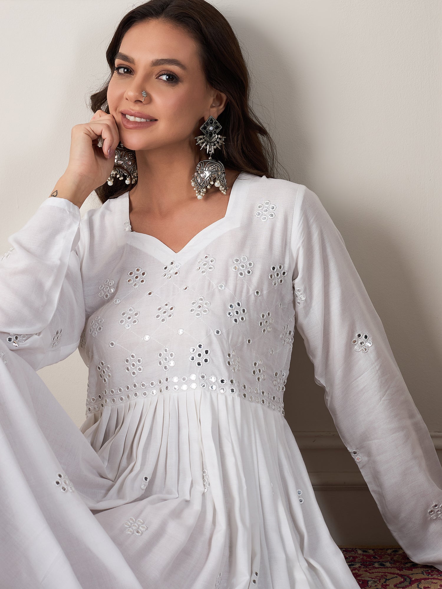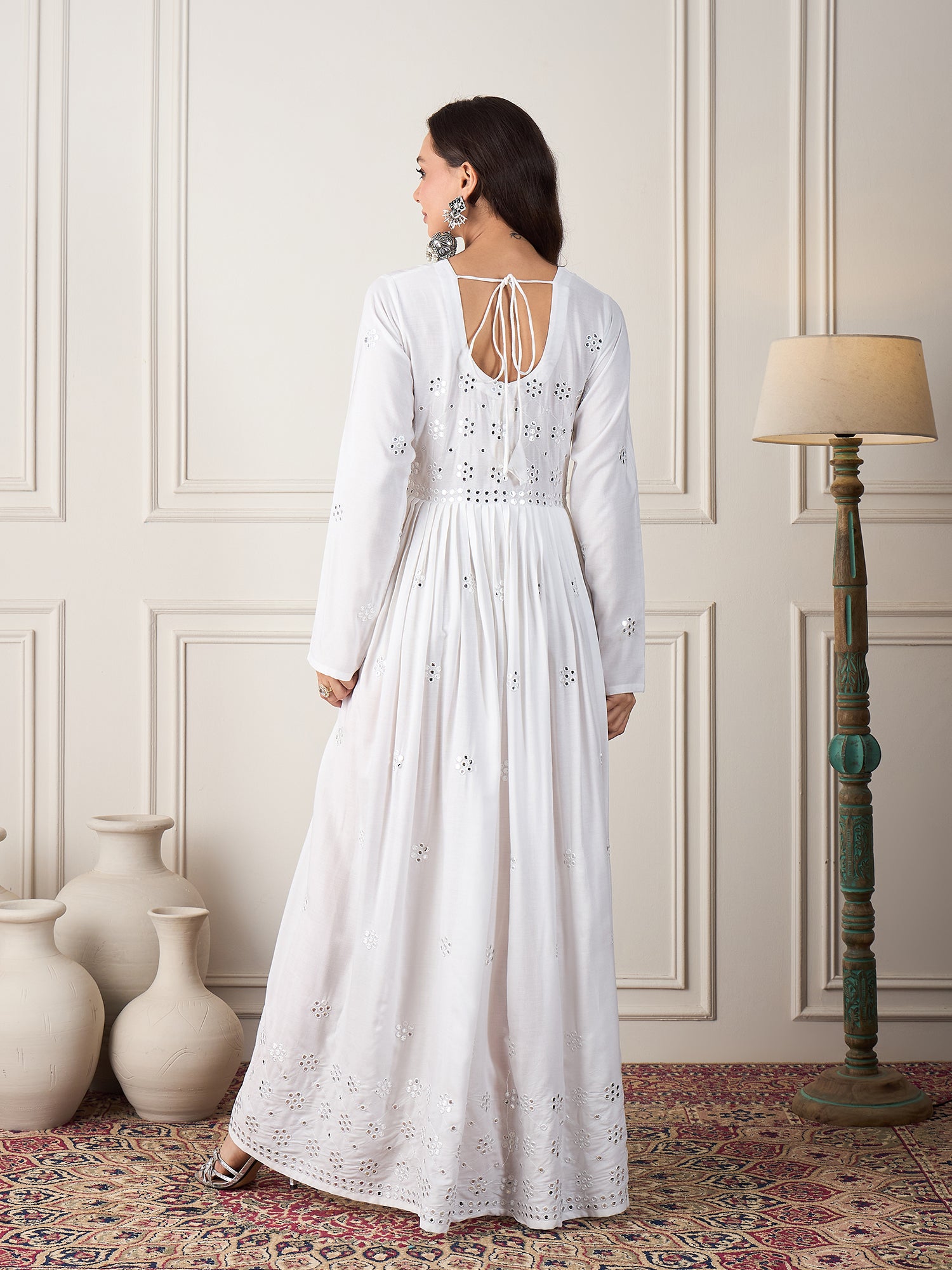 White Mirror Work Long Anarkali Kurta