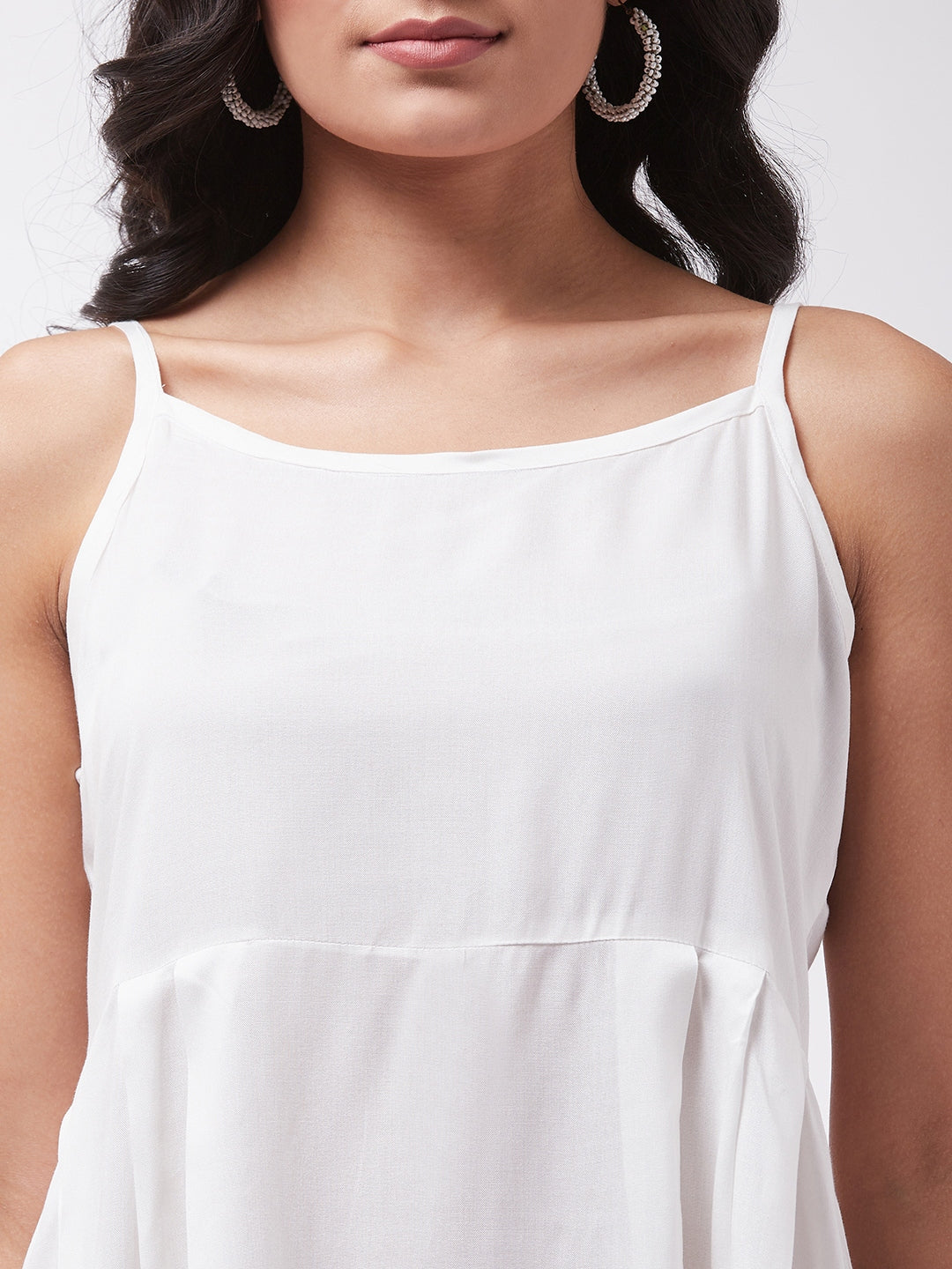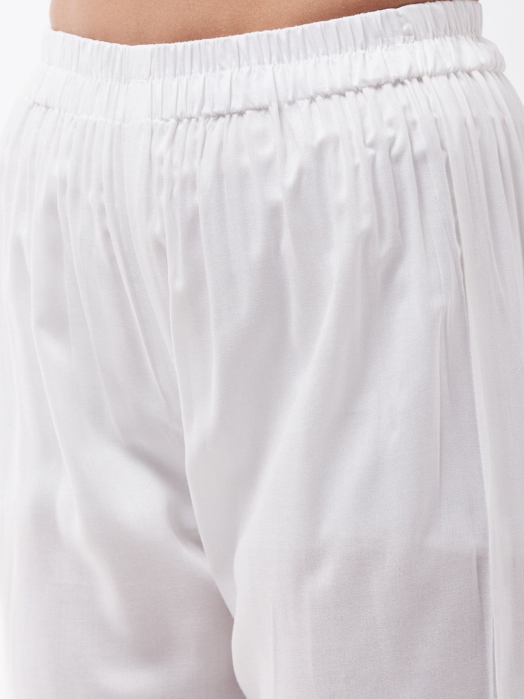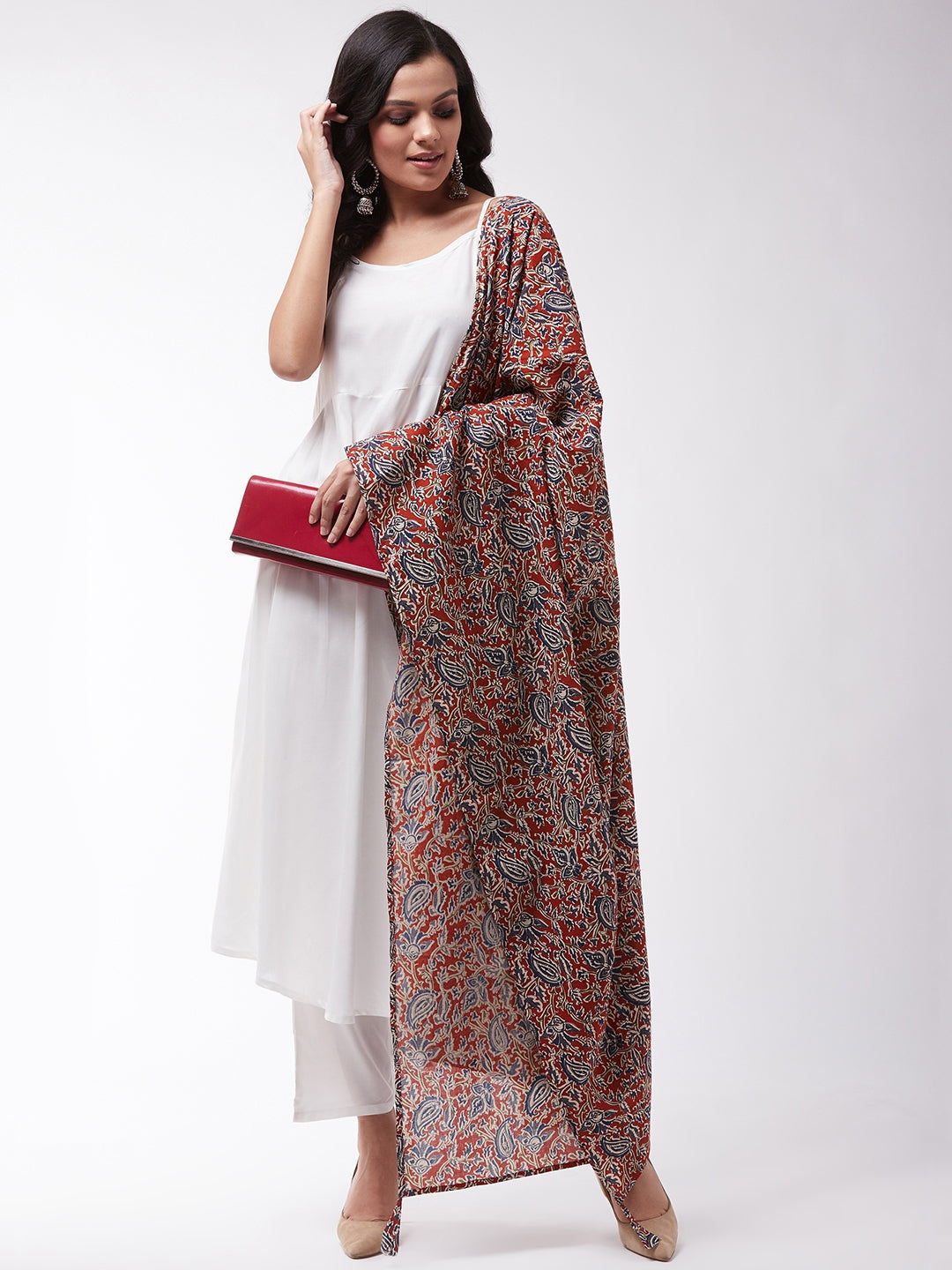 White solid Kurta with Trousers with Maroon kalamkari dupatta with dupatta, Anarkali shape, Empire style, Round neck, short shoulder straps, Calf length with flared hem, Viscose rayon machine weave fabric.