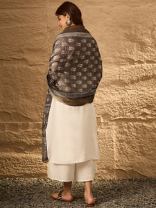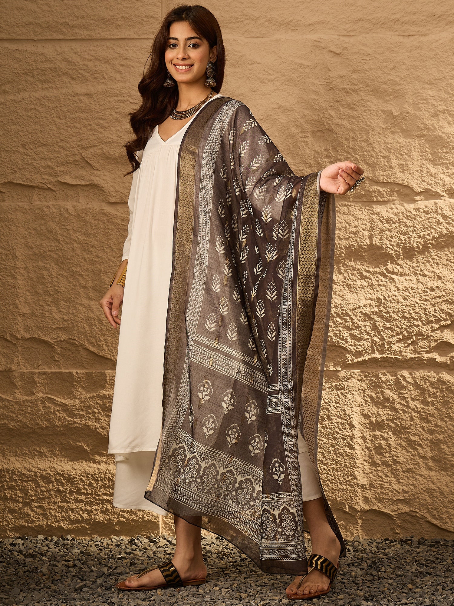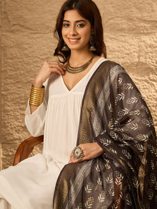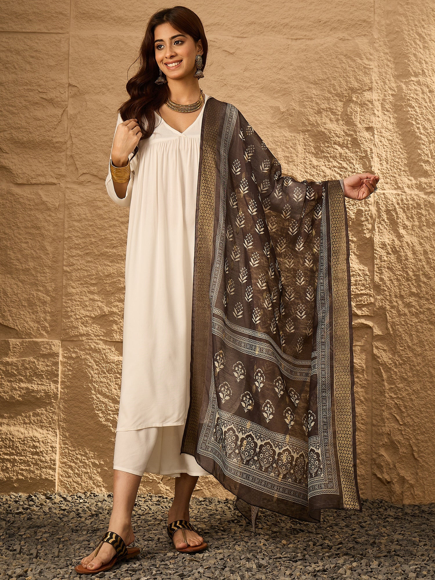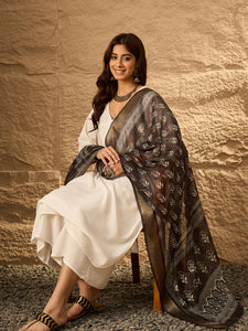 White V Neck Flared Black Beige Dupatta Kurta Set