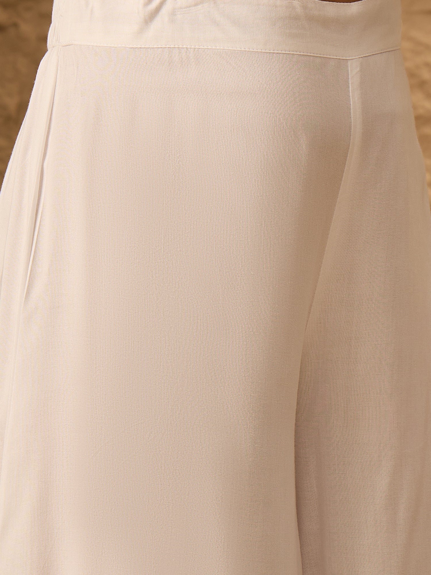 This set features a chic, V-neck white kurta with a modern Flared design, offering a fresh and airy look. Paired with a vibrant dupatta adorned with intricate traditional patterns, it adds a pop of color and cultural flair.