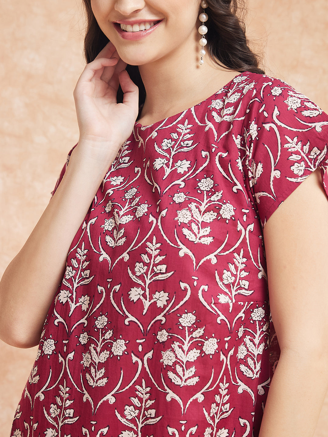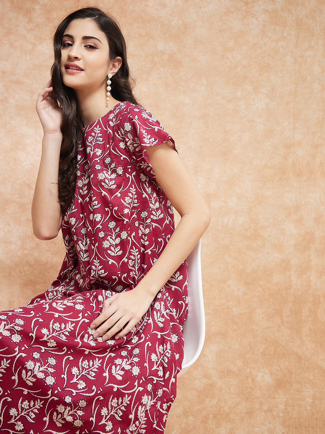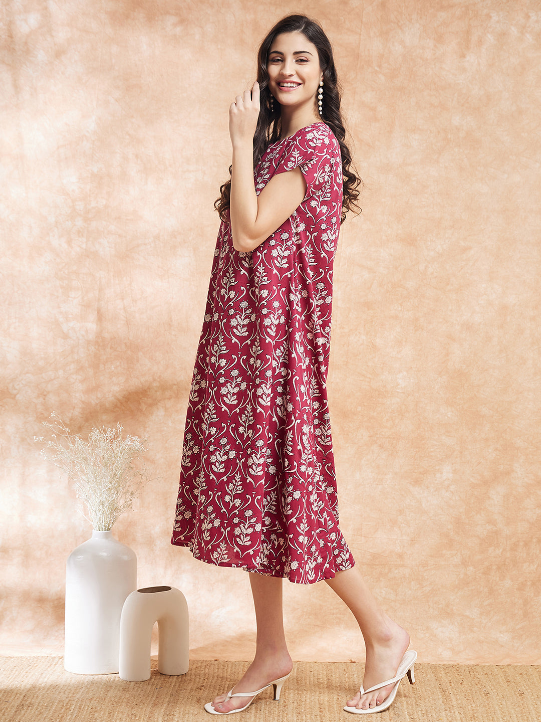 Placeholder Wine Cream Floral Print A Line Dress - InWeave